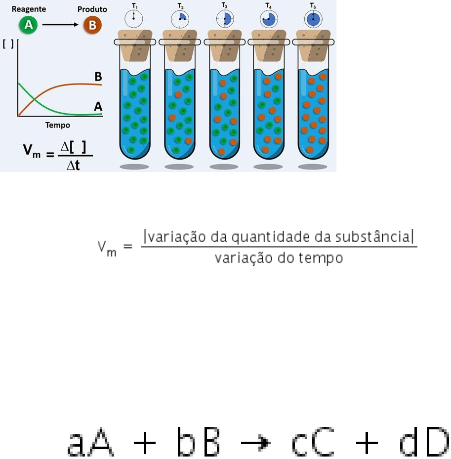 Cinética Química A cinética química estuda a velocidade das reações químicas e os fatores que alteram esta velocidade. Velocidade das Reações Químicas O que determina a rapidez com que ocorre uma reação química é o tempo em que os reagentes são consumidos para formar produtos. Assim, a velocidade de uma reação pode ser representada tanto pelo consumo de um reagente, quanto pela geração de um produto. Antes de acontecer a reação química, temos quantidade máxima de reagentes e nenhum produto. Quando um dos reagentes é totalmente consumido, formam-se os produtos e a reação termina. A Velocidade Média de uma reação química é a variação na quantidade de um reagente ou produto em um determinado intervalo de tempo. Quando calculamos a velocidade média, queremos saber a velocidade em que um reagente foi consumido ou a velocidade em que um produto foi formado. As unidades utilizadas no cálculo para expressar as substâncias produzidas ou consumidas podem ser, por exemplo, concentração, em mol/L, quantidade de matéria, em mol, e variação da pressão para gases, em atm. Já a variação do tempo pode ser dada em segundos (s), minutos (min) ou horas (h). Exemplo: uma reação química genérica pode ser representada pela equação: Onde, A e B são os reagentes C e D são os produtos a, b, c e d são os coeficientes da equação balanceada Portanto, a velocidade de consumo dos reagentes e de formação dos produtos podem ser expressas da seguinte forma: Consumo Formação Note que o símbolo [ ] refere-se à concentração, geralmente apresentada em mol/L. A taxa de desenvolvimento média de uma reação química leva em consideração, além do consumo ou formação dos produtos, os coeficientes da equação balanceada. Observe que os valores negativos indicam o consumo da substância e os valores positivos indicam que as substâncias estão surgindo. As reações químicas diferem na velocidade em que acontecem. Elas podem ser rápidas, moderadas ou lentas: · Reações rápidas ocorrem instantaneamente, com duração de microssegundos. Um exemplo é a queima do gás de cozinha. · Reações moderadas levam de minutos a horas para serem finalizadas. Um exemplo é a queima do papel. · Reações lentas podem durar séculos, porque os reagentes combinam-se lentamente. Um exemplo é a formação do petróleo. Teoria das Colisões A teoria das colisões é aplicada para reações gasosas. Ela determina que para a reação química acontecer os reagentes devem estar em contato, através de colisões. Entretanto, apenas isso não garante que a reação ocorra. Também é preciso que as colisões sejam efetivas (orientadas). Isso garantirá que as moléculas adquiram energia suficiente, a energia de ativação. Energia de ativação A energia de ativação (Ea) é a energia mínima necessária para que a formação do complexo ativado e, portanto, efetiva realização da reação. O complexo ativado é um estado transitório da reação, entre os reagentes, enquanto os produtos finais ainda não foram formados. As reações mais rápidas são aquelas que apresentam a menor energia de ativação. Um exemplo de energia de ativação no nosso dia a dia é a energia obtida pelo atrito para acender um fósforo. Fatores que Influenciam na Velocidade das Reações Os principais fatores que afetam a velocidade das reações são: Concentração de Reagentes Quando a concentração dos reagentes aumenta, a frequência de choques entre as moléculas também aumenta, acelerando a reação. Quanto maior a concentração dos reagentes, maior a velocidade da reação. Superfície de Contato Essa condição afeta apenas reações entre sólidos. A superfície de contato é a área de um reagente que fica exposta aos demais reagentes. Como as reações precisam de contato entre os reagentes, concluímos que: quanto maior a superfície de contato, maior a velocidade da reação. Pressão Essa condição afeta apenas reações com gases. Com o aumento da pressão, o espaço entre as moléculas diminui, fazendo com que tenham mais colisões, aumentando a velocidade da reação. Quanto maior a pressão, maior a velocidade da reação. Temperatura Temperatura é uma medida de energia cinética, que corresponde ao grau de agitação das partículas. Quando a temperatura é alta, as moléculas estão mais agitadas, aumentando a velocidade da reação. Quanto maior a temperatura, maior a velocidade da reação. Catalisadores O catalisador é uma substância capaz de acelerar uma reação química, sem ser consumido ao final da reação. As enzimas são catalisadores biológicos. A presença de um catalisador aumenta a velocidade da reação. Exemplo 1) Considere a reação de decomposição da água oxigenada: 2 H2O2(aq) → 2 H2O(l) + 1 O2 (g) Digamos que em 1 minuto se formaram 0,3 mol/L de H2O e 0,15 mol/L de O2, enquanto se decompôs 0,3 mol/L de H2O2, ou seja, temos que as velocidades médias de decomposição e de formação dessas substâncias da reação são de: VmH2O2 = 0,3 mol/L . min VmH2O = 0,3 mol/L . min VmO2 = 0,15 mol/L . min A velocidade média da reação global será encontrada ao pegar um desses valores e dividi-lo pelo respectivo coeficiente na equação: Vm = VmH2O2 = 0,3 mol/L . min = 0,15 mol/L . M 2 2 Vm = VmH2O = 0,3 mol/L . min = 0,15 mol/L . Min 2 2 Vm = VmO2 = 0,15 mol/L . min = 0,15 mol/L . Min 1 1 Note que os três valores são iguais, portanto, a velocidade da reação é a mesma em função de qualquer reagente ou produto, num mesmo intervalo de tempo. Porém, como se encontrou os valores das velocidades médias de cada uma das substâncias envolvidas nessas reações? Isso pode ser calculado dividindo-se a variação da concentração da substância (reagente ou produto) pelo intervalo de tempo. Se formos determinar a velocidade média de um dos reagentes da reação, teremos que colocar um sinal negativo antes, ou então considerar o valor da concentra