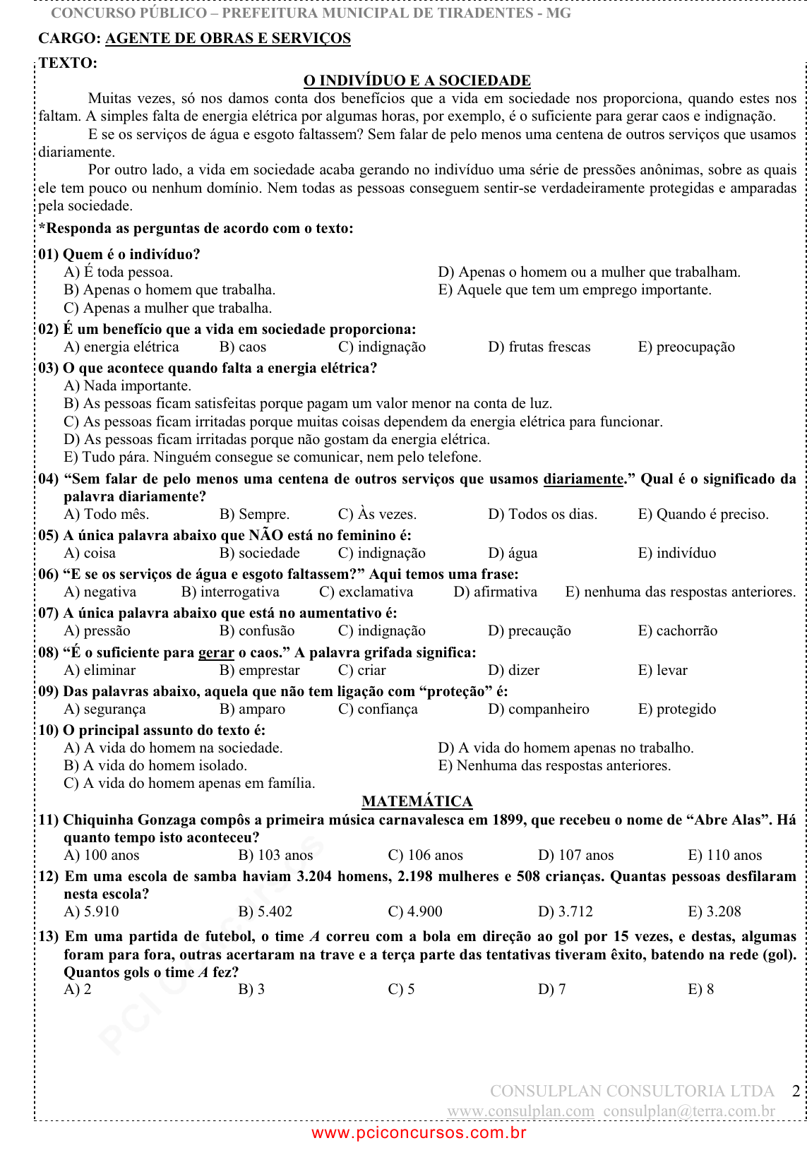 pcimarkpci MjgwNDowMjE0OjkwNjU6ZmNhMzozZDRmOjA1Mzg6MzhjMjo5YTQy:V2VkLCAwNSBGZWIgMjAyNSAwOToyNjozOSAtMDMwMA== www.pciconcursos.com.br CONCURSO PÚBLICO – PREFEITURA MUNICIPAL DE TIRADENTES - MG CONSULPLAN CONSULTORIA LTDA www.consulplan.com consulplan@terra.com.br 2 CARGO: AGENTE DE OBRAS E SERVIÇOS TEXTO: O INDIVÍDUO E A SOCIEDADE Muitas vezes, só nos damos conta dos benefícios que a vida em sociedade nos proporciona, quando estes nos faltam. A simples falta de energia elétrica por algumas horas, por exemplo, é o suficiente para gerar caos e indignação. E se os serviços de água e esgoto faltassem? Sem falar de pelo menos uma centena de outros serviços que usamos diariamente. Por outro lado, a vida em sociedade acaba gerando no indivíduo uma série de pressões anônimas, sobre as quais ele tem pouco ou nenhum domínio. Nem todas as pessoas conseguem sentir-se verdadeiramente protegidas e amparadas pela sociedade. *Responda as perguntas de acordo com o texto: 01) Quem é o indivíduo? A) É toda pessoa. D) Apenas o homem ou a mulher que trabalham. B) Apenas o homem que trabalha. E) Aquele que tem um emprego importante. C) Apenas a mulher que trabalha. 02) É um benefício que a vida em sociedade proporciona: A) energia elétrica B) caos C) indignação D) frutas frescas E) preocupação 03) O que acontece quando falta a energia elétrica? A) Nada importante. B) As pessoas ficam satisfeitas porque pagam um valor menor na conta de luz. C) As pessoas ficam irritadas porque muitas coisas dependem da energia elétrica para funcionar. D) As pessoas ficam irritadas porque não gostam da energia elétrica. E) Tudo pára. Ninguém consegue se comunicar, nem pelo telefone. 04) “Sem falar de pelo menos uma centena de outros serviços que usamos diariamente.” Qual é o significado da palavra diariamente? A) Todo mês. B) Sempre. C) Às vezes. D) Todos os dias. E) Quando é preciso. 05) A única palavra abaixo que NÃO está no feminino é: A) coisa B) sociedade C) indignação D) água E) indivíduo 06) “E se os serviços de água e esgoto faltassem?” Aqui temos uma frase: A) negativa B) interrogativa C) exclamativa D) afirmativa E) nenhuma das respostas anteriores. 07) A única palavra abaixo que está no aumentativo é: A) pressão B) confusão C) indignação D) precaução E) cachorrão 08) “É o suficiente para gerar o caos.” A palavra grifada significa: A) eliminar B) emprestar C) criar D) dizer E) levar 09) Das palavras abaixo, aquela que não tem ligação com “proteção” é: A) segurança B) amparo C) confiança D) companheiro E) protegido 10) O principal assunto do texto é: A) A vida do homem na sociedade. D) A vida do homem apenas no trabalho. B) A vida do homem isolado. E) Nenhuma das respostas anteriores. C) A vida do homem apenas em família. MATEMÁTICA 11) Chiquinha Gonzaga compôs a primeira música carnavalesca em 1899, que recebeu o nome de “Abre Alas”. Há quanto tempo isto aconteceu? A) 100 anos B) 103 anos C) 106 anos D) 107 anos E) 110 anos 12) Em uma escola de samba haviam 3.204 homens, 2.198 mulheres e 508 crianças. Quantas pessoas desfilaram nesta escola? A) 5.910 B) 5.402 C) 4.900 D) 3.712 E) 3.208 13) Em uma partida de futebol, o time A correu com a bola em direção ao gol por 15 vezes, e destas, algumas foram para fora, outras acertaram na trave e a terça parte das tentativas tiveram êxito, batendo na rede (gol). Quantos gols o time A fez? A) 2 B) 3 C) 5 D) 7 E) 8 www.pciconcursos.com.br pcimarkpci MjgwNDowMjE0OjkwNjU6ZmNhMzozZDRmOjA1Mzg6MzhjMjo5YTQy:V2VkLCAwNSBGZWIgMjAyNSAwOToyNjozOSAtMDMwMA== www.pciconcursos.com.br CONCURSO PÚBLICO – PREFEITURA MUNICIPAL DE TIRADENTES - MG CONSULPLAN CONSULTORIA LTDA www.consulplan.com consulplan@terra.com.br 3 * Analise as vendas de Sr. Pedro e responda as questões de número 14 a 16: O Sr. Pedro é jornaleiro na capital do Estado. Ele anota as vendas semanais, e esta semana registrou as seguintes vendas: Dias da semana Revistas Gibis Jornais Domingo 475 830 5.675 Segunda-feira 301 700 1.851 Terça-feira 240 600 1.632 Quarta-feira 193 423 1.424 Quinta-feira 154 371 1.374 Sexta-feira 172 209 1.295 Sábado 365 817 4.879 14) Qual o dia da semana que Sr. Pedro vendeu menos Gibis? A) Segunda-feira B) Quinta-feira C) Sexta-feira D) Sábado E) Domingo 15) Qual o dia da semana que foi vendido mais jornais? A) Segunda-feira B) Quinta-feira C) Sexta-feira D) Sábado E) Domingo 16) Qual o total de revistas vendidas no sábado e domingo? A) 880 B) 840 C) 776 D) 537 E) 493 17) Sabendo que 1 hora tem 60 minutos, quantos minutos têm em 2horas e 15 minutos? A) 140 minutos B) 135 minutos C) 120 minutos D) 75 minutos E) 15 minutos 18) Na estréia do circo “Alegria”, o ingresso infantil custará R$ 3,00 e o de Adulto R$ 5,00. Se nesta estréia comparecer 175 crianças, quantos reais o circo arrecadará somente com os ingressos infantis? A) R$ 875,00 B) R$ 785,00 C) R$ 691,00 D) R$ 525,00 E) R$ 400,00 19) Uma montadora de carros recebeu 982 rodas de carros. Com esta entrega, quantos carros completos serão montados? A) 245 B) 240 C) 232 D) 212 E) 196 20) Dona Carmem, em uma loja de tecidos, gastou R$ 29,78. Se ela pagar com uma nota de R$ 50,00, qual o troco que Dona Carmem receberá? A) R$ 30,22 B) R$ 28,28 C) R$ 24,22 D) R$ 22,22 E) R$ 20,22 CONHECIMENTOS ESPECÍFICOS 21) Como funcionário público você estará sempre em contato com pessoas. Por isto todo profissional deve: A) Cooperar só com os colegas mais próximos. B) Higiene e apresentação pessoal só para quem tem salário alto. C) Regulamentos só para os novatos. D) Ser autoritário para ser respeitado. E) Ser educado e cordial. 22) Para prevenir problemas de saúde é conveniente usar: A) Sapatos com sola mais alta. D) Rodos e vassouras que não forcem sua postura corporal. B) Luvas de plástico finas. E) Carrinhos de mão para levar lixo da sala para a calçada. C) Chinelo de dedo para lavar áreas externas. 23) A propagação de mosquitos 