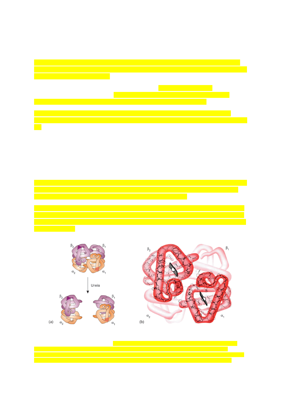 2APG 10 - HEMOGLOBINA ★ Estrutura da hemoglobina A hemoglobina predominante (mais de 95% do total) nos seres humanos adultos (HbA) é formada por quatro cadeias polipeptídicas, duas α (com 141 aminoácidos) (α1 e α2) e duas β (com 146 aminoácidos) (β1 e β2). Apresentam a maior extensão da cadeia formada por segmentos em α-hélice, conectados por regiões sem estrutura regular. As hélices recebem letras -e os seus aminoácidos constituintes, números; por exemplo, F8 é o oitavo aminoácido da hélice F. Na estrutura quaternária da hemoglobina, as ligações não covalentes são muito mais numerosas entre subunidades diferentes — α/β — do que entre subunidades iguais — α/α e β/β. O resultado desta associação desigual é uma molécula tetramérica composta pela união de dois dímeros, α1β1 e α2β2. O contato entre os dois dímeros é estabelecido nas interfaces designadas α1β2 e α2β1. .Estas interfaces sofrem modificações importantes na oxigenação e desoxigenação da hemoglobina. ★ Ligação do oxigênio à hemoglobina A hemoglobina é uma hemoproteína: cada uma de suas cadeias está associada a um grupo prostético heme. O heme é uma molécula de porfirina contendo um íon de ferro, que, na mioglobina e na hemoglobina, permanece no estado ferroso, Fe2+. As porfirinas consistem em um anel plano, resultante da fusão de quatro núcleos pirrólicos, com substituintes variáveis, que caracterizam seus subtipos; na hemoglobina é encontrado o isômero denominado protoporfirina IX1. O heme confere à hemoglobina, e ao sangue, sua cor característica. Estrutura quaternária da hemoglobina. a) A associação entre subunidades diferentes é mais forte que entre subunidades iguais: quando a hemoglobina é suspensa em solução concentrada de ureia, o tetrâmero dissocia-se em dímeros αβ; os grupos heme não estão mostrados. b) Esquema enfocando as áreas de contato entre os dímeros, com a interface α1β2 à frente; cada grupo heme fica alojado em um bolsão hidrofóbico. O grupo heme localiza-se dentro de uma cavidade hidrofóbica, delimitada sobretudo por aminoácidos apolares, que estabelecem interações hidrofóbicas com o anel porfirínico. Este ambiente apolar torna possível a ligação do oxigênio ao ferro (Fe2+), sem que ele seja oxidado ao estado férrico (Fe3+). O íon de ferro fica no centro do grupo heme, formando seis ligações: com os quatro átomos de nitrogênio do anel porfirínico, com a cadeia polipeptídica — em um resíduo de histidina, a His F8, chamada de histidina proximal — e pode, ainda, ligar-se reversivelmente a uma molécula de oxigênio (O2). As duas últimas ligações são perpendiculares ao plano do anel e situam-se em lados opostos do plano do heme. Ao sítio de ligação do ferro com oxigênio podem ligar-se outras moléculas pequenas, como CO e H2S, com afinidade ainda maior que o oxigênio, o que explica sua alta toxicidade para organismos aeróbios. Estrutura do grupo heme (protoporfirina IX e um íon de ferro) da oxi-hemoglobina. a) O íon Fe2+ liga-se aos átomos de nitrogênio dos núcleos pirrólicos (numerados de I a IV) do anel porfirínico (em preto, com as cadeias laterais em azul), à molécula de oxigênio e ao grupo imidazólico da histidina proximal (His F8). b) Representação tridimensional do heme e das ligações do Fe2+. Uma molécula de hemoglobina totalmente oxigenada contém quatro moléculas de O2 e é denominada oxi-hemoblobina (oxi-Hb ou HbO2), em contraposição à forma desprovida de oxigênio, chamada desoxi-hemoglobina (desoxi-Hb ou Hb). A ligação do oxigênio ao grupo heme altera a cor da hemoglobina, que passa de azulada (sangue venoso) a vermelha (sangue arterial). A ligação com oxigênio desencadeia alterações na conformação da hemoglobina As hemoglobinas oxigenada e desoxigenada têm estruturas tão diferentes, que apresentam formas cristalinas distintas. A oxigenação da hemoglobina determina alterações estruturais sequenciais. Na desoxi-Hb, os íons de ferro estão situados fora do plano do grupo heme e o anel porfirínico é ligeiramente côncavo. Quando o oxigênio se liga ao heme de uma das subunidades, o ferro se desloca para o plano do anel, que se torna mais achatado, arrastando a His 87 à qual está ligado e, consequentemente, o próprio segmento da cadeia polipeptídica que contém este aminoácido. A movimentação deste segmento desloca um segmento contíguo, segmentos estes que compõem as interfaces α1β2 e α2β1 entre os dímeros, provocando o rompimento de várias ligações não covalentes. Há uma alteração da disposição relativa dos dímeros, que resulta em estreitamento do bolsão entre as subunidades β. Deste modo, o pequeno deslocamento do ferro (cerca de 0,5 Å), causado pela ligação do oxigênio ao grupo heme de uma subunidade, dispara uma sequência de eventos mecanicamente transmitidos, que alteram a estrutura quaternária da hemoglobina. A ligação do oxigênio ao Fe2+ do grupo heme provoca o deslocamento do ferro para o plano do anel porfirínico, que se torna mais achatado, deslocando a histidina proximal e iniciando uma série de alterações estruturais na hemoglobina. (Adaptada de Berg, J. M.; Tymoczko, J. L. & Stryer, L.: Biochemistry, 5th edition. Freeman and Company, 2002.) Estrutura tridimensional da desoxi-Hb (a) e oxi-Hb (b), com as cadeias β em primeiro plano. Na transformação desoxi-Hb → oxi-Hb, há movimentação de um dímero em relação ao outro, simbolizada pelas setas largas cinza sobre a molécula de oxi-Hb e evidenciada pela mudança na posição relativa de alguns aminoácidos; ocorre, ainda, um estreitamento da cavidade central entre as cadeias β, indicado pelas setas finas pretas. A hemoglobina liga-se ao oxigênio cooperativamente A ligação do oxigênio implica rearranjos moleculares sucessivos, já que a mudança de conformação de uma subunidade acarreta alteração das outras. Estes movim