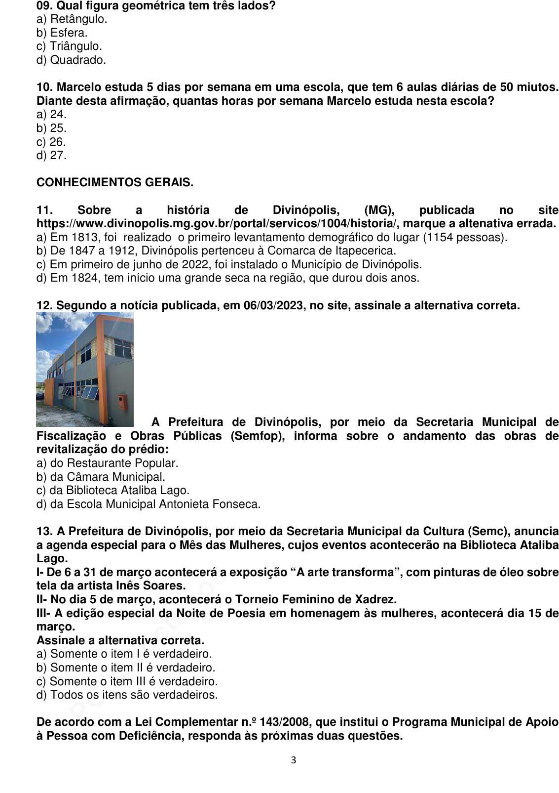 pcimarkpci MjgwNDowMTRjOjViYWU6ODBiMjo0OTE1OmZhMjQ6Y2ZiMjoxZjc2:V2VkLCAwNSBGZWIgMjAyNSAyMjowNDo1MyAtMDMwMA== www.pciconcursos.com.br 3 09. Qual figura geométrica tem três lados? a) Retângulo. b) Esfera. c) Triângulo. d) Quadrado. 10. Marcelo estuda 5 dias por semana em uma escola, que tem 6 aulas diárias de 50 miutos. Diante desta afirmação, quantas horas por semana Marcelo estuda nesta escola? a) 24. b) 25. c) 26. d) 27. CONHECIMENTOS GERAIS. 11. Sobre a história de Divinópolis, (MG), publicada no site https://www.divinopolis.mg.gov.br/portal/servicos/1004/historia/, marque a altenativa errada. a) Em 1813, foi realizado o primeiro levantamento demográfico do lugar (1154 pessoas). b) De 1847 a 1912, Divinópolis pertenceu à Comarca de Itapecerica. c) Em primeiro de junho de 2022, foi instalado o Município de Divinópolis. d) Em 1824, tem início uma grande seca na região, que durou dois anos. 12. Segundo a notícia publicada, em 06/03/2023, no site, assinale a alternativa correta. A Prefeitura de Divinópolis, por meio da Secretaria Municipal de Fiscalização e Obras Públicas (Semfop), informa sobre o andamento das obras de revitalização do prédio: a) do Restaurante Popular. b) da Câmara Municipal. c) da Biblioteca Ataliba Lago. d) da Escola Municipal Antonieta Fonseca. 13. A Prefeitura de Divinópolis, por meio da Secretaria Municipal da Cultura (Semc), anuncia a agenda especial para o Mês das Mulheres, cujos eventos acontecerão na Biblioteca Ataliba Lago. I- De 6 a 31 de março acontecerá a exposição “A arte transforma”, com pinturas de óleo sobre tela da artista Inês Soares. II- No dia 5 de março, acontecerá o Torneio Feminino de Xadrez. III- A edição especial da Noite de Poesia em homenagem às mulheres, acontecerá dia 15 de março. Assinale a alternativa correta. a) Somente o item I é verdadeiro. b) Somente o item II é verdadeiro. c) Somente o item III é verdadeiro. d) Todos os itens são verdadeiros. De acordo com a Lei Complementar n.º 143/2008, que institui o Programa Municipal de Apoio à Pessoa com Deficiência, responda às próximas duas questões. pcimarkpci MjgwNDowMTRjOjViYWU6ODBiMjo0OTE1OmZhMjQ6Y2ZiMjoxZjc2:V2VkLCAwNSBGZWIgMjAyNSAyMjowNDo1MyAtMDMwMA== www.pciconcursos.com.br 4 14. Anualmente ocorrerá o Encontro Divinopolitano de Pessoas com Deficiência e/ou Mobilidade Reduzida. Esse Encontro será realizado no mês de: a) Março. b) Agosto. c) Outubro. d) Dezembro. 15. Marque a alternariva incorreta. a) O Conselho Municipal da Pessoa com Deficiência e/ou Mobilidade Reduzida será constituído de 12 membros. b) Às pessoas com deficiência, aprovadas em concurso público de âmbito municipal, serão destinadas, para cada cargo a 5ª, 15ª, 25ª vagas e assim sucessivamente. c) É obrigatório aos restaurantes, bares, lanchonetes e pizzarias, possuírem em seus estabelecimentos, disponíveis aos usuários, cardápios transcritos para o Sistema Braille. d) As funções do Conselho Municipal da Pessoa com Deficiência e/ou Mobilidade Reduzida serão remuneradas. RASCUNHO.