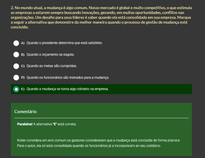 2. No mundo atual, a mudança é algo comum. Nosso mercado é global e muito competitivo, que estimula as empresas a estarem sempre buscando inovações, gerando, em muitas oportunidades, conflitos nas organizações. Um desafio para seus líderes é saber quando ela está consolidada em sua empresa. Marque a seguir a alternativa que demonstre da melhor maneira quando O processo de gestão de mudança está concluído. A) Quando presidente determina que está satisfeito. B) Quando orçamento se esgota. C) Quando as metas são cumpridas. D) Quando os funcionários são treinados para a mudança. E) Quando a mudança se torna algo rotineiro na empresa. Comentário A alternativa "E" está Kotler considera um erro comum os gestores considerarem que a mudança está concluída de forma precoce. Para autor, ela só está consolidada quando os funcionários já a incorporaram ao seu cotidiano.