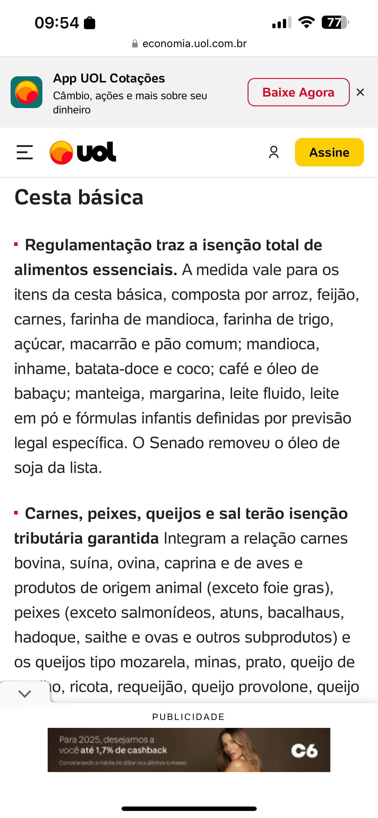 09:54 77 economia.uol.com.br App UOL Cotações Câmbio, ações e mais sobre seu Baixe Agora dinheiro Assine Cesta básica Regulamentação traz a isenção total de alimentos essenciais. A medida vale para os itens da cesta básica, composta por arroz, feijão, carnes, farinha de mandioca, farinha de trigo, açúcar, macarrão e pão comum; mandioca, inhame, batata-doce e café e óleo de babaçu; manteiga, margarina, leite fluido, leite em pó e fórmulas infantis definidas por previsão legal específica. O Senado removeu o óleo de soja da lista. Carnes, peixes, queijos e sal terão isenção tributária garantida Integram a relação carnes bovina, suína, ovina, caprina e de aves e produtos de origem animal (exceto foie gras), peixes (exceto salmonídeos, atuns, bacalhaus, hadoque, saithe e ovas e outros subprodutos) e os queijos tipo mozarela, minas, prato, queijo de 10, ricota, requeijão, queijo provolone, queijo PUBLICIDADE Para 2025, desejamos a você até 1,7% de cashback C6 do nos 6meses