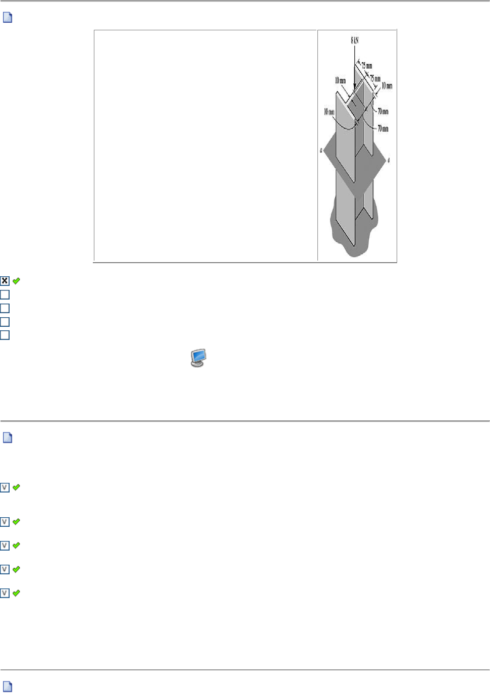 1a Questão (Ref.: 201402255880) Pontos: 0,1 / 0,1 A coluna está submetida a uma força axial de 8 kN no seu topo. Supondo que a seção transversal tenha as dimensões mostradas na figura, determinar a tensão normal média que atua sobre a seção a-a. 1,82 MPa 182 kPa 571 kPa 0,182 MPa 5,71 MPa Gabarito Comentado. 2a Questão (Ref.: 201402771755) Pontos: 0,1 / 0,1 Sobre as características das tensões na seção transversal marque como Verdadeiro (V) ou Falso (F), os itens a seguir. Cisalhamento ou corte ocorre quando se aplica um esforço tangencial à área da seção transversal da peça de modo a produzir nesta área uma pressão maior que a máxima pressão (tensão admissível) suportada pela peça em questão. Flexão quando se aplica um esforço axial na peça, as fibras superiores da peça serão comprimidas e as fibras inferiores serão tracionadas, ou vice-versa. Torção quando atuar um torque em uma de suas extremidades e um contra-torque na extremidade oposta. Assim, tendem a produzir rotação sobre o eixo longitudinal da barra. As tensões admissíveis são fixadas nas normas técnicas consideram um fator de segurança muito grande, pois ele deve cobrir: Todas as falhas nas suposições dos cálculos. A resposta dos elementos estruturais (lajes, vigas, pilares, fundações), aos esforços internos aplicados - força normal (N) que dá origem à tração ou à compressão, momento fletor (M) que dá origem à flexão, momento torsor (Mt) que dá origem à torção e força cortante (V) que dá origem ao cisalhamento. 3a Questão (Ref.: 201402258758) Pontos: 0,1 / 0,1 Marque a afirmativa que considerar correta observando a figura ao lado e considerando que as vidas horizontais: são rígidas possuem peso próprio desprezível Não posso usar a 3ª Lei de Newton para calcular as reações nas Barras A Força AH vale 125 N e a DE vale aproximadamente 83 N As forças atuantes em AH e BG valem, respectivamente 300 e 200 N Essa estrutura está hiperestática As forças nas Barras DE e BG são iguais Gabarito Comentado. 4a Questão (Ref.: 201402258847) Pontos: 0,1 / 0,1 A estrutura apresentada foi calculada para suportar uma Máquina de Ar Condicionado de um prédio comercial que pesa W=6 kN e as distâncias a e b valem , respectivamente, 4m e 2m. Responda a afirmativa correta (considere as vigas horizontais rígidas e com peso desprezível). As forças atuantes nas Barras AB e CD valem 2 kN e 4 kN, respectivamente As reações RA e RC são iguais Posso afirmar que RC - RA = 1kN As forças atuantes nas Barras AB e CD valem 5 kN e 1kN, respectivamente Posso afirmar que RA - RC = 6kN Gabarito Comentado. 5a Questão (Ref.: 201402256026) Pontos: 0,1 / 0,1 A coluna está submetida a uma força axial de 12 kN no seu topo. Supondo que a seção transversal tenha as dimensões mostradas na figura, determinar a tensão normal média que atua sobre a seção a-a. 0,273 MPa 8,57 kPa 587 kPa 2,73 MPa 273 kPa