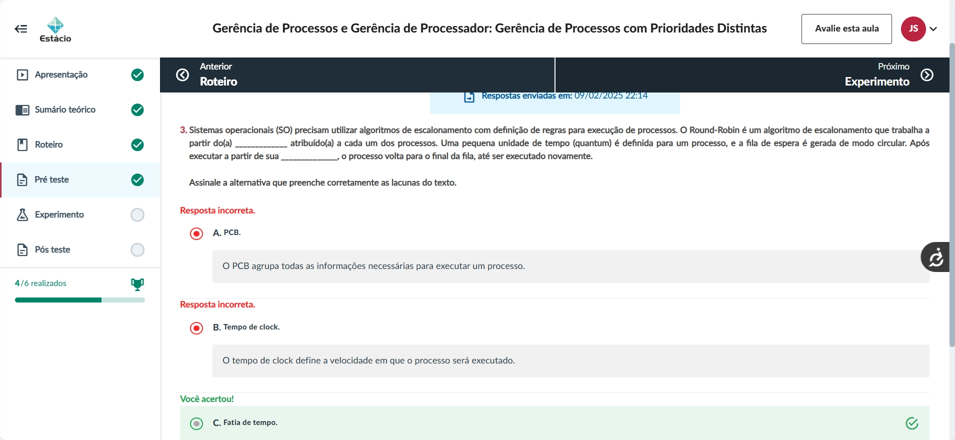 Gerência de Processos e Gerência de Processador: Gerência de Processos com Prioridades Distintas Avalie esta aula JS Estácio Anterior Próximo Apresentação > Roteiro Experimento Respostas enviadas em: 09/02/2025 22:14 Sumário teórico 3. Sistemas operacionais (SO) precisam utilizar algoritmos de escalonamento com definição de regras para execução de processos. Round-Robin é um algoritmo de escalonamento que trabalha a Roteiro partir do(a) atribuído(a) a cada um dos processos. Uma pequena unidade de tempo (quantum) é definida para um processo, e a fila de espera é gerada de modo circular. Após executar a partir de sua processo volta para o final da fila, até ser executado novamente. Pré teste Assinale a alternativa que preenche corretamente as lacunas do texto. Experimento Resposta incorreta. A. PCB. Pós teste PCB agrupa todas as informações necessárias para executar um processo. 4/6 realizados Resposta incorreta. B. Tempo de clock. tempo de clock define a velocidade em que o processo será executado. Você acertou! C. Fatia de tempo.