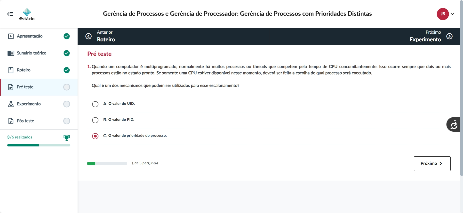Gerência de Processos e Gerência de Processador: Gerência de Processos com Prioridades Distintas JS Estácio Anterior Próximo Apresentação > Roteiro Experimento Sumário teórico Pré teste 1. Quando um computador é multiprogramado, normalmente há muitos processos ou threads que competem pelo tempo de CPU Isso ocorre sempre que dois ou mais Roteiro processos estão no estado pronto. Se somente uma CPU estiver disponível nesse momento, deverá ser feita a escolha de qual processo será executado. Pré teste Qual é um dos mecanismos que podem ser utilizados para esse escalonamento? Experimento A. valor do UID. Pós teste B. valor do PID. 3/6 realizados C. valor de prioridade do processo. 1 de 5 perguntas Próximo >