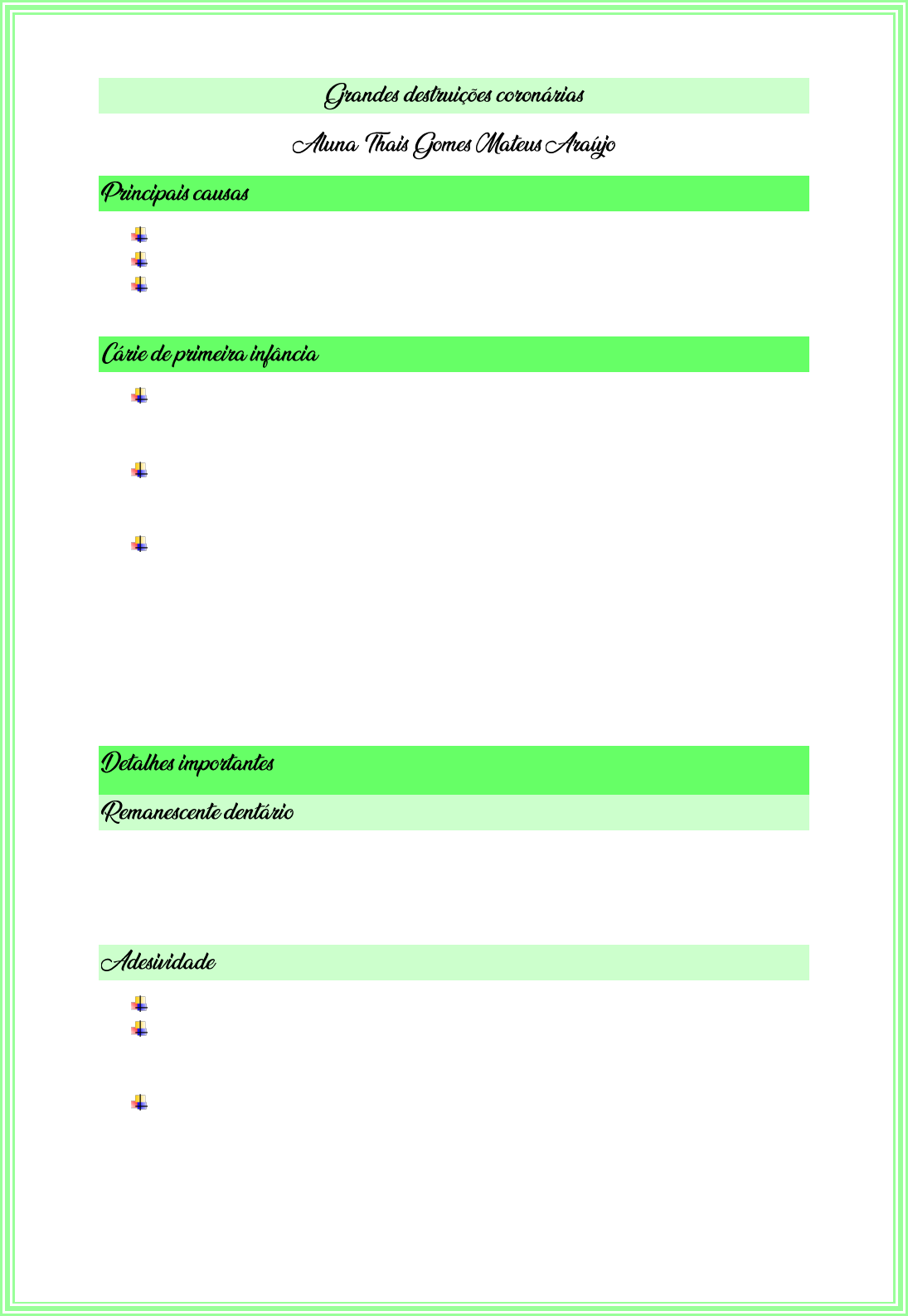 : Cárie de primeira infância; Traumatismos dentários; Patologias periapicais – que muitas vezes necessitam de retentores intra-canais para a realização das restaurações. Presença de uma ou mais superfícies cariadas (cavitada ou não cavitada), perdidas ou restauradas (devido à cárie) em qualquer dente decíduo de uma criança com menos de 6 anos de idade. Toda criança que sai do consultório, deve ter um programa de controle de biofilme para executar em casa. Iniciando com um creme dental de “ataque” em casa com concentração de 1.450 à 1.500 ppm de flúor. Após revertido o quadro agudo da doença cárie, mudamos para um tratamento de controle com uso de creme dental de manutenção com uma concentração de 1000 à 1.1000 ppm de flúor. Clínica odontopediátrica Comum observar destruição coronária grave por cárie de evolução precoce Necessita de estratégias imediatas capazes de reverter a atividade destrutiva da doença. Obs.: A reabilitação protética só deve ser iniciada após o controle da doença cárie. É a chave para o sucesso da reabilitação. Este tecido deve estar duro, mineralizado, e quanto mais melhor, para que haja superfície para adesão. É importante lembrar que existe diferença de adesão entre esmalte e dentina. A adesão com ácido fosfórico no esmalte dental funciona muito bem (restauração + confiável e + duradoura). Já, quando temos mais dentina do que esmalte no remanescente dentário a adesividade é prejudicada. Na dentina a adesão é prejudicada pelo maior conteúdo orgânico e maior umidade, ficando mais sujeita à técnica – respeitando o tempo de ácido, lavagem e aplicação do primer. Além disso, o condicionamento com ácido fosfórico em dentina: remove a smear layer; promove abertura da embocadura dos túbulos dentinários – mais umidade; expõe o colágeno e resulta em menor energia superficial. Adesão baseada em difusão e embricamento mecânico; Ácido fosfórico é muito agressivo para a dentina; Remoção completa da smear layer; Remoção da Hidroxiapatita que recobre a malha de fibras colágenas (MMPs e CATEPSINAS) Melhor abordagem para o esmalte – está provado! A adesão é duradoura! As fibras colágenas são profundamente expostas e a camada híbrida é espessa; Longo histórico clínico – especialmente para 3 passos E&R), mas com dependência de produto. Camada híbrida propensa à infiltração e biodegradação; Fraca interação química secundária. – , . O dente decíduo é opaco – use cores de dentina ou resinas opacas, de preferência, como: OA1, OB1, OP, DA1, DB1. Geralmente não usamos as de esmalte para os dentes decíduos. A resina Aura Bulk-Fill é indicada para a realização de restaurações posteriores em dentes decíduos e permanentes. A resina Aura da cor DB é ideal para restaurações diretas e indiretas em dentes anteriores e posteriores. Devem ser realizados para evitar o acumulo de biofilme dentário e, o consequente, manchamento das restaurações. Condicionamento comportamental da criança. Cariostático de 30 – 38% para que haja a cariostase. Mantenedores de espaço modificados – com dente de estoque. – . . – O mais importante é não prejudicar a saúde periodontal com o tratamento; Restabelecer o equilíbrio (funções) do sistema estomatognático; Mastigação, fonação e estética; Prevenir o desenvolvimento de hábitos parafuncionais; Evitar o desenvolvimento de problemas psicológicos. Resultados estéticos satisfatórios; Durabilidade até a esfoliação do dente decíduo; Sem sofrer fraturas ou deslocamento do remanescente dentário; Cimentado ao dente com material biocompatível; Confeccionado de modo fácil e rápido; Ausência de etapa laboratorial, reduzindo o número de sessões. Tamanho reduzido da coroa Amplitude da câmara pulpar para algum procedimento mais conservador – riscos de farturas; A maioria dos casos requer terapia endodôntica; Paredes radiculares delgadas com risco de fraturas; Prevenir fraturas radiculares e coronárias – retenção intra-canal; Extensão da reabilitação; Resultado – disfunção oclusal, devido à perda de DVO. Dependem do dente perdido; do estágio de desenvolvimento da dentição; da idade da criança; das características próprias do arco dentário; da presença de hábitos; da presença de anomalias na musculatura que podem levar ao desenvolvimento de hábitos parafuncionais – bruxismo. 1. Analise do perfil de risco do paciente; 2. Avaliação da oclusão do paciente; 3. Grau de motivação do CD/pais/criança; 4. Presença de hábitos deletérios para oclusão; 5. Dimensão vertical de oclusão – DVO. – tem atividade de cárie e necessita de tratamento reabilitador – (lesões ativas + necessita de reabilitação). – não tem atividade de cárie, mas necessita de tratamento reabilitador – (lesões inativas + necessita de reabilitação. 1º Momento – erupção e oclusão dos incisivos – pouca possibilidade reabilitadora. 2º Momento – erupção e oclusão dos 1ºMs decíduos – pouca possibilidade reabilitadora. Podemos observar: língua dentro da cavidade oral, término da sucção exclusiva, primeiro aumento da oclusão. 3º Momento – erupção e oclusão dos caninos, concomitante ao estabelecimento da chave de oclusão de canino, que vai estabilizar a oclusão como um todo, uma vez que os caninos são os pilares da oclusão. 4º Momento – erupção e oclusão dos 2ºMs decíduos – plena possibilidade de tratamento reabilitador total. Observa-se pouco crescimento e desenvolvimento. / Avaliação do estado motivacional da criança; Avaliação do estado motivacional da família; Grau de estresse pelo tratamento; Motivação para higiene bucal. Ausência ou presença de hábitos parafuncionais, como: sucção não-nutritiva, onicofagia, bruxismo. Podemos medir a DVO com um compasso em L, da ponta da base do nariz ao mento e da comissura dos lábios ao canto do olho (mét