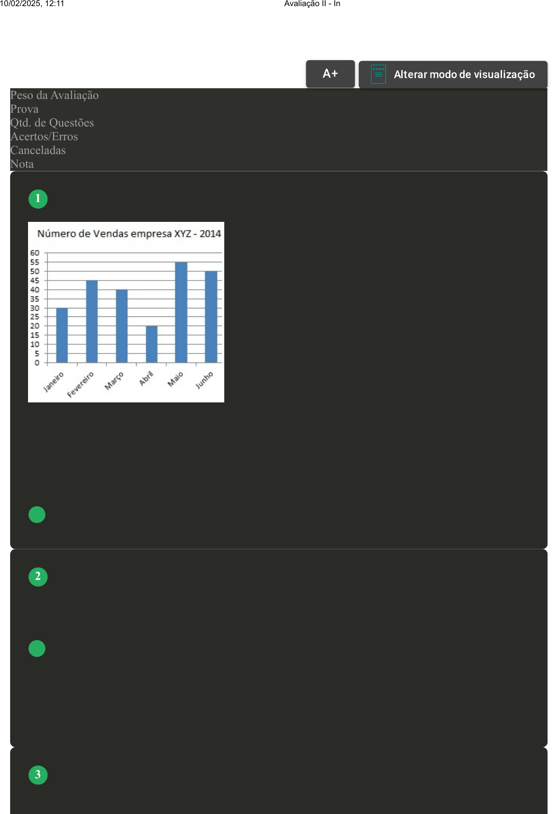 Prova Impressa GABARITO | Avaliação II - Individual (Cod.:686759) Peso da Avaliação 1,50 Prova 38607763 Qtd. de Questões 10 Acertos/Erros 7/1 Canceladas 2 Nota 9,00 O gráfico a seguir apresenta o número de vendas de uma determinada empresa nos seis primeiros meses de determinado ano. Qual a média mensal de vendas no período considerado? A 30. B 35. C 45. D 40. A estatística é a ciência que estabelece métodos científicos para coleta, organização, descrição análise e interpretação dos dados observados. Podemos afirmar que dados, para a estatística, é: A A fonte que realizou a pesquisa. B Um conjunto de valores numéricos ou não. C O título de uma distribuição de frequência. D O local onde foi realizada a pesquisa. A média está presente em praticamente todos os ramos de atividades, um exemplo muito utilizado para os varejistas é o ticket médio, que é a média de quanto uma venda traz de faturamento para o estabelecimento. Esse cálculo dá a visibilidade aos gestores de quanto seus esforços estão VOLTAR A+ Alterar modo de visualização 1 2 3 10/02/2025, 12:11 Avaliação II - Individual about:blank 1/5 rendendo por venda. Quanto maior o valor do ticket médio, melhor seu desempenho por transação. Sabendo que este estabelecimento vendeu durante o mês R$ 224.000,00 e teve um total de 448 vendas, podemos afirmar que o ticket médio do período é de: A R$ 200,00. B R$ 500,00. C R$ 250,00. D R$ 112,00. As Medidas de Tendência Central expressam a posição da distribuição com relação ao eixo dos valores da situação estudada. Com relação às Medidas de Tendência Central, classifique V para as sentenças verdadeiras e F para as falsas: ( ) A Mediana pode ser considerada uma Separatriz, pois seria o mesmo que calcular C50, que nos daria 50% dos dados para analisar. ( ) Ao fazer uma análise de dados, a Mediana pode ser utilizada no lugar da Média, pois sempre dará o mesmo resultado. ( ) Para o cálculo da Mediana pela fórmula estudada, deve-se, primeiramente, abrir uma coluna de Frequência Acumulada (Fai), para encontrar a Classe da Mediana. Assinale a alternativa que apresenta a sequência CORRETA: A V - V - F. B F - F - V. C F - V - F. D V - F - V. Atenção: Esta questão foi cancelada, porém a pontuação foi considerada. O quadro seguinte mostra o desempenho de um time de futebol no último campeonato. A coluna da esquerda mostra o número de gols marcados e a coluna da direita informa em quantos jogos o time marcou aquele número de gols. Se X, Y e Z são, respectivamente, a média, a mediana e a moda dessa distribuição, classifique V para as opções verdadeiras e F para as falsas: ( ) Z y y = z. D x = y > z. As medidas de posição são informações obtidas através das tabelas estatísticas, ou dados observados de uma determinada pesquisa. Podemos afirmar que fazem parte das medidas de posição: A Média, bissetriz, mediana. B Frequência absoluta, frequência acumulada e frequência relativa. C Gráfico de linhas, gráfico de colunas e gráfico de barras. D Média, mediana e moda. Uma empresa que fabrica roupas e acessórios teve uma evolução na produção de acessórios masculinos durante o período de 2010 a 2014. Conforme quadro a seguir, podemos afirmar que o percentual médio de acessórios masculinos produzidos nesse período foi de: A 9%. B 6%. C 8%. D 7%. 8 9 10/02/2025, 12:11 Avaliação II - Individual about:blank 4/5 Uma indústria pretende contratar um analista financeiro pagando como salário a média de mercado. Deste modo, fez uma pesquisa no mercado de trabalho local e verificou que os salários/hora de quatro profissionais nessa mesma ocupação em sua região são: R$ 25,00, R$ 30,00, R$ 35,00 e R$ 38,00. Nessas condições, determine o salário/hora médio a ser pago a esse profissional: A Salário/hora médio é R$ 38,00. B Salário/hora médio é R$ 32,00. C Salário/hora médio é R$ 30,00. D Salário/hora médio é R$ 33,00. 10 Imprimir 10/02/2025, 12:11 Avaliação II - Individual about:blank 5/5