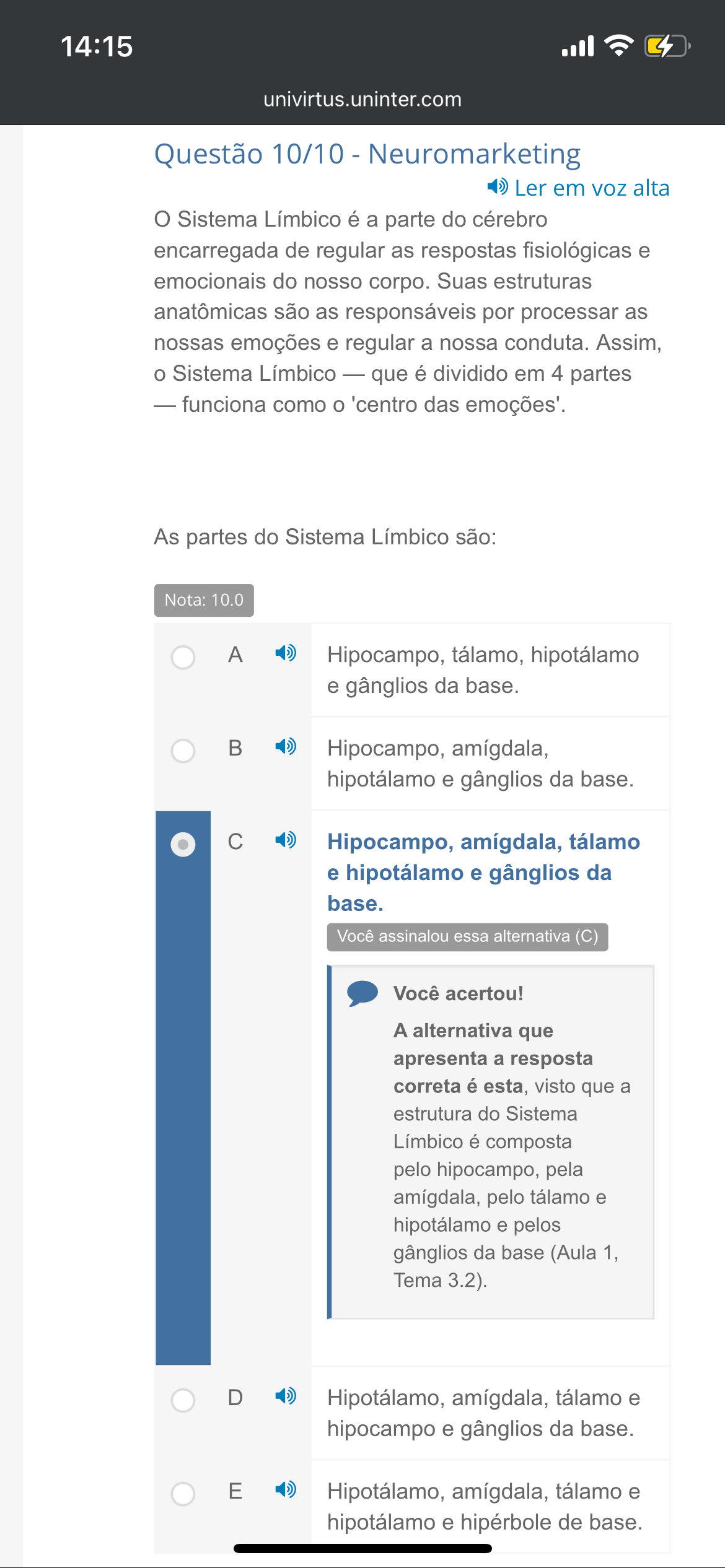 14:15 CS univirtus.uninter.com Questão 10/10 - Neuromarketing Ler em alta Sistema Límbico é a parte do cérebro encarregada de regular as respostas fisiológicas e emocionais do nosso corpo. Suas estruturas anatômicas são as responsáveis por processar as nossas emoções e regular a nossa conduta. Assim, o Sistema Límbico - que é dividido em 4 partes - funciona como o 'centro das As partes do Sistema Límbico são: Nota: 10.0 A Hipocampo, tálamo, hipotálamo e gânglios da base. B Hipocampo, amígdala, hipotálamo e gânglios da base. C Hipocampo, amígdala, tálamo e hipotálamo e gânglios da base. Você assinalou essa alternativa (C) Você acertou! A alternativa que apresenta a resposta correta é esta, visto que a estrutura do Sistema Límbico é composta pelo hipocampo, pela amígdala, pelo tálamo e hipotálamo e pelos gânglios da base (Aula 1, Tema 3.2). D Hipotálamo, amígdala, tálamo e hipocampo e gânglios da base. E Hipotálamo, amígdala, tálamo e hipotálamo e hipérbole de base.