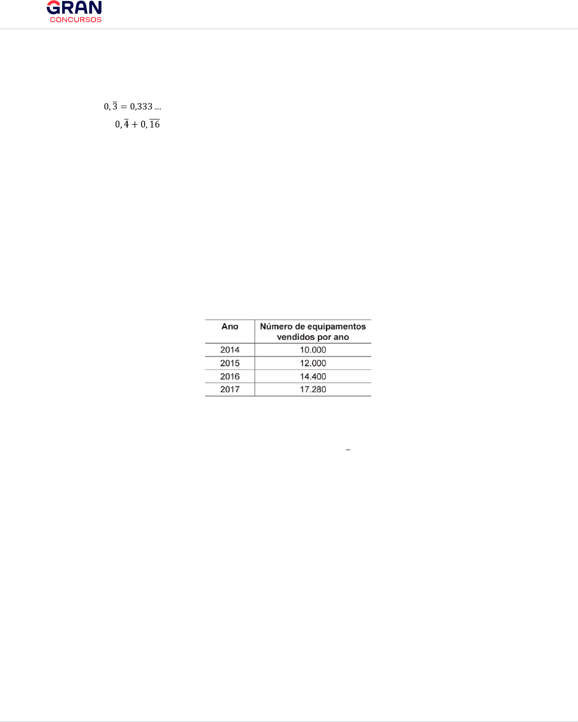 974 de 1019gran.com.br Caderno de Questões Cesgranrio Mais de 1.500 questões gabaritadas! 1330. 1330. (CESGRANRIO/2018/LIQUIGÁS DISTRIBUIDORA S.A./TÉCNICO QUÍMICO/QUESTÃO 17) Colocar uma barra sobre o período é uma das formas de representar uma dízima periódica: A expressão é igual a a) 51/100 b) 511/1000 c) 11/18 d) 14/15 e) 5/9 1331. 1331. (CESGRANRIO/2018/PETROBRAS TRANSPORTE S.A. – TRANSPETRO/ANALISTA DE COMERCIALIZAÇÃO JÚNIOR/ÁREA: SUPRIMENTO/QUESTÃO 34) O número de equipamentos vendidos por uma empresa vem aumentando a uma taxa de crescimento constante nos últimos anos, conforme mostra a Tabela a seguir. A empresa precisa programar-se para que sua produção possa atender às demandas futuras, caso essa tendência se mantenha. Assim, considerando-se 2,5 como aproximação para 1,25, e mantida a taxa de crescimento observada, o número mais próximo para a previsão de vendas de todo o período de 2014 a 2023, em milhares de equipamentos, contando, inclusive, com as vendas de 2014 e 2023, é igual a a) 156,2 b) 162,5 c) 190,0 d) 262,5 e) 285,2 https://www.gran.com.br https://www.gran.com.br