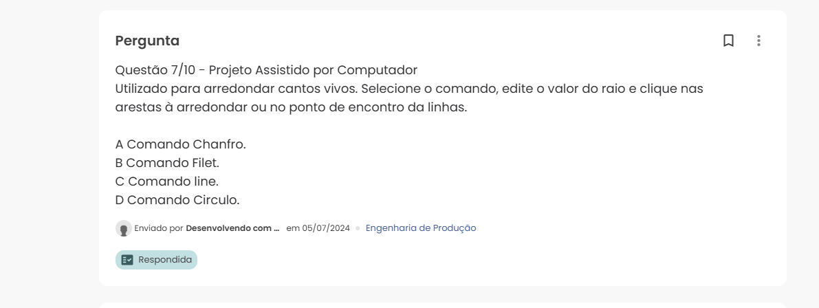 Pergunta Questão 7/10 - Projeto Assistido por Computador Utilizado para arredondar cantos vivos. Selecione comando, edite o valor do raio e clique nas arestas à arredondar ou no ponto de encontro da linhas. A Comando Chanfro. B Comando Filet. C Comando line. D Comando Circulo. Enviado por Desenvolvendo com em 05/07/2024 Engenhario de Produção Respondida