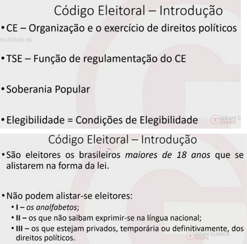 O código eleitoral é uma lei ordinária que foi recepcionada pela constituição, mas para altera-la é necessário lei complementar. Como para tratar de qualquer matéria eleitoral Estrangeiro não pode se tornar cidadão brasileiro, apenas brasileiro nato ou naturalizado Incompatível com a CF por ser de 16 anos a idade no Brasil, a CF revogou esse artigo do código eleitoral Analfabetos também pode se alistar facultativamente Norma superior revoga a norma inferior e por isso esse artigo está revogado Não há esse requisito de se exprimir na língua portuguesa Os únicos requisitos da CF são a nacionalidade e a idade Perda ou suspensão dos direitos políticos não pode se alistar segundo o código, porém há uma resolução do TSE permitindo o alistamento em caso de suspensão dos direitos políticos apenas, que não poderá votar enquanto durar a suspensão, mas terá seu alistamento concluído Apenas o conscrito não pode se alistar enquanto estiver na prestação de serviço militar obrigatório, artigo revogado. Invalido no caso está tratando de deficientes pelo código ser mais antigo, os deficientes têm o alistamento obrigatório atualmente. Apenas algumas deficiências que geram muita dificuldade para o cidadão fazem com que o não exercício das obrigações politicas não gere nenhuma sanção. Fora do país pela CF ainda tem que se alistar e votar ou justificar quando não puder votar II – Hipóteses que podem ser usadas como justificativa para não ter votado Resolução do TSE tirou o salário mínimo como base dessa multa Ao pagar a multa não há mais sanção Se já for servidor público não poderá ganhar o salário Se estiver fora do Brasil e perder o passaporte poderá fazer um passaporte para fins de retorno ao país mesmo se não tiver com a quitação eleitoral O eleitor que não votar, não justificar ausência e não pagar a multa em 3 eleições consecutivas, sofrera o cancelamento da inscrição eleitoral O eleitor depois da eleição tem 60 dias para justificar a sua ausência E se estiver no exterior, ao voltar terá 30 dias para justificar Brasileiro nato tem até os 19 anos para se alistar, se não tiver eleição naquele ano não sofrera a multa e terá 151 dias antes da próxima eleição para se alistar image7.png image8.png image1.png image2.png image3.png image4.png image5.png image6.png
