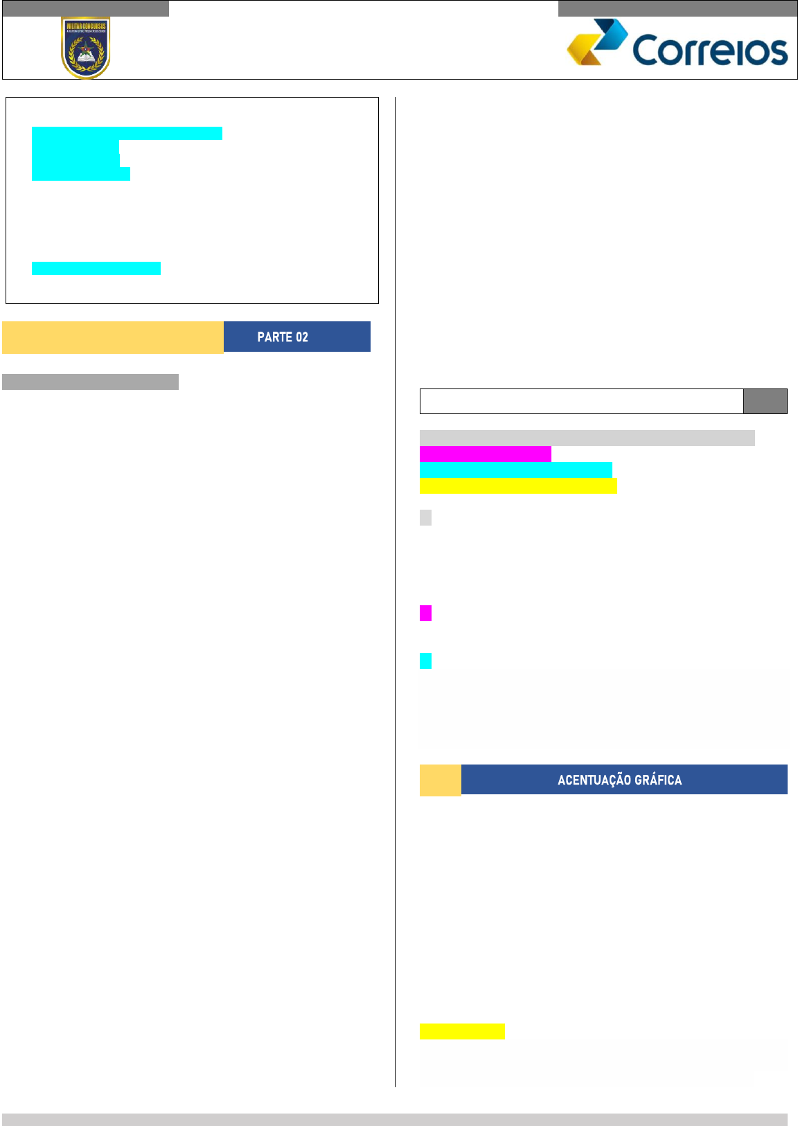 PROFES: SGT JÚNIOR TURMA: PCPA 2024 APOSTILA 01 – LEGISLAÇÃO ESPECIAL PROFª. LARISSA PASCOAL APOSTILA 04 – PORTUGUÊS TURMA: CORREIOS 2024 – CARTEIRO 3. ORTOGRAFIA OFICIAL 4. ACENTUAÇÃO GRÁFICA PORTUGUÊS – PROFESSORA LARISSA PASCOAL TURMA: CORREIOS 2024 – CARTEIRO PÁGINA 1 ❑ CONTEÚDO PROGRAMÁTICO LÍNGUA PORTUGUESA: 1. Compreensão e interpretação de textos. 2. Tipologia textual. 3. Ortografia oficial. 4. Acentuação gráfica. 5. Emprego das classes de palavras. 6. Emprego do sinal indicativo de crase. 7. Sintaxe da oração e do período. 8. Pontuação. 9. Concordância nominal e verbal. 10. Regência nominal e verbal. 11. Significação das palavras. 12. Redação oficial: aspectos gerais, características fundamentais, padrões, emprego e concordância dos pronomes de tratamento. NOÇÕES ORTOGRÁFICAS ❑ Fonemas – São as unidades mínimas de som usadas na Fonologia. ❑ Sílabas – É o conjunto de um ou mais fonemas que produz um som completo. ❑ Encontros Vocálicos – É o agrupamento de duas ou três vogais e/ou semivogais. ❑ Ditongo Ditongo é o encontro de vogal + semivogal ou de semivogal + vogal (SV + V ou V + SV) que ocorre na mesma sílaba. Exemplos: • céu (céu) / tranquilo (tran-qui-lo) / boi (boi) De acordo com a localização da vogal e da semivogal, os ditongos podem ser: crescentes ou decrescentes. ▪ Ditongo decrescente O ditongo é decrescente quando primeiro vem a vogal e depois a semivogal, como em pei- xe, cha-péu, an-dei, ca-dei-ra, len-çóis, pa-pai, ma-mãe, ou-sar, po-rão. ▪ Ditongo crescente O ditongo é crescente quando primeiro vem a semivogal e depois a vogal, como em má- goa, his-tó-ria, sé-rie, re-sí-duo. ❑ Tritongo Tritongo é o encontro de semivogal + vogal + semivogal (SV + V + SV) que ocorre na mesma sílaba. Exemplos: • Uruguai (U-ru-guai) • saguão (sa-guão) • enxaguam (en-xa-guam) ❑ Hiato Hiato é o encontro de duas vogais (V + V) que ocorre em sílabas diferentes. Exemplos: • raiz (ra-iz) • Saara (Sa-a-ra) • país (pa-ís) ❑ Encontro Consonantais – É o agrupamento de duas ou mais consoantes em uma mesma palavra. Exemplos: Brasil, cacto, flor, objetivo. ❑ Dígrafos – É o agrupamento de duas letras que formam o mesmo fonema. • Dígrafo Consonantal Encontro de duas letras que representam um fonema consonantal. Os principais são: ch, lh, nh, rr, ss, sc, sç, xc, gu e qu. • Dígrafo Vocálico Encontro de uma vogal seguida das letras m ou n, que resulta num fonema vocálico. Eles são: am, an; em, en; im, in; om, on e um, un. NOVO ACORDO ORTOGRÁFICO O QUE MUDOU: 1. Alfabeto ganha três novas letras: k, w e y (26 letras) 2. Trema desaparece 3. Novas regras de acentuação 4. Novas regras de uso do hífen 1. As letras k, w e y são usadas em várias situações, como na escrita de símbolos de unidades de medida (Ex.: km, kg) e de palavras e nomes estrangeiros (Ex.: show, William). Passam a fazer parte do nosso idioma oficialmente: A B C D E F G H I J K L M N O P Q R S T U V W X Y Z 2. Não use mais o trema: linguiça, tranquilo, cinquenta, sequestro. 3. Acentuação Gráfica Trata-se do fenômeno relacionado com a intensidade em que as sílabas se apresentam quando pronunciadas, podendo ser em maior ou menor grau. Quando proferidas com mais intensidade, classificam-se como tônicas, e quando soadas de maneira mais sutil, como átonas. A acentuação gráfica consiste na colocação de acento ortográfico para indicar a pronúncia de uma vogal ou marcar a sílaba tônica de uma palavra. Os nomes dos acentos gráficos da língua portuguesa são: • acento agudo (´) • acento grave (`) • acento circunflexo (^) Os acentos gráficos são elementos essenciais que para estabelecem, por meio de regras, a sonoridade/intensidade das sílabas das palavras. Inicialmente, o mais importante, antes de conhecer as regras específicas de acentuação, é conhecer a tonicidade das palavras. TONICIDADE As palavras podem ser classificadas de acordo com sua tonicidade, ou seja, de acordo com a sílaba mais intensa/tônica. Dessa forma, as palavras podem ser: ORTOGRAFIA OFICIAL 4. PROFES: SGT JÚNIOR TURMA: PCPA 2024 APOSTILA 01 – LEGISLAÇÃO ESPECIAL PROFª. LARISSA PASCOAL APOSTILA 04 – PORTUGUÊS TURMA: CORREIOS 2024 – CARTEIRO 3. ORTOGRAFIA OFICIAL 4. ACENTUAÇÃO GRÁFICA PORTUGUÊS – PROFESSORA LARISSA PASCOAL TURMA: CORREIOS 2024 – CARTEIRO PÁGINA 2 Oxítonas: última sílaba tônica – VOCÊ. Paroxítonas: penúltima sílaba tônica – HISTÓRIA. Proparoxítonas: antepenúltima sílaba tônica – MÉDICO. SÍLABA TÔNICA E SÍLABA ÁTONA Todas as palavras da Língua Portuguesa possuem uma sílaba tônica, que é a pronunciada com mais intensidade que as demais. Todas as outras são denominadas de sílabas átonas. ACENTO TÔNICO E ACENTO GRÁFICO O acento tônico está relacionado com a intensidade dos fonemas, e o acento gráfico, como o agudo e o circunflexo, marca a sílaba tônica. PALAVRAS OXÍTONAS • Acentuam-se as oxítonas terminadas em a(s): Exemplos: maracujá, ananás • Acentuam-se as oxítonas terminadas em e(s): Exemplos: café, você, vocês, pedrês, até • Acentuam-se as oxítonas terminadas em o(s): Exemplos: dominó, paletós, vovô, avós • Acentuam-se as oxítonas terminadas em em e en(s): Exemplos: armazém, vintém, armazéns, provém PALAVRAS PAROXÍTONAS • Acentuam-se as paroxítonas terminadas em um e un(s): Exemplos: fórum, álbum, médiuns • Acentuam-se as paroxítonas terminadas em r: Exemplos: caráter, mártir, açúcar • Acentuam-se as paroxítonas terminadas em x: Exemplos: tórax, ônix, clímax, látex • Acentuam-se as paroxítonas terminadas em n: Exemplos: pólen, hífen, abdômen • Acentuam-se as paroxítonas terminadas em l: Exemplos: fácil, amável, indelével • Acentuam-se as paroxítonas terminadas em ão(s): Exemplos: órgão, órgãos, órfão • Acentuam-se as paroxítonas terminadas em ps: Exemplos: