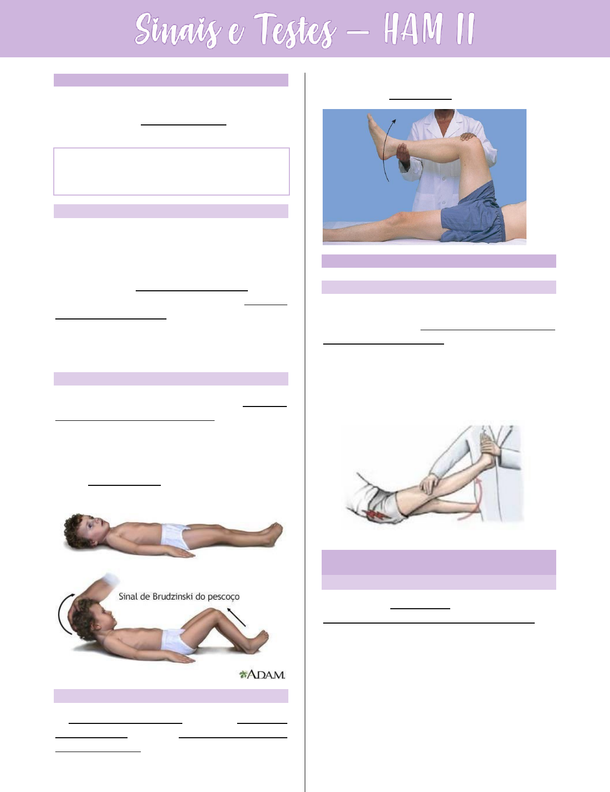 [Digite aqui] SINAL DE PHALEN Testes do Nervo Mediano Sinais de irritação meníngea ↠ A pesquisa desses sinais é importante sempre que houver suspeita de inflamação meníngea por meningite ou hemorragia subaracnóidea (BATES, 12ª ed.). MOBILIZAÇÃO DO PESCOÇO/RIGIDEZ DE NUCA ↠ Primeiro é preciso garantir que não exista lesão ou fratura às vértebras cervicais ou à medula espinal na região cervical (BATES, 12ª ed.). ↠ A seguir, com o paciente em decúbito dorsal, coloque as mãos na parte posterior da cabeça e flexione o pescoço dele para frente, se possível, até o queixo encostar no tórax. Normalmente o pescoço é flexível e o paciente consegue mover facilmente a cabeça e o pescoço para frente (BATES, 12ª ed.). SINAL DE BRUDZINSKI ↠ Durante a flexão do pescoço do paciente, observa-se a resposta dos quadris e dos joelhos a essa manobra. Normalmente eles permanecem relaxados e imóveis (BATES, 12ª ed.). ↠ A flexão dos quadris e dos joelhos é considerada um sinal de Brudzinski positivo (BATES, 12ª ed.). SINAL DE KERNIG ↠ Flexione o membro inferior do paciente na altura do quadril e do joelho e, a seguir, estenda a perna lentamente e estique o joelho. Desconforto na parte posterior do joelho durante a extensão plena é normal, mas não há dor (BATES, 12ª ed.). ↠ Dor e aumento da resistência à extensão do joelho são um sinal de Kernig positivo (BATES, 12ª ed.). Sinal de irritação radicular PROVA DE LASÈGUE ↠ Com o paciente em decúbito dorsal e os membros inferiores estendidos, o examinador levanta um dos membros inferiores estendido. A prova é positiva quando o paciente reclama de dor na face posterior do membro examinado, logo no início da prova (cerca de 30° de elevação) (PORTO & PORTO, 8ª ed.). ↠ Para testar o sinal de Phalen, pede-se ao paciente para manter os punhos em flexão durante 60 segundos com os cotovelos totalmente estendidos. Como alternativa, solicite ao paciente para pressionar as costas das mãos uma contra a outra formando um ângulo reto. Essas manobras comprimem o nervo mediano (BATES, 12ª ed.). ↠ O teste funciona já que a posição fletida do punho comprime ainda mais o nervo mediano já comprimido na posição neutra, no caso de Síndrome do Túnel do Carpo (STC). Inflamação do espaço subaracnóideo provoca resistência aos movimentos que “estiram” os nervos espinais (flexão do pescoço), o nervo femoral (sinal de Brudzinski) e o nervo isquiático (sinal de Kernig) (BATES, 12ª ed.). 1 2 TESTE DE DURKAN ↠ O examinador pressiona com os 2 polegares a região do carpo por 30 segundos. Dessa forma, é considerado positivo se os sintomas comuns da STC se apresentarem ao longo do trajeto no nervo mediano. SINAL DE TINEL ↠ Consiste na percussão leve sobre o punho, na localização do nervo mediano. Assim o resultado positivo é quando essa percussão transmite uma sensação de parestesia na região de distribuição do nervo mediano. TESTE DE FINKELSTEIN ↠ Realiza-se o desvio ulnar do punho com o polegar aduzido e fletido na palma. A dor é sinal de positividade e indica tendinite do primeiro compartimento (de Quervain). TESTE DE ALLEN ↠ É um teste para a verificação da circulação arterial da mão, por meio da análise de perfusão das artérias radial e ulnar. 3 Nistagmo ↠ Nistagmo pode ser classificado por tremor associado dos globos oculares (SILVA). ↠ Pode ser espontâneo ou de posição. NISTAGMO ESPÔNTANEO ↠ Movimento ocular observado no paciente sentado, com os olhos na posição primária do olhar, sem fixação ocular. ↠ Na fase aguda das labirintopatias periféricas o nistagmo tem o componente rápido no sentido oposto ao da lesão e diminui progressivamente até desaparecer. ↠ A visualização de nistagmo espontâneo pode ser obtida através do uso das lentes de aumento de Frenzel (aumentam 20 dioptrias), que impedem a fixação do olhar para que o nistagmo de origem periférica não seja inibido (SILVA) NISTAGMO DE POSIÇÃO ↠ A manobra de DixHallpike é a mais utilizada. ↠ Testa-se o canal semicircular posterior, o mais acometido nos casos de desprendimento de otólitos. ↠ O paciente inicialmente sentado com as pernas estendidas sobre a maca. Com o paciente sentado, vira- se sua cabeça passivamente em um ângulo de 45º com o plano sagital para o lado testado. ↠ Faz-se movimento rápido e contínuo, deitando o paciente e finalizando a manobra com a cabeça do paciente ultrapassando a borda da maca e pendurada para trás em torno de 15º. Referências SILVA, R. F. Seminário de provas vestibulares. Disponível em: Acessado em: 01 de março de 2022. PORTO, CELMO C.; PORTO, ARNALDO L.. Semiologia Médica. 8ª edição. Rio de Janeiro: Guanabara Koogan, 2021. BICKLEY, L. S. Bates: Propedêutica Médica. 12. ed. Rio de Janeiro: Guanabara Koogan, 2018.