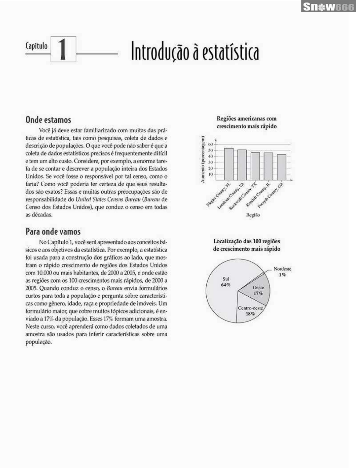 Capítulo 1 Introdução à estatística Onde estamos Regiões americanas com crescimento mais rápido Você já deve estar familiarizado com muitas das prá- ticas de estatística, tais como pesquisas, coleta de dados e descrição de populações. o que você pode não saber é que a coleta de dados estatísticos precisos é frequentemente difícil 60 50 40 e tem um alto custo. Considere, por exemplo, a enorme tare- 30 fa de se contar e descrever a população inteira dos Estados 20 Unidos. Se você fosse o responsável por tal censo, como o 10 faria? Como você poderia ter certeza de que seus resulta- dos são exatos? Essas e muitas outras preocupações são de responsabilidade do United States Census Bureau (Bureau de Censo dos Estados Unidos), que conduz o censo em todas as décadas. Região Para onde vamos No Capítulo 1, você será apresentado aos conceitos bá- Localização das 100 regiões sicos e aos objetivos da estatística. Por exemplo, a estatística de crescimento mais rápido foi usada para a construção dos gráficos ao lado, que mos- tram o rápido crescimento de regiões dos Estados Unidos Nordeste com 10.000 ou mais habitantes, de 2000 a 2005, e onde estão 1% as regiões com os 100 crescimentos mais rápidos, de 2000 a Sul 64% 2005. Quando conduz o censo, o Bureau envia formulários Oeste 17% curtos para toda a população e pergunta sobre cas como gênero, idade, raça e propriedade de imóveis. Um Centro-oeste formulário maior, que cobre muitos tópicos adicionais, é en- 18% viado a 17% da população. Esses 17% formam uma amostra. Neste curso, você aprenderá como dados coletados de uma amostra são usados para inferir características sobre uma população.Introdução à 3 1.1 Uma visão geral sobre estatística 0 que você Definição de estatística Conjuntos de dados Ramos da deve aprender Definição de estatística A definição de Como distinguir entre uma popu- Conforme começamos o curso, você pode se perguntar: que é estatística? Por que lação e uma amostra, um eu devo estudar estatística? Como o estudo da estatística pode me ajudar profissionalmente? tro e um dado Quase todos os dias somos expostos à estatística. Por exemplo, considere os trechos a Como distinguir entre seguir, retirados de jornais e publicações recentes. descritiva e inferencial. "As pessoas que comem três porções diárias de grãos integrais têm risco de so- frer problemas cardíacos reduzido em 37%." (Fonte: Whole Grains Council.) "Setenta por cento dos 1.500 danos à espinha dorsal em menores de idade re- sultam de acidentes de carro e 68 dos feridos não estavam usando o cinto de segurança." "Espera-se que a produção americana de carvão, que aumentou em 2,5% em 2006, sofra uma redução de 3,1% em 2007." (Fonte: Energy Information Administration.) As três afirmações que você acabou de ler são baseadas na coleta de Definição Dados consistem em informações que vêm de observações, contagens, medições ou respostas. Às vezes, os dados são apresentados Se você alguma vez leu o USA TODAY, certamente já viu uma das características mais populares do jornal, os USA TODAY Snapshots. Gráficos que apresentam informações de forma fácil de ser entendida. Maiores Entregar preocupações a tempo dos pagantes de impostos Passar por 7% auditoria 17% Deduções Taxas pendentes Errar nos 52% cálculos 24% uso de dados estatísticos remonta aos censos feitos na antiga Babilônia, no Egi- to e, mais tarde, no Império Romano, quando os dados eram coletados sobre assuntos relacionados ao Estado, tais como nascimentos e óbitos. Na verdade, a palavra ca é derivada da palavra latina status, que significa "estado". Então, o que é estatística? Definição Estatística é a ciência que coleta, organiza, analisa e interpreta dados para a tomada de decisões.4 aplicada Importante Conjuntos de dados Um censo consiste de dados Há dois tipos de conjuntos de dados usados em estatística. Esses conjuntos são de uma população inteira. chamados de população e amostra. Mas, a menos que a popula- ção seja pequena, é normal- Definição mente impraticável obter to- dos os dados da população. Uma população é uma coleção de todos os resultados, respostas, medições ou contagens que Na maioria dos estudos, as são de interesse. informações devem ser obti- Uma amostra é um subgrupo de uma população. das de uma amostra. Dados amostrais podem ser usados para formar conclusões sobre populações. Os dados amostrais devem ser coletados usando o método apropriado, tal como a seleção aleatória. Se os dados não forem coletados usando-se o método apropriado, eles não terão valor. Exemplo 1 Identificando conjunto de dados Em uma pesquisa recente, foi perguntado a 1.708 adultos americanos se eles con- sideram o aquecimento global um problema que exige uma ação imediata do governo. Novecentos e trinta e nove deles responderam que sim. Identifique a população e a amostra. Descreva o conjunto de Pew Research Center.) Solução A população consiste das respostas de todos os adultos nos Estados Unidos, e a amostra consiste das respostas de 1.708 adultos nos Estados Unidos na pesquisa. A amostra é um subgrupo das respostas de todos os adultos nos Estados Unidos. con- junto de dados consiste de 939 sim e 769 Respostas de todos os adultos nos Estados Unidos (população) Respostas dos adultos na pesquisa (amostra) Tente o departamento de energia dos Estados Unidos conduz pesquisas semanais em você aproximadamente 800 postos de gasolina para determinar o preço médio por 1 galão de gasolina comum. Em 12 de fevereiro de 2007, o preço médio era $2,24 por galão. Identifique a população e a amostra. Energy Information Administration.) Identifique a população. Identifique a amostra. Do que consiste o conjunto de dados? Resposta p. A32 Se o conjunto de dados é uma população ou uma amostra normalmente depende do contexto da vida real. No caso do 