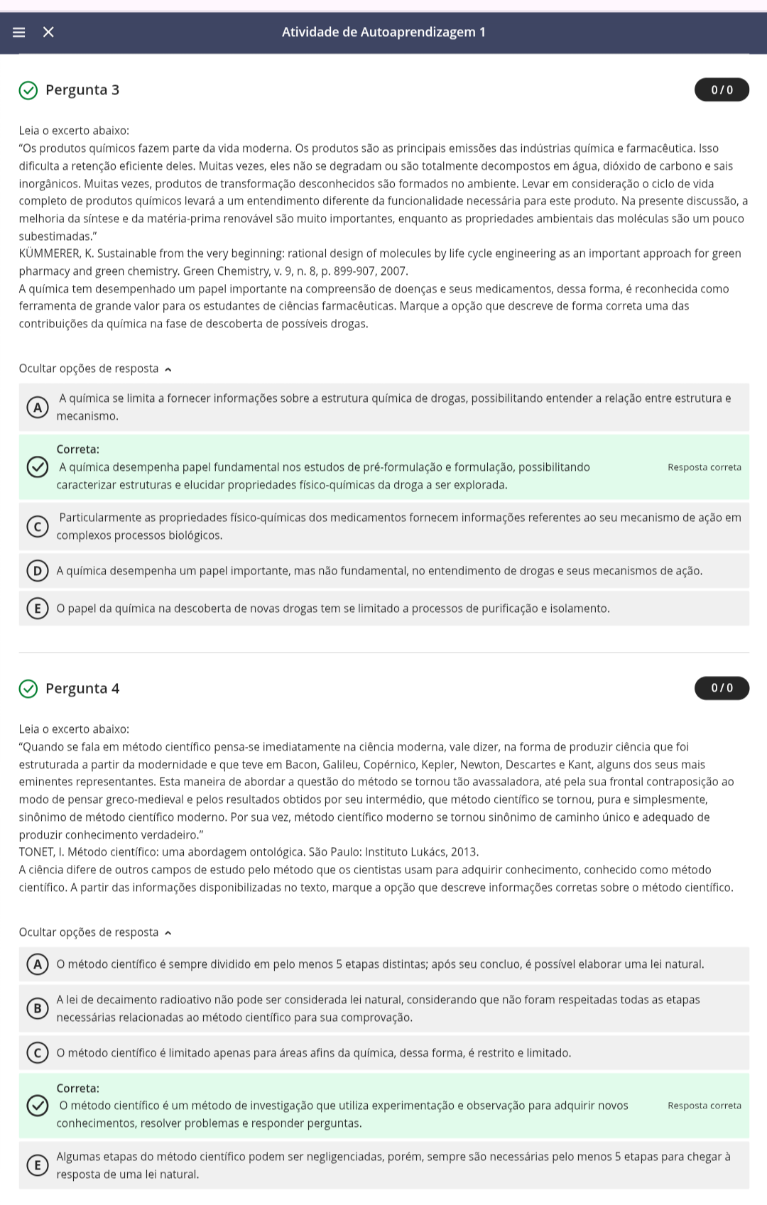 Atividade de Autoaprendizagem 1 Pergunta 3 0/0 Leia O excerto abaixo: "Os produtos químicos fazem parte da vida moderna. Os produtos são as principais emissões das indústrias química e farmacêutica. Isso dificulta a retenção eficiente deles. Muitas vezes, eles não se degradam ou são totalmente decompostos em água, dióxido de carbono e sais inorgânicos. Muitas vezes, produtos de transformação desconhecidos são formados no ambiente. Levar em consideração ciclo de vida completo de produtos químicos levará a um entendimento diferente da funcionalidade necessária para este produto. Na presente discussão, a melhoria da e da matéria-prima renovável são muito importantes, enquanto as propriedades ambientais das moléculas são um pouco subestimadas." K. Sustainable from the very beginning: rational design of molecules by life cycle engineering as an important approach for green pharmacy and green chemistry. Green Chemistry, V. 9, n. 8, p. 899-907, 2007. A química tem desempenhado um papel importante na compreensão de doenças e seus medicamentos, dessa forma, é reconhecida como ferramenta de grande valor para os estudantes de ciências farmacêuticas. Marque a opção que descreve de forma correta uma das contribuições da química na fase de descoberta de possíveis drogas. Ocultar opções de resposta A química se limita a fornecer informações sobre a estrutura química de drogas, possibilitando entender a relação entre estrutura e A mecanismo. Correta: A química desempenha papel fundamental nos estudos de pré-formulação e formulação, possibilitando Resposta correta caracterizar estruturas e elucidar propriedades físico-químicas da droga a ser explorada. Particularmente as propriedades físico-químicas dos medicamentos fornecem informações referentes ao seu mecanismo de ação em C complexos processos biológicos. D A química desempenha um papel importante, mas não fundamental, no entendimento de drogas e seus mecanismos de ação. E o papel da química na descoberta de novas drogas tem se limitado a processos de purificação e isolamento. Pergunta 4 0/0 Leia O excerto abaixo: "Quando se fala em método científico pensa-se imediatamente na ciência moderna, vale dizer, na forma de produzir ciência que foi estruturada a partir da modernidade e que teve em Bacon, Galileu, Copérnico, Kepler, Newton, Descartes e Kant, alguns dos seus mais eminentes representantes. Esta maneira de abordar a questão do método se tornou tão avassaladora, até pela sua frontal contraposição ao modo de pensar greco-medieval e pelos resultados obtidos por seu intermédio, que método se tornou, pura e simplesmente, sinônimo de método científico moderno. Por sua vez, método moderno se tornou sinônimo de caminho único e adequado de produzir conhecimento verdadeiro." TONET, I. Método uma abordagem ontológica. São Paulo: Instituto 2013. A ciência difere de outros campos de estudo pelo método que os cientistas usam para adquirir conhecimento, conhecido como método A partir das informações disponibilizadas no texto, marque a opção que descreve informações corretas sobre método Ocultar opções de resposta A o método científico é sempre dividido em pelo menos 5 etapas distintas; após seu concluo, é possível elaborar uma lei natural. A lei de decaimento radioativo não pode ser considerada lei natural, considerando que não foram respeitadas todas as etapas B necessárias relacionadas ao método para sua comprovação. C o método é limitado apenas para áreas afins da química, dessa forma, é restrito e limitado. Correta: o método é um método de investigação que utiliza experimentação e observação para adquirir novos Resposta correta conhecimentos, resolver problemas e responder perguntas. Algumas etapas do método podem ser negligenciadas, porém, sempre são necessárias pelo menos 5 etapas para chegar à E resposta de uma lei natural.