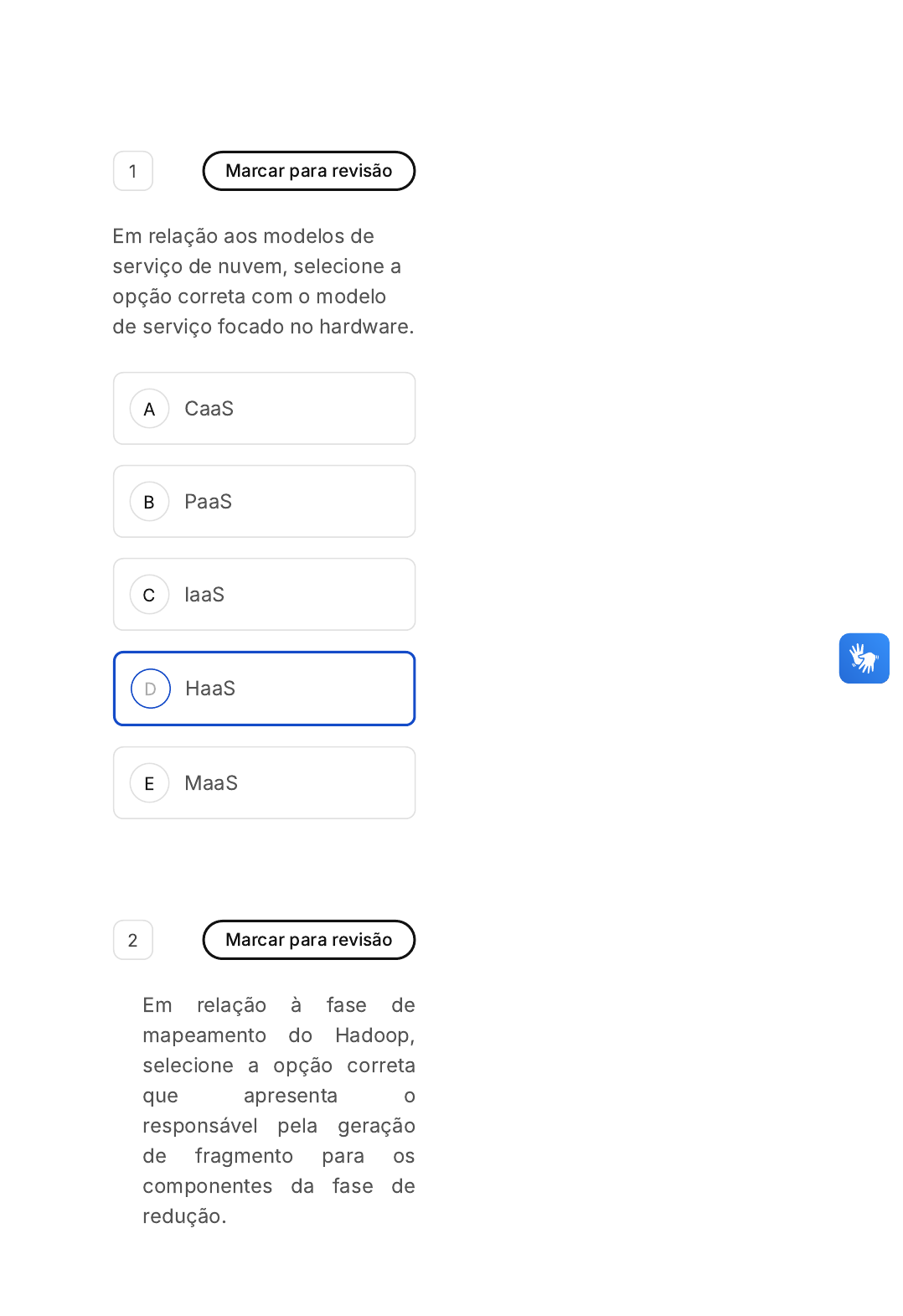 A B C D E 1 Marcar para revisão Em relação aos modelos de serviço de nuvem, selecione a opção correta com o modelo de serviço focado no hardware. CaaS PaaS IaaS HaaS MaaS 2 Marcar para revisão Em relação à fase de mapeamento do Hadoop, selecione a opção correta que apresenta o responsável pela geração de fragmento para os componentes da fase de redução. A B C D E A B C D E Leitor de registros. Mapeador. Redutor. Particionador. Combinador. 3 Marcar para revisão Os dados que, por alguma razão, normalmente interferência humana, não chegam com todos os atributos esperados durante a coleta de dados, são conhecidos como: Faltantes. Corrompidos. Nulos. Enviesados. Embaralhados. A B C D E 4 Marcar para revisão Quais os métodos de aprendizado de máquina que existem? Aprendizado Supersticioso, Não- Supervisionado, Por Reforço, e Semisupervisionado Aprendizado Supervisionado, Não- Supervisionado, Por Reforço, e Semisupervisionado Aprendizado Supervisionado, Escondido, Por Reforço, e Semisupervisionado Aprendizado Supervisionado, Não- Supervisionado, Por Força Bruta, e Semisupervisionado Aprendizado Supervisionado, Não- Supervisionado, Por Reforço, e Aleatório A B C D E 5 Marcar para revisão O boom da IA se deve ao surgimento de novas tecnologias e dispositivos que por estarem sempre conectados produzem uma quantidade enorme de dados. Estes dados que alimentam os modelos de aprendizado de máquina também são conhecidos como: Big Data. Informações. Conhecimento. Dados Faltantes. Observações. 6 Marcar para revisão Em relação às características do processamento de fluxo de dados, selecione a opção correta. A B C D E A B São invariáveis no tempo O fluxo de dados é intermitente São relacionados à aplicações de internet das coisas Sempre são do mesmo tipo Representam o estado de um sistema em um dado momento 7 Marcar para revisão A respeito dos componentes do ecossistema do Hadoop, selecione a opção correta que apresenta o componente responsável pelo gerenciamento dos clusters. HBase HCluster Prova AV Tópicos De Big Data Em Python C D E A B C D E Flume Spark Zookeeper 8 Marcar para revisão A biblioteca Pandas é amplamente utilizada para manipular dados heterogêneos, situação recorrente para aplicações de Big Data. Nesse sentido, selecione a opção que contém a estrutura de dados que possibilita o Cientista de dados atribuir nome para as colunas. DataFrame PySpark SQL RDD numpy.array 00 hora : 41 min : 30 seg Ocultar Questão 10 de 10 Respondidas �10� Em branco �0� Finalizar prova 1 2 3 4 5 6 7 8 9 10 A B C D E 9 Marcar para revisão Compreender os conceitos e princípios do framework Apache Spark é fundamental para o cientista de dados. Selecione a opção correta que contém o componente do ecossistema Spark responsável por dar suporte para tratar fluxo de dados típicos de aplicações de tempo real. Spark SQL Spark Streaming RDDs Spark Core Spark Hadoop 10 Marcar para revisão O seguinte constructo da linguagem Python representa o condicional simples: A B C D E else if for while with