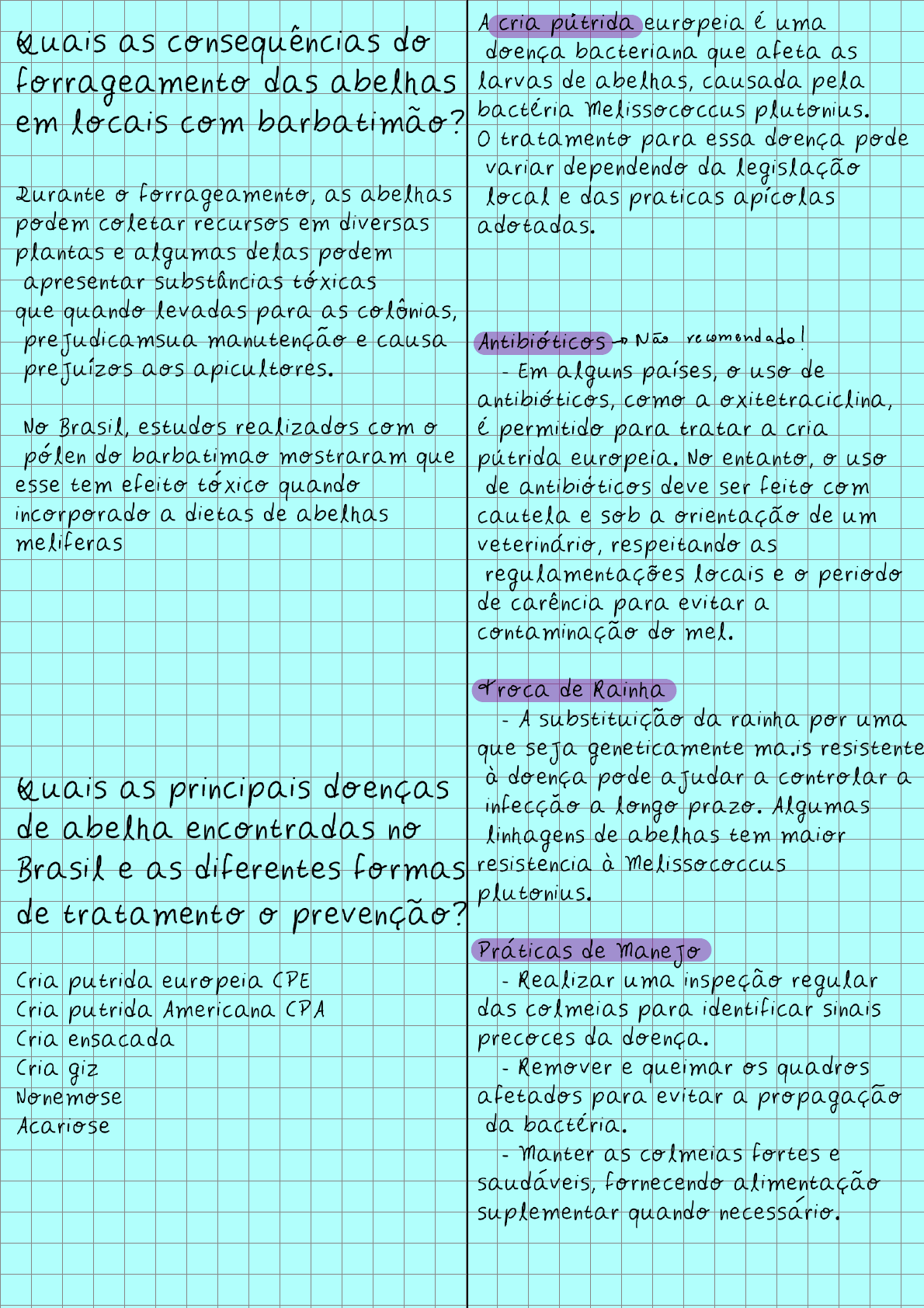 A cria europeia e uma Quais as consequências do bacteriana que afeta as forrageamento das abelhas larvas de abelhas, causada pela em locais com barbatimao? bacteria melissococcus plutonius. tratamento para essa pode variar dependendo da Durante o forrageamento, as abelhas local e das praticas apicolas podem coletar recursos em diversas adotadas. plantase algumas delas podem apresentar substancias toxicas que quando levadas para as colonias, prejudicamsua causa Antibioticos Nao prejuizos aos apicultores. Em alguns paises, o uso de antibioticos, como a oxitetraciclina, No Brasil, estudos realizados com o permitido para tratar a cria polen do barbatimao mostraram que putrida europeia. No entanto, uso esse tem efeito toxico quando de antibioticos deve ser feito com incorporado a dietas de abelhas cautela e sob a orientação de um meliferas respeitando as locais e o periodo de carência para evitar a contaminação do mel. troca de Rainha - A substituição da rainha por uma que seja geneticamente ma. is resistente Quais as principais doencas a pode a Judar a controlar a a longo prazo. Algumas de abelha encontradas no linhagens de abelhas tem maior Brasil e as diferentes formas resistencia melissococcus plutonius. de tratamento o de mane Jo Cria putrida europeia CPE - Realizar uma inspeção regular Cria putrida Americana CPA das colmeias para identificar sinais Cria ensacada precoces da Cria giz - Remover e queimar os quadros Nonemose afetados para evitar a Acariose da bacteria. - Manter as colmeias fortese saudaveis, fornecendo suplementar quando necessario.Controle Natural Cria Pútrida Americana (CPA) - Em alguns casos, o controle da doença pode ser obtido sem uso de Agente causador: a é causada antibioticos, utilizando métodos pela Paenibacillus larvae naturais como a e a subsp larvae. As larvas são infectadas troca regular de favo para reduzir quando comem alimento contaminado. a carga bacteriana. e danos: no Brasil, foram isolados esporos dessa - Equipamentos e ferramentas usados em abelhas e mel provenientesde colmeias na colmeia devem ser desinfetados sem sintomas da doença, no Estado do Rio para prevenir a da grande do Sul. A contaminação pode ter bacteria. ocorrido pela alimentação das abelhas com mel e polen importados, contaminados Importante: Antes de iniciar qualquer com a ou mesmo pela coleta, tratamento, e essencial confirmar por abelhas campeiras, de alimento diagnpstico de cria putrida europeia, contaminado em entreposto. Nesse caso, pois os sintomas podem ser governo brasileiro tomou medidas semelhantes a outras doenças de imediatas para erradicação desse abelhas. tratamento adequado deve sempre seguir as orientaçoes de um patogeno naquela profissional veterinario especializado Esta doença pode provocar sérios em apicultura. prejuizos, pois seu controle é bastante A bacteria produz esporos que sobrevivem no alimento larval e restos de larvas de abelhas mortas (escamas) por muitos anos. Esses esporos são altamente resistentes ao calor, a desidratação, a luz solar direta e desinfecção por diversos produtos quimicos Sintomas: Favos de cria falhados com perfurados, escurecidos e afundados. A cria morre na fase larva (pré-pupa) ou pupa, quando corpo em posição vertical na célula. Larvas com mudança de cor, passando do para amarelo até marrom-escuro.Cheiro pútrido da cria (pré-pupa ou pupa). Brasileira de Apicultura As larvas mortas apresentam consistência (CBA), Superintendência Federal de viscosa, principalmente quando apresentam Agricultura, Agência Nacional de coloração Para verificar Sanitária (ANVISA). esse sintoma, deve-se fazer teste do palito que consiste em inserir um palito Enviar amostras dos favos com sintomas de madeira (como de ou similar) para analise em na cria, esmagá-la e puxar palito especializados no diagnostico de devagar, observando se ocorre a doenças de abelhas. de um fio viscoso e longo, Limpar equipamentos de maneJo (luvas, com 2.5cm ou mais formão, fumigador etc.) e não nas colonias sadias. Quando a morte ocorre na fase de pupa, A esterilização de equipamentos pode observa-se geralmente a lingua da ser feita com hipoclorito de sodio pupa estendida de um lado para outro (agua do comprovação da doença por meio No final da doença, a cria fica do resultado da analise laboratorial, escura e ressecada formando escamas destruir as colonias afetadas. Para finas e achatadas, geralmente de cor isso, pode-se optar pela queima da marrom ou preta, que ficam aderidas nas colméia completa ou se o apicultor paredes do alvéolo e de difícil remoção quiser preservar as caixas, deve matar Para observar as escamas é importante ter as abelhas adultas e depois queima-las boa iluminação. Juntamente com os favos. Para reaproveitamento das caixas, as mesmas e devem ser esterilizadas. Não utilizar antibioticos para tratamento preventivo ou curativo, pois pode A esterilização das caixas pode ser levar a resistência da bactéria e contaminar feita de duas maneiras: mergulhando os produtos da colméia, além de ser um as peças em parafina a 160 graus gasto adicional para apicultor. durante 10 minutos ou em solução de tratamento preventivo pode ainda "esconder" hipoclorito de a 0.5% durante os sintomas da doença. 20 minutos. Quando apicultor suspeitar da da CPA em seu deve tomar as Para evitar a disseminação dessa seguintes medidas: grave doença no Brasil, os apicultores marcar as com sintomas de CPA. devem estar bastante atentos para nunca utilizarem mel ou polen Realizar sobre as colonias importados para alimentação de suas afetadas e relatar a ocorrência para sua abelhas no de entressafra, associação e instituições competentes, tais pois podem estar contaminados e, como: instituições de ensino e pesquisa que consequentemente, contaminará as trabalhem com Apicultura, colmeias.Esses produtos (mel e polen importados) Cria ensacada poderão ser vendidos a preços baixos, Agente vários a parecendo ser vantaj