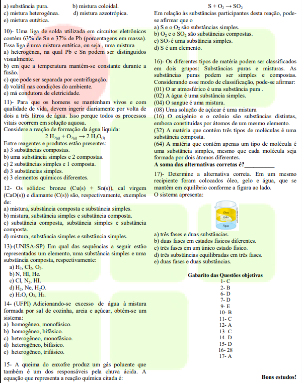 a) substância pura. b) mistura coloidal c) mistura heterogênea. d) mistura Em relação às substâncias participantes desta reação, pode- e) mistura eutética. se afirmar que o a) o são substâncias simples. 10)- Uma liga de solda utilizada em circuitos eletrônicos b) e o SO2 são substâncias compostas. contém 63% de Sn e 37% de Pb (porcentagens em massa). c) SO2 é uma substância simples. Essa liga é uma mistura eutética, ou uma mistura d) S é um a) heterogênea, na qual Pb e Sn podem ser distinguidos 16)- Os diferentes tipos de matéria podem ser classificados b) em que a temperatura constante durante a em dois grupos: Substâncias puras e misturas. As substâncias puras podem ser simples e compostas. c) que pode ser separada por centrifugação. Considerando esse modo de classificação, pode-se d) nas condições do (01) O ar é uma substância pura e) ma condutora de (02) A água é uma substância simples. 11)- Para que os homens se mantenham vivos e com (04) sangue é uma qualidade de vida, devem ingerir diariamente por volta de (08) Uma solução de é uma mistura dois a três litros de água. Isso porque todos os processos (16) O oxigênio e ozônio são substâncias distintas, vitais ocorrem em solução aquosa. embora por átomos de um mesmo elemento Considere a reação de formação da água (32) A matéria que três tipos de moleculas é uma substância composta. Entre reagentes e produtos estão presentes: (64) A matéria que apenas um tipo de é a) 3 compostas. uma substância simples, mesmo que cada molecula seja b) uma substância simples e 2 compostas. formada por dois atomos c) 2 substâncias simples e 1 composta. A soma das alternativas corretas é? d) 3 substâncias simples. 17)- Determine a alternativa Em um mesmo e) 3 elementos químicos recipiente foram colocados gelo e água, que se 12- Os sólidos: bronze (Cu(s) Sn(s)), cal virgem mantêm em equilibrio conforme a figura ao lado. (CaO(s)) e diamante (C(s)) são, respectivamente, exemplos O sistema apresenta: de: a) mistura. substância composta e substância simples. b) mistura, substância simples e substância composta. c) substância composta, substância simples e substância composta. d) mistura, substância simples e substância simples. a) três fases e duas b) duas fases em estados fisicos 13)-(UNISA-SP) Em qual das sequências a seguir estão c) três fases em um único estado representados um elemento, uma substância simples e uma d) três substâncias equilibradas em três fases. substância composta, respectivamente: e) duas fases e duas a) O2. b) N. HI, Gabarito das Questões objetivas c) Cl, HI. C d) Ne. H-O. 2- e) H2O. 6- D D 14- (UFPI) Adicionando-se excesso de água à mistura 9- formada por sal de cozinha, areia e açucar, um 10- B sistema: 11- C a) homogêneo, 12- A b) 13- C c) heterogêneo, 14- D d) heterogêneo, 15- D e) 16-28 17-A 15- A queima do enxofre produz um poluente que também é um dos responsáveis pela chuva A equação que representa a reação quimica citada é: Bons estudos!