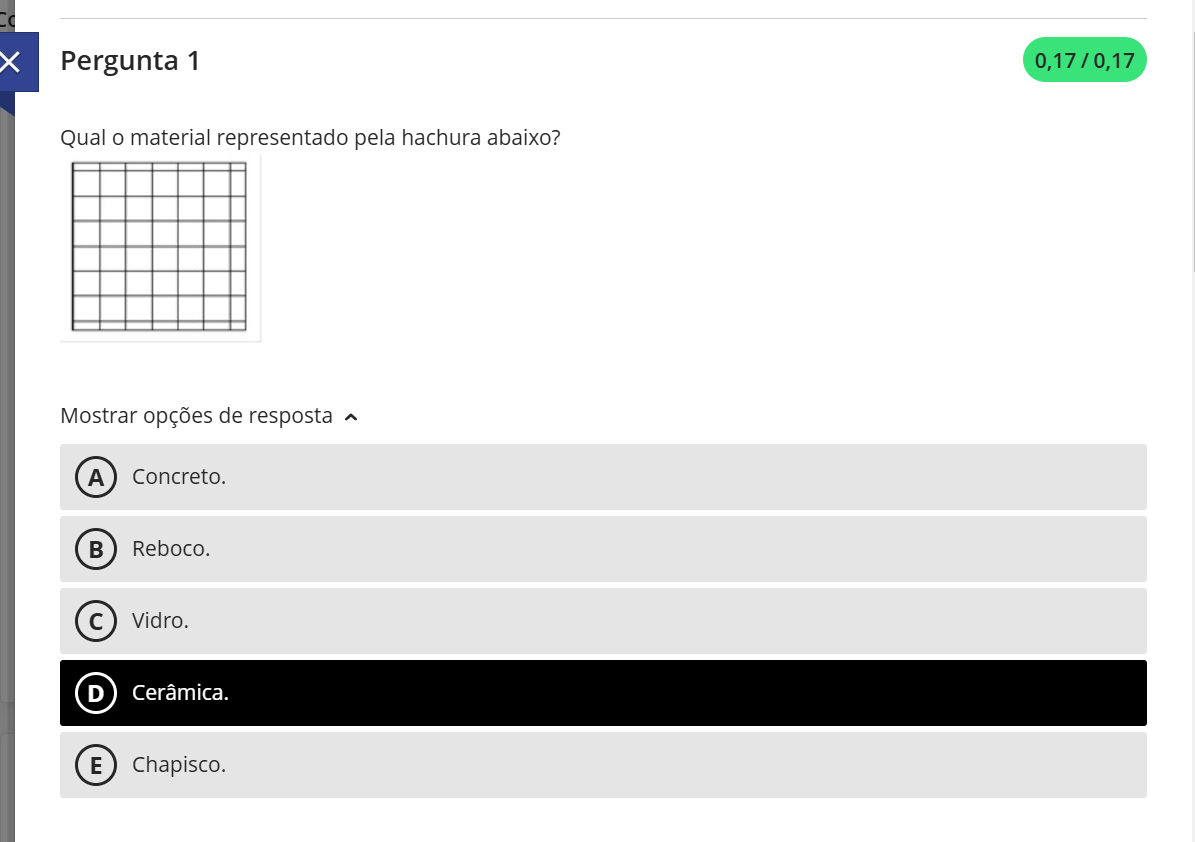 Pergunta 1 Qual o material representado pela hachura abaixo? Mostrar opções de resposta A Concreto. B Reboco. Vidro. D Cerâmica. E Chapisco.