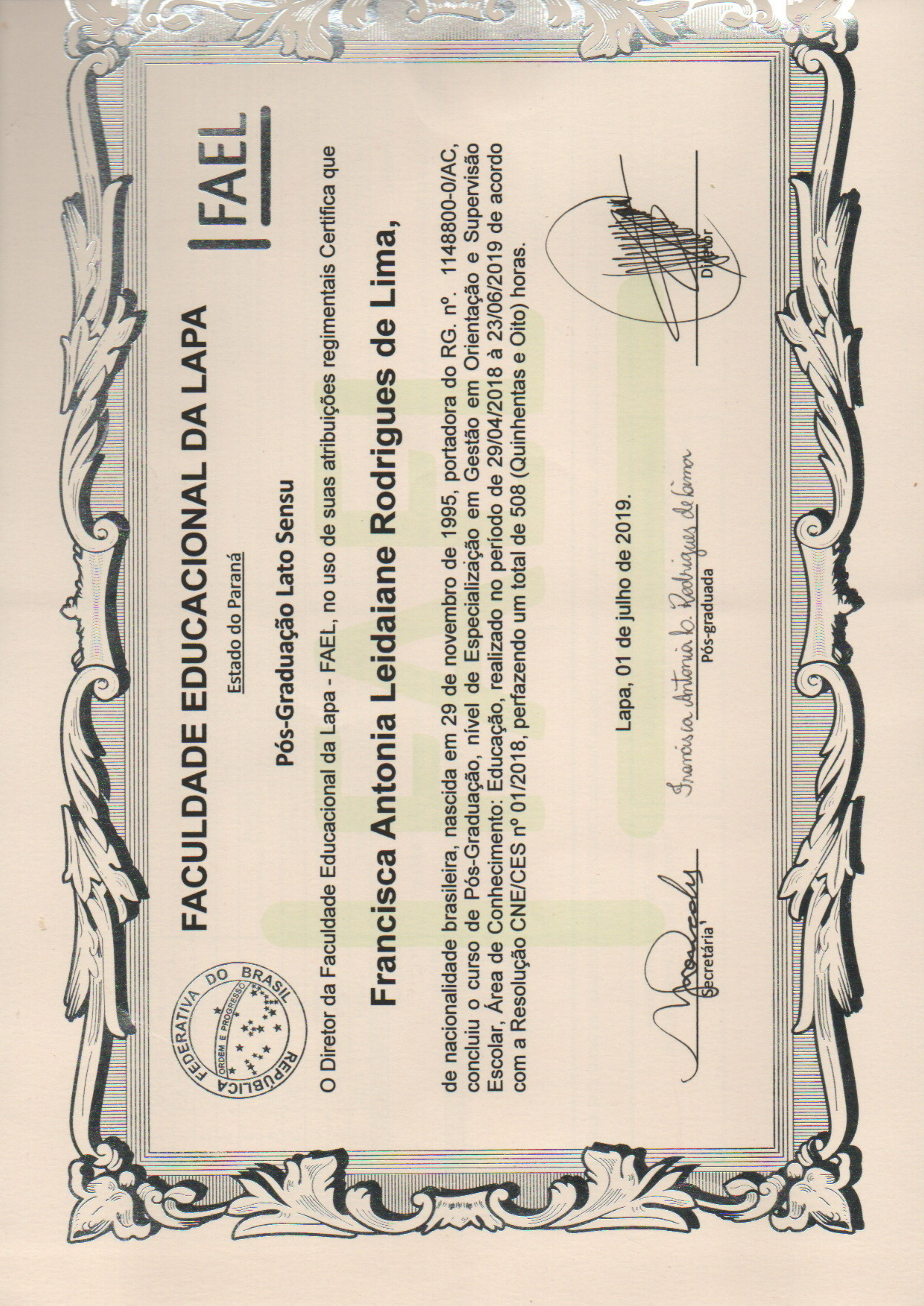 FEDERATIVA FACULDADE EDUCACIONAL DA LAPA ORDEM * E DO Estado do Paraná FAEL Pós-Graduação Lato Sensu o Diretor da Faculdade Educacional da Lapa - FAEL, no uso de suas atribuições regimentais Certifica que Francisca Antonia Leidaiane Rodrigues de Lima, de nacionalidade brasileira, nascida em 29 de novembro de 1995, portadora do RG. 1148800-0/AC concluiu o curso de Pós-Graduação, nível de Especialização em Gestão em Orientação e Supervisão Escolar, Área de Conhecimento: Educação, realizado no período de 29/04/2018 à 23/06/2019 de acordo com a Resolução CNE/CES 01/2018, perfazendo um total de 508 (Quinhentas e Oito) horas. Lapa, 01 de julho de 2019. Francisca Antonia Rodrigues de Pós-graduadaHISTÓRICO Disciplina CH Docente Titulação Nota Conc. Freq. Avaliação da Educação e da Aprendizagem 51 Ana Maria Soek Mestra 10,00 A 100% Didática 82 Líliam Maria Born Martinelli Mestra 10,00 A 100% Formação Docente para a Diversidade 30 Mirian Ramos Marques Pimentel Mestra 9,00 A 100% Gestão Educacional e Organização do Trabalho Pedagógico 28 Mônica Cristiane David Mestra 10,00 A 100% Gestão Educacional: direção, coordenação e supervisão 83 Mirian Ramos Marques Pimentel Mestra 10,00 A 100% Gestão Escolar 32 Eliana Claudia Graciliano Mestra 10,00 A 100% Legislação Educacional 30 Juliana Tortato Monteschio Mestra 9,00 A 100% Múltiplas Competências para os Profissionais da Educação 30 Maria de Lourdes Mazza De Farias Doutora 7,00 C 100% Princípios e Métodos de Supervisão e Orientação Educacional 52 Mônica Cristiane David Mestra 9,00 A 100% Metodologia da Pesquisa Científica 30 Uipirangi Franklin da Silva Camara Doutor 9,00 A 100% Carga Horária Título do Artigo Científico Livro de Registro: Disciplinas: 448 GESTÃO ESCOLAR NAS ESCOLAS RURAIS DA REGIONAL DOS IGARAPÉS DE PORTO Certificado registrado sob n° 8402 na TCC: 60 folha 481 do livro n° 05 da TOTAL: 508 WALTER- ACRE Faculdade Educacional da Lapa. Legenda Conceito A: 9,00 a 10,00 Conceito B: 8,00 a 8,90 Nota: 9,50 Conceito: A Orientador(a): Valter Zotto de Andrade Lapa,01 de julho de 2019. Conceito C: 7,00 a 7,90 Conceito D: Insuficiente Avaliação: Avaliação Interdisciplinar Nota: 7,00 o presente curso de Pós-Graduação Lato Sensu em nível de Especialização, cumpriu todas as disposições e normas da Resolução CNE/CES n° 01/2018 publicado no D.O.U n° 67 de 09/04/2018, seção 1 pg.43. FACULDADE EDUCACIONAL DA LAPA Recredenciamento para oferta de cursos em EAD: Diretor: Fabio Heinzen Fonseca Recredenciada pela Portaria n° 197 de 2016. Portaria 756 de 2017, publicada no D.O.U. Secretária: Márcia Helena Gonçales Publicada no D.O.U em 11 de Abril de 2016. em 23 de junho de 2017.
