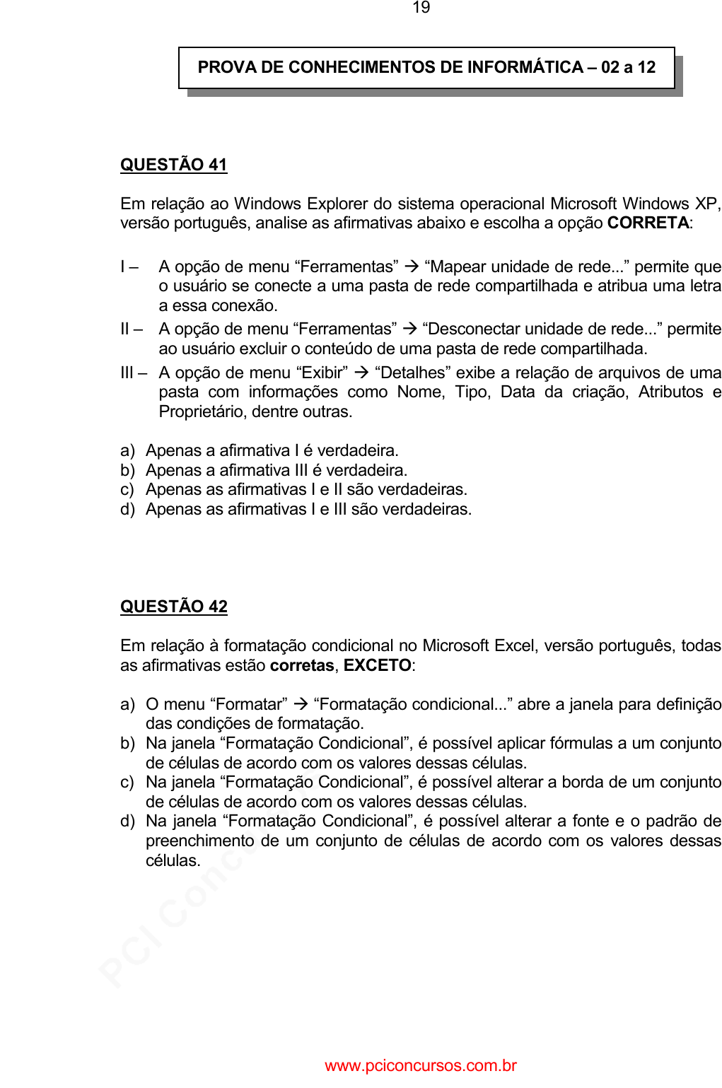 pcimarkpci MDAwMDowMDAwOjAwMDA6MDAwMDowMDAwOmZmZmY6YmZiOTphZTFk:V2VkLCAxMiBGZWIgMjAyNSAxODoxNzoxOCAtMDMwMA== www.pciconcursos.com.br 19 QUESTÃO 41 Em relação ao Windows Explorer do sistema operacional Microsoft Windows XP, versão português, analise as afirmativas abaixo e escolha a opção CORRETA: I – A opção de menu “Ferramentas” � “Mapear unidade de rede...” permite que o usuário se conecte a uma pasta de rede compartilhada e atribua uma letra a essa conexão. II – A opção de menu “Ferramentas” � “Desconectar unidade de rede...” permite ao usuário excluir o conteúdo de uma pasta de rede compartilhada. III – A opção de menu “Exibir” � “Detalhes” exibe a relação de arquivos de uma pasta com informações como Nome, Tipo, Data da criação, Atributos e Proprietário, dentre outras. a) Apenas a afirmativa I é verdadeira. b) Apenas a afirmativa III é verdadeira. c) Apenas as afirmativas I e II são verdadeiras. d) Apenas as afirmativas I e III são verdadeiras. QUESTÃO 42 Em relação à formatação condicional no Microsoft Excel, versão português, todas as afirmativas estão corretas , EXCETO: a) O menu “Formatar” � “Formatação condicional...” abre a janela para definição das condições de formatação. b) Na janela “Formatação Condicional”, é possível aplicar fórmulas a um conjunto de células de acordo com os valores dessas células. c) Na janela “Formatação Condicional”, é possível alterar a borda de um conjunto de células de acordo com os valores dessas células. d) Na janela “Formatação Condicional”, é possível alterar a fonte e o padrão de preenchimento de um conjunto de células de acordo com os valores dessas células. PROVA DE CONHECIMENTOS DE INFORMÁTICA – 02 a 12 www.pciconcursos.com.br pcimarkpci MDAwMDowMDAwOjAwMDA6MDAwMDowMDAwOmZmZmY6YmZiOTphZTFk:V2VkLCAxMiBGZWIgMjAyNSAxODoxNzoxOCAtMDMwMA== www.pciconcursos.com.br 20 QUESTÃO 43 Em relação ao Microsoft Word 2003, versão português, todas as afirmativas estão corretas , EXCETO: a) A opção de menu “Inserir” � “Data e hora...” permite inserir diferentes formatos de datas e horas. b) Para inserir uma figura a partir de um arquivo, deve-se acessar a opção de menu “Inserir” � “Arquivo...”. c) A opção de menu “Ferramentas” � “Idioma” � “Definir idioma...” permite definir o idioma de um texto selecionado. d) As opções de “Estilo da Fonte” na janela aberta pela opção de menu “Formatar” � “Fonte” permitem definir o estilo da fonte para regular, negrito, itálico ou negrito itálico. QUESTÃO 44 Em relação ao Microsoft Power Point 2003, versão português, analise as afirmativas abaixo e assinale a opção CORRETA: I – A opção do menu “Formatar” � “Layout do slide...” permite aplicar layouts de texto e conteúdo a um slide. II – A opção de menu “Formatar” � “Animação...” permite adicionar efeitos de entrada, saída e ênfase em objetos de um slide. III – A opção de menu “Apresentações” � “Transição de slides...” permite configurar a velocidade, o som e o efeito desejado na transição entre slides. a) As afirmativas I, II e III são verdadeiras. b) Apenas as afirmativas I e II são verdadeiras. c) Apenas as afirmativas I e III são verdadeiras. d) Apenas as afirmativas II e III são verdadeiras. QUESTÃO 45 Em relação à janela “Opções da Internet” acessível pelo menu “Ferramentas” � “Opções da Internet” do Internet Explorer 7.0, versão português, analise as afirmativas abaixo e assinale a opção CORRETA: I – “Geral”, “Conexões” e “Avançadas” são guias presentes nesta janela. II – O botão “Excluir...” da guia “Geral” permite a exclusão dos arquivos de internet temporários, dos cookies, do histórico da navegação e dos dados de formulários e senhas. III – Na guia “Conexões” é possível configurar um servidor proxy a ser utilizado. a) As afirmativas I, II e III são verdadeiras. b) Apenas as afirmativas I e II são verdadeiras. c) Apenas as afirmativas I e III são verdadeiras. d) Apenas as afirmativas II e III são verdadeiras. www.pciconcursos.com.br