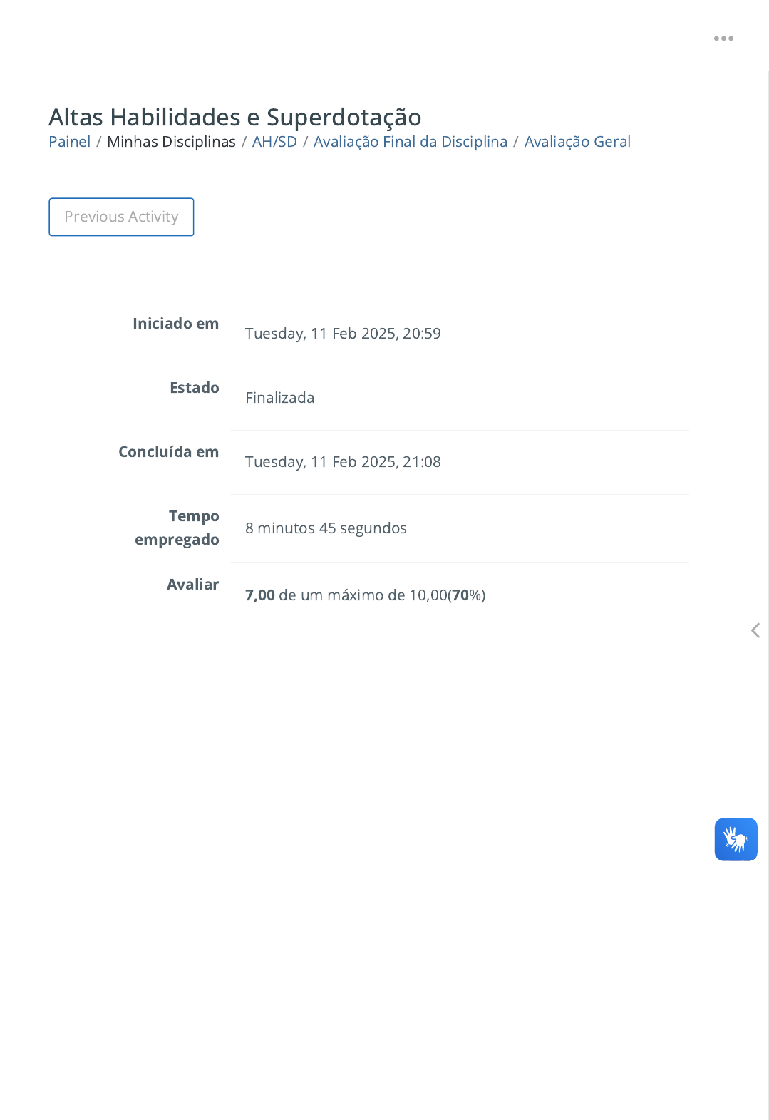 Painel / Minhas Disciplinas / AH/SD / Avaliação Final da Disciplina / Avaliação Geral Altas Habilidades e Superdotação Previous Activity Iniciado em Tuesday, 11 Feb 2025, 20:59 Estado Finalizada Concluída em Tuesday, 11 Feb 2025, 21:08 Tempo empregado 8 minutos 45 segundos Avaliar 7,00 de um máximo de 10,00(70%) https://lms.alunosnet.com/faconnect/my/ https://lms.alunosnet.com/faconnect/my/ https://lms.alunosnet.com/faconnect/course/view.php?id=2604 https://lms.alunosnet.com/faconnect/course/view.php?id=2604#section-6 https://lms.alunosnet.com/faconnect/mod/quiz/view.php?id=26387 https://lms.alunosnet.com/faconnect/mod/page/view.php?id=26395 https://lms.alunosnet.com/faconnect Questão 1 Correto Atingiu 1,00 de 1,00 O bullying que ocorre de maneira velada, como o isolamento social e a difamação, pode ser particularmente prejudicial para alunos com altas habilidades/superdotação, que muitas vezes já se sentem isolados devido às suas diferenças. A identificação precoce dessas formas de bullying é crucial para intervenções eficazes. Qual das seguintes ações é fundamental para identificar e intervir eficazmente em casos de bullying velado? Escolha uma opção: Sua resposta está correta. a. Incentivar os alunos a resolverem seus conflitos sem intervenção adulta. b. Esperar que os alunos relatem os incidentes antes de tomar qualquer medida. c. Focar apenas em casos de bullying físico, que são mais fáceis de identificar. d. Treinar professores e funcionários para reconhecer sinais sutis de exclusão e difamação. https://lms.alunosnet.com/faconnect Questão 2 Correto Atingiu 1,00 de 1,00 As características dos alunos com altas habilidades/superdotação vão além das habilidades cognitivas elevadas, abrangendo também aspectos emocionais e sociais que podem influenciar seu desenvolvimento e aprendizado. É importante compreender essas características para oferecer um atendimento educacional adequado a esses alunos. A seguinte característica é frequentemente observada em alunos com altas habilidades/superdotação: Escolha uma opção: Sua resposta está correta. a. comportamento passivo e falta de interesse em aprender. b. dificuldade em lidar com desafios acadêmicos e baixa criatividade. c. grande curiosidade intelectual, criatividade, autonomia, intensidade emocional e sensibilidade social. d. dificuldade extrema de aprendizagem e baixa autoestima. https://lms.alunosnet.com/faconnect Questão 3 Correto Atingiu 1,00 de 1,00 Crianças com fobia social podem se beneficiar significativamente de um ambiente escolar de suporte que reconheça e acomode suas necessidades. Estratégias específicas podem ajudar a minimizar a ansiedade em situações de avaliação e interação social. Qual das seguintes medidas pode ser adotada por escolas para apoiar crianças com fobia social? Escolha uma opção: Sua resposta está correta. a. Exigir que as crianças participem de apresentações em público para superar o medo. b. Estruturar atividades em grupo de forma a promover a inclusão e reduzir a pressão. c. Minimizar oportunidades de interação social para evitar constrangimentos. d. Ignorar as necessidades especiais e tratar todas as crianças de maneira uniforme. https://lms.alunosnet.com/faconnect Questão 4 Correto Atingiu 1,00 de 1,00 Analise as afirmativas abaixo de acordo com a Diretriz Específica para o Atendimento de Estudantes com Altas Habilidades ou Superdotação (BRASIL, 2022). 1. O termo “altas habilidades” enfatiza os aspectos que são moldados, modificados e enriquecidos pelo papel do ambiente (família, escola, cultura). 2. O termo “superdotação” faz referência aos aspectos inatos e genéticos da inteligência e da personalidade. 3. O termo “altas habilidades” faz referência aos aspectos inatos e genéticos da inteligência e da personalidade. 4. O termo “superdotação” enfatiza os aspectos que são moldados, modificados e enriquecidos pelo papel do ambiente (família, escola, cultura). Assinale a alternativa que indica todas as afirmativas corretas. Escolha uma opção: Sua resposta está correta. a. São corretas apenas as afirmativas 2 e 3. b. São corretas apenas as afirmativas 1 e 3. c. São corretas apenas as afirmativas 1 e 2. d. São corretas apenas as afirmativas 1 e 4. https://lms.alunosnet.com/faconnect Questão 5 Correto Atingiu 1,00 de 1,00 A fobia social, também conhecida como transtorno de ansiedade social, pode ser particularmente desafiadora durante a infância, impactando significativamente as interações sociais e o desempenho escolar. Crianças com fobia social frequentemente experimentam medo intenso e persistente de situações em que podem ser julgadas ou escrutinadas por outros, o que pode levar ao isolamento social e a dificuldades acadêmicas. Qual das seguintes abordagens terapêuticas é comumente recomendada para tratar a fobia social em crianças? Escolha uma opção: Sua resposta está correta. a. Encorajamento para suprimir sentimentos de ansiedade e continuar as atividades diárias sem ajustes. b. Uso exclusivo de medicação sem acompanhamento psicológico. c. Evitar qualquer forma de exposição social para reduzir a ansiedade. d. Técnicas de exposição gradual em ambientes controlados para reduzir a ansiedade. https://lms.alunosnet.com/faconnect Questão 6 Correto Atingiu 1,00 de 1,00 O desenvolvimento cognitivo em indivíduos com altas habilidades/superdotação (AH/SD) é profundamente influenciado por uma combinação de fatores ambientais, emocionais e educacionais. Este desenvolvimento não apenas realça habilidades cognitivas avançadas, mas também envolve desafios únicos, incluindo a necessidade de ajuste emocional adequado que pode afetar o sucesso profissional e pessoal desses indivíduos. Qual dos seguintes fatores é considerado crucial para facilitar o desenvolvimento cognitivo saudável em indivíduos com AH/SD? Escolha uma opção: Sua resposta está correta. a. Apoio em