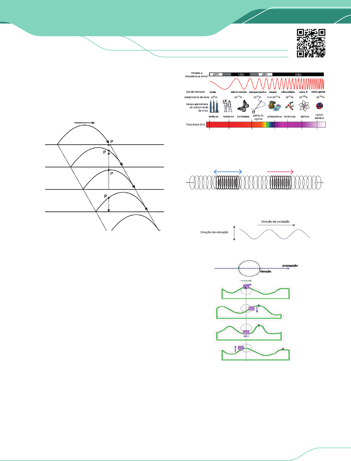 FÍSICA I PRÉ-VESTIBULAR 187PROENEM.COM.BR ONDULATÓRIA29 INTRODUÇÃO As ondas se caracterizam por propagarem energia, sem haver transporte de matéria, ou seja, a onda não transporta o meio onde se propaga; é a energia que se propaga, passando de partícula para partícula ou através de um campo eletromagnético. Veja, na fi gura, que a onda passa, e o ponto P continua na mesma abscissa todo o tempo. Nem todas as ondas podem ser percebidas pelo sentido da visão, algumas só podem ser ouvidas e outras nem vistas e nem ouvidas. ONDAS PERIÓDICAS Uma onda periódica é gerada por abalos sucessivos idênticos em intervalos de tempo iguais. A propagação de um único abalo recebe o nome de pulso de onda. Chamamos de elongação a altura y de cada ponto em relação à posição inicial. CLASSIFICAÇÃO DAS ONDAS QUANTO À NATUREZA Em relação à sua natureza, as ondas podem ser: mecânicas ou eletromagnéticas. As ondas mecânicas necessitam de um meio material para se propagarem, ou seja, não se propagam no vácuo. As ondas que se propagam em cordas e os sons são exemplos de ondas mecânicas. As ondas eletromagnéticas conseguem se propagar no vácuo e são formadas por um campo elétrico e um campo magnético perpendiculares entre si e a direção de propagação. No vácuo, todas as ondas eletromagnéticas se propagam com a velocidade de aproximadamente 300.000 km/s e em meios materiais essa velocidade diminui. O espectro eletromagnético mostra todas as ondas eletromagnéticas: QUANTO À DIREÇÃO DE VIBRAÇÃO As ondas longitudinais produzem vibrações na mesma direção da propagação, por exemplo, os sons. direção de vibração direção de propagação As ondas transversais provocam perturbações no meio em uma direção perpendicular à direção de vibração. Toda onda eletromagnética é transversal, mas nem toda onda transversal é eletromagnética. As ondas mistas são longitudinais e transversais; e têm como exemplo as ondas em superfícies de líquidos. QUANTO AO NÚMERO DE DIMENSÕES Quando a onda se distribui linearmente, dizemos que ela se constitui em uma onda unidimensional (uma dimensão), como exemplo, uma onda que se propaga em um fi o esticado. Em duas dimensões, chama-se bidimensional, como exemplo, uma onda que se propaga na superfície de uma lagoa. Caso se propague nas três dimensões, receberá o nome de tridimensional, como exemplo, o som emitido por uma fonte pontual. PRÉ-VESTIBULARPROENEM.COM.BR188 FÍSICA I 29 ONDULATÓRIA CONCEITOS IMPORTANTES AMPLITUDE (A) Podemos definir amplitude como a máxima deformação de uma onda. Sabe-se que em uma corda todos os pontos oscilam apenas verticalmente. Nesse caso, a amplitude é a distância entre a posição de equilíbrio deste ponto e a altura máxima ou mínima. Em uma propagação conservativa onde não há perdas de energia, a amplitude se conserva, porém, quando ocorre perdas, ou seja, propagação dissipativa; a amplitude vai diminuindo. Dizemos que um ponto se constitui de um vale ou depressão quando ele está localizado, em relação ao eixo Y, o mais abaixo possível, isto é, ordenada -A. Na figura, o ponto D caracteriza um vale. Os pontos de crista são exatamente o contrário, a ordenada é máxima (igual a A). Na figura, A representa crista. Veja a figura: COMPRIMENTO DE ONDA Podemos definir comprimento de onda (λ) como sendo a distância entre duas cristas ou dois vales sucessivos. Porém, observamos que ao marcarmos um ponto qualquer e começarmos a analisar a onda para qualquer um dos lados, podemos notar que após um certo tempo a onda volta a repetir seu desenho. A distância deste ponto ao ponto inicial é um comprimento de onda que se repetirá novamente e indefinidamente. PERÍODO (T) O período é o tempo que uma onda leva para avançar de uma distância igual ao seu comprimento de onda ou também podemos dizer que significa o tempo que um ponto qualquer da corda (tratando-se de uma oscilação em uma corda) leva para fazer uma oscilação completa. No SI, a unidade do período, assim como de tempo, é o segundo (s). FREQUÊNCIA (f) A frequência é o inverso do período; dessa forma, como o período diz o tempo necessário para uma oscilação, a frequência diz o número de oscilações em uma unidade de tempo que, no SI, é o hertz (Hz), ou s-1. 1f T = CONCORDÂNCIA E OPOSIÇÃO DE FASE Dizemos que dois pontos estão em concordância de fase quando eles possuem a mesma elongação e se movem da mesma maneira, isto é, ambos subindo ou descendo. Na figura acima, todas as cristas estão em concordância de fase, todos os vales também, mas uma crista e um vale estão em oposição de fase. Em uma onda periódica, podemos identificar infinitos pontos em concordância de fase e em oposição de fase. A distância horizontal entre dois pontos em concordância de fase é sempre igual ao comprimento de onda, enquanto a distância, na horizontal, entre dois pontos em oposição de fase é igual a meio comprimento de onda. FRENTE E RAIO DE ONDA Estes são conceitos usados somente no estudo de ondas bi e tridimensionais. A frente de onda é a fronteira entre a região já atingida pela onda e a região ainda não atingida. Apesar do nome, o raio de onda não indica a distância da frente de onda até a fonte, mas corresponde a uma reta orientada que diz a direção e o sentido de propagação da onda no meio. VELOCIDADE DE PROPAGAÇÃO DE UMA ONDA EQUAÇÃO DA ONDA HARMÔNICA Sabemos que, se a velocidade de um movimento permanece constante considera-se a fórmula abaixo, sendo ∆s o espaço percorrido e ∆t o tempo usado. Pelo estudo de ondas, sabe-se que para percorrer uma distância igual a seu comprimento de onda (λ), o tempo é o período (T), isto é, em um intervalo de tempo igual a seu período, a onda percorre uma distância igual a seu comprimento. Assim, temos: PRÉ-VESTIBULAR PROENEM.COM.BR 29 ONDULATÓRIA 189 FÍSICA I Como 1f T = , chegamos à equação da onda h