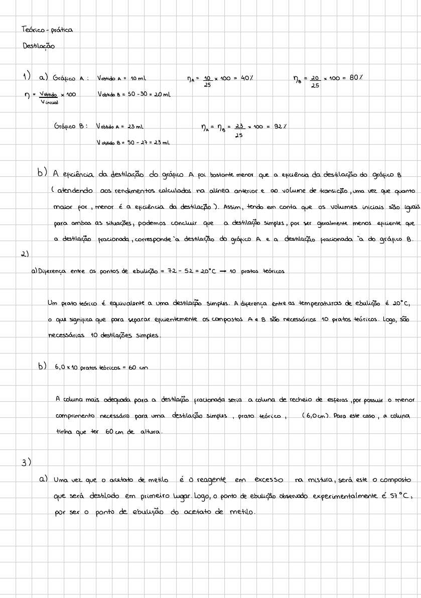 Teórico-prática Destilação 1 a Gráfico A : Vobtido A = 10 ml Da = 10 x 100 = 40 % DB = 20 X 100 = 80 % 25 D = Vobtido X 100 Vobtido B = 50 - 30 = 20m) Vinicial Gráfico B : Vobtido A = 23 m Ma = 1=23x100 = 9% Vobtido B = 50 - 27 = 23 m b A eficiência da destilação do gráfico A foi bastante menor que a eficiência da destilação do gráfico (atendendo aos rendimentos calculados na alínea anterior e ao volume de transição, uma vez que quanto maior for , menor é a eficiência da destilação) . Assim, tendo em conta que os volumes iniciais são igrais para ambas as situações , podemos concluir que a destilação simples, por ser geralmente menos eficiente que a destilação fracionada, corresponde à destilação do gráfico A e a destilação fracionada à do gráfico B. 2 a Diferença entre os pontos de ebulição = 72-52 = 20 ° C 10 pratos teóricos Um prato teórico é equivalente a uma destilação simples. A diferença entre as temperaturas de ebulição é 20 ° C, o que significa que para separar eficientemente os compostos A e B são necessários 10 pratos teóricos. Logo, são necessárias 10 destilações simples b 6 , 0 x10 pratos teóricos = 60 cm A coluna mais adequada para a destilação fracionada seria a coluna de recheio de esferas, por possuir o menor comprimento necessário para uma destilação simples , prato teórico, (6 , 0cm). Para este caso, a coluna tinha que ter 60 cm de altura. 3 a Uma vez que o acetato de metilo é o reagente em excesso na mistura, será este o composto que será destilado em primeiro Lugar. Logo, o ponto de ebulição observado experimentalmente é 57 % C, por ser o ponto de ebulição do acetato de metilo. b Mistura inicial : 0 . 35 AM e 0 . 65 C Mistura alínea a : 0 , 6 AM e 0 . 4 C 0 , 35 0 , 65 x = 0 . 6x 0 , 65 = 1 , 1143 0 , 35 0 , 65 y = 0 , 35x0 , 4 = 0 . 2154 0 , 35 0 , 65 0 , 6 se L Y 0 , 4 Resultado impossível C - Reagente limitante 10 destilado (10 a sair - 57 ° C : 0 . 6-0 . 2154 = 0 . 3846 acetato de metilo 2o destilado (20 a sair) - 65 ° C : 0 , 4 + 0 , 2154 = 0 . 6154 azeotropo (AM + C ( c) Não se destila nem clorofórmio, nem acetato de metilo puros no ponto azeotrópico, ou seja, no ponto em que a linha de composição do líquido e a linha de composição do vapor se cruzam . Assim, a composição pedida seria 0 , 35 de acetato de metilo e 0 . 65 de clorofórmio. 5 T°C TOC ----------- 102 1 = Vdestilado x 100 = Vdestilado x 100 () 4 = Vdestilado 83 V total 100 - 56 ↓ O 40 100 mL mistura A A 48 60 x = 60x70 = 105m/ 40 60 y = 40x30 = 20m) 40 60 70 R Y 30 B reagente limitante Vestilado A = 70-20 = 50 mL a = 50 % reagente em excesso V destilado azeotropo = 30 + 20 = 50 m) Mazeotropo = 50 % b 40 60x = 60x20 = 30m) 40 60 y = 80x40 = 53 , 3m) 40 60 20 x Y 80 A - reagente limitante Vestilado B = 80 - 30 = 50 m) DB = 50 % Y reagente em excesso V destilado azeótropo = 20 + 30 = 50 mL Mazeotropo = 50 % c) Não se destila nem A puro, nem B puro, uma vez que os volumes das misturas A e B coincidem com o ponto areotrópico, ou seja, o ponto em que a linha de composição do líquido e a Linha de composição do vapor se cruzam , não sendo possível separar os constituintes (mistura A e mistura B)e, por isso, apenas é destilado o azeotropo. Dazeotropo = 100 % 7 Votal = 100m)/(p/p) = 95 , 6 % 1 = 0 . 79 g/cm > etanol> etand Destilação (T) : 12 ml-78 , 15 ° C >azeotropo % (p/p) agua = 100 - 95 , 6 = 4 . 4 % 80ml - 100 ° C : agua TOC TOC 100 - Petand = Metanol (1) 0 . 79 = 95 , 6 ( V etand = 95 , 6 = 121 , 013 · 78 , 30 Vetand V etanol 0 . 79 ·----- 78 , 15 I Págua = Mágua ( 1 , 00 = 4 , 4 () Vágua = 4 , 49 j 100 mL Vágua Vágua etand Vareotropo = 121 , 013 + 4 , 4 = 125 , 413 mL 125 , 413 121 , 013 x = 121 , 013x12 = 11 , 6m) 125 , 413 12 s % (v(v) = Vetanol x 100 = 11 , 6 x100 = 11 . 6 % V Total 100 Grau alcoólico = 11 , 6 PL1 Ga Beatriz Lopes Carolina Vital Joana Malaquias Mariana Silva