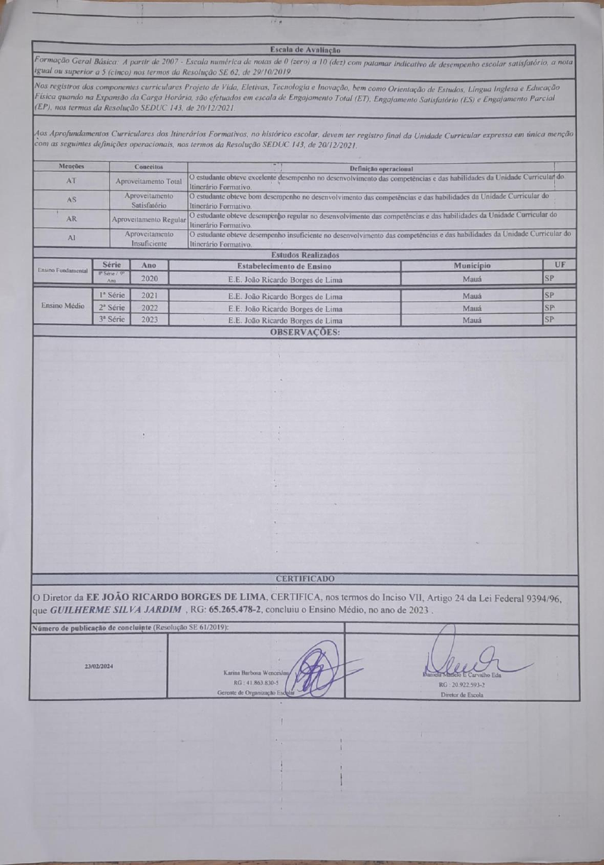 Escala de Avaliação Formação Geral A partir de 2007 Escala numérica de notas de (zero) a 10 (dez) com patamar indicativo de desempenho escolar a nota igual ou superior a 5 (cinco) nos termos da Resolução SE de 29/10/2019 Nos registros dos componentes curriculares Projeto de Vida, Eletivas, Tecnologia e Inovação, bem como Orientação de Estudos, Lingua Inglesa e Educação quando na Expansão da Carga Horária, são efetuados em escala de Engajamento Total Engajamento Satisfatório (ES) e Engajamento Parcial (EP). nos termos da Resolução SEDUC de Aos Aprofundamentos Curriculares dos Itinerários Formativos, no histórico devem ter registro final da Unidade Curricular expressa em única menção com as seguintes definições operacionais, nos termos da Resolução SEDUC 143, de 20/12/2021 Menções Conceitos Definição operacional AT Aproveitamento Total o estudante obteve excelente desempenho no desenvolvimento das competências e das habilidades da Unidade Curricular do Itinerário Formativo. AS Aproveitamento o estudante obteve bom desempenho no desenvolvimento das competências e das habilidades da Unidade Curricular do Satisfatório Itinerário AR Aproveitamento Regular o estudante obteve desempenho regular no desenvolvimento das competências e das habilidades da Unidade Curricular do Itinerário Aproveitamento o estudante obteve desempenho insuficiente no desenvolvimento das competências e das habilidades da Unidade Curricular do Insuficiente Itinerário Formativo Estudos Realizados Série Ano Estabelecimento de Ensino Município UF Ensino Fundamental 8th Ano 2020 E.E. João Ricardo Borges de Lima Maua SP Série 2021 E.E. João Ricardo Borges de Lima SP Ensino Médio Série 2022 E.E. João Ricardo Borges de Lima SP Série 2023 E.E. João Ricardo Borges de Lima SP OBSERVAÇÕES: CERTIFICADO o Diretor da EE JOÃO RICARDO BORGES DE LIMA, nos termos do Inciso VII, Artigo 24 da Lei Federal que GUILHERME SILVA JARDIM RG: concluiu Ensino Médio, no ano de 2023 Número de publicação de concluinte (Resolução SE 61/2019): 23/02/2024 Karina Barbosa Wenceslau Carvalho Eda RG 41.863.830-5 RG 20.922.593-2 Gerente de Organização Escolar Diretor de EscolaGOVERNO DO ESTADO DE PAULO SECRETARIA DE ESTADO DA EDUCAÇÃO DIRETORIA DE ENSINO - REGIÃO SIP ESCOLA ESTADUAL JOÃO RICARDO BORGES DE LIMA Ato legal de Decreto 50.873/2006 Res. 12/06/2006 Publ. 13/06/2006 Endereço: Rua João Cesário Simão 46 Bairro: Jardim Zaira Maua CEP 09321-092 Telefone: Endereço HISTÓRICO ESCOLAR - ENSINO Nome: GUILHERME SILVA JARDIM RG/RNM: 65.265.478-2 RA: 109.043.620-8 Data: 09/08/2005 Nascimento Município: Estado: São Paulo Brasil / NOTAS CARGA HORÁRIA ÁREAS DE Série Série CONHECIMENTO COMPONENTES CURRICULARES 2021 2022 2023 Total de Total de Nota / Nota / Nota / Aulas Horas CH CH CH Menção Menção Menção LINGUA PORTUGUESA LINGUAGENS E 6 8 7 ARTE SUAS 7 - - 9 - TECNOLOGIAS EDUCAÇÃO FISICA 7 - 5 - 5 LINGUA INGLESA 7 - 9 MATEMATICA SUAS MATEMÁTICA 6 5 9 TECNOLOGIAS DA BIOLOGIA 9 - 5 - NATUREZA E SUAS FÍSICA 7 - 8 - TECNOLOGIAS QUÍMICA 7 - 5 - - CIÊNCIAS FILOSOFIA 9 - 7 - HUMANAS GEOGRAFIA 6 - 6 - SOCIAIS HISTÓRIA 6 - 6 - APLICADAS SOCIOLOGIA 7 5 - - Total de Aulas da Formação Geral Básica / / / 0 0 PROJETO DE VIDA ET - ES - ES - - TECNOLOGIA E INOVAÇÃO ET - ES - ES - LINGUA INGLESA - - - ORIENTAÇÃO DE ESTUDOS - - - EDUCAÇÃO - - - - - - - - - - - - - - - - - - - - - - - - - - - - - - - - - artisticas corpo em movimento 6 - saúde c Fisiologia do movimento 5 - Linguagens Corpo Conservação do movimento em movimento 5 - - cultura ciência Construção da personagem corpo emoção Equilibrio movimento 6 - Designa qualidade de vida 8 - Tecnologia Caracteristicas adquiridas hereditárias 5 qualidade de vida equilibrio 5 - - Ofina de produção textual textos de divulgação cientifiva 5 - - - Materiais inovadores 7 - - Energia movimento 8 - saúde Bioquimica dos alimentos - 9 - Linguagens A Laboratório de fisiologia do exercício - 8 - produção da energia na prática corporal Metabolismo do alimento energia 7 - - corpo no mudo globalizado - 9 Corpo, saúde Um olhar sobre ontem hoje - 9 - Linguagens corpo Cultura, corpo literatura - 8 - que fala expressões pré Conceito - - - - Esporte doping 9 saúde alavancas - 8 - Linguagens As ciência saúde - 9 do corpo Saúde movimento Práticas corporais beleza ou saúde - 9 - - A cultura do corpo na midia - 9 Corpo, Linguagens corpo Beleza midia - 6 - Representações do corpo na - 8 representações Total Do Itinerário Formativo (dentro do turno e expansão no contraturno) 0 Total Geral de Aulas Anuais do Curso 0 Total Geral de Horas Anuais do Curso 1400 1080 1080 3560GOVERNO DO ESTADO DE SÃO PAULO SECRETARIA DE ESTADO DA EDUCAÇÃO DIRETORIA DE ENSINO REGIÃO MAUA SIP EE RICARDO BORGES DE LIMA Ato Legal de criação Decreto 50.873/2006 Res 13 06/2006 Cesário 46 Bairro Jardim Zaira Município: Cep: 09321-092 Endereço eletrônico: HISTÓRICO ESCOLAR ENSINO FUNDAMENTAL Nome: GUILHERME SILVA JARDIM RG/RNM: 65.265.478-2 RA: 109.043.620-8 Municipio Maua Nascimento: Estado São Paulo País: Brasil Data: 16/01/2006 ANO / PERIODO LETIVO ANO ANO ANO ANO ANO ANO ANO ANO ANO COMPONENTES CURRICULARES 2012 2013 2014 2015 2016 2017 2018 2019 2020 Ano & Portuguesa B 8 7 5 7 8 7 5 5 Lingua Estrangeira Inglês / / / / / / / / 5 Arte B 5 5 7 7 5 8 6 5 Educação Física C 7 7 8 8 7 8 6 5 História C / / 5 8 8 7 7 5 Geografia C / / 5 8 5 8 5 5 Matematica B 8 7 5 6 7 6 4* 5 Ciências Físicas e Biológicas C / / 5 8 8 9 5 5 BASE Ensino Religioso / / / / / / / / / / / / / / / / / / TOTAL DE AULAS DA BASE COMUM / / / / / 1120 1120 1120 1250 Lingua Estrangeira Inglês / / / / / 7 8 6 / Projeto de Vida / / / / / / / / ES Tecnologia e Inovação / / / / / / / / ES Cante a História do Brasil do Choro / / / / / / / / ES / / / / / / / / / / / / / / / / / / / / / / / / / / / / / / / / / / / / / / / / / / / / / / / / / / / / / / TOTAL DE AULAS DA PARTE DIV