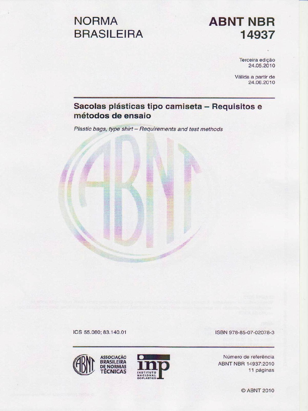 NORMA ABNT NBR BRASILEIRA 14937 Terceira edição 24.05.2010 Válida a partir de 24.06.2010 Sacolas plásticas tipo camiseta - Requisitos e métodos de ensaio Plastic bags, type shirt - Requirements and test methods ICS 55.080; 83.140.01 ISBN 978-85-07-02078-3 ASSOCIAÇÃO Número de referência ABNT BRASILEIRA DE NORMAS ABNT NBR 14937:2010 TÉCNICAS 11 páginas INSTITUTO NACIONAL DO PLÁSTICO ABNT 2010ABNT NBR 14937:2010 ABNT 2010 Todos os direitos reservados. A menos que especificado de outro modo, nenhuma parte desta publicação pode ser reproduzida ou utilizada por qualquer meio, eletrônico ou mecânico, incluindo fotocópia e microfilme, sem permissão por escrito da ABNT. ABNT Av.Treze de Maio, 13 - 28° andar 20031-901 - Rio de Janeiro - RJ Tel.: + 55 21 3974-2300 Fax: + 55 21 3974-2346 abnt@abnt.org.br www.abnt.org.br ii ABNT 2010 - Todos os direitos reservadosABNT NBR 14937:2010 Sumário Página Prefácio iv 1 Escopo 1 2 Referências normativas 1 3 Termos e definições 1 4 Requisitos 3 4.1 Material 3 4.2 Aspecto visual 3 4.3 Dimensões 3 4.4 Capacidade nominal 4 4.5 Resistência ao impacto por queda de dardo 4 4.6 Resistência dinâmica 4 4.7 Resistência à carga estática 4 4.8 Resistência à perfuração estática 4 4.9 Espessura 4 5 Métodos de ensaio 5 5.1 Quantidade de corpos-de-prova 5 5.2 Determinação do aspecto visual 5 5.3 Verificação dimensional 5 5.3.1 Procedimento para medição utilizando um gabarito 5 5.3.2 Procedimento para medição utilizando uma escala metálica milimétrica 6 5.4 Determinação da resistência ao impacto por queda de dardo 6 5.5 Determinação da resistência das sacolas à carga dinâmica 7 5.6 Determinação da resistência das sacolas à carga estática 8 5.7 Determinação das resistências à perfuração estática 8 5.8 Determinação da espessura 9 5.8.1 Cálculo da área da sacola 9 5.8.2 Determinação da espessura 9 6 Embalagem 9 7 Marcação e identificação 9 Bibliografia 11 Figuras Figura 1 - Sacola plástica tipo camiseta 2 Figura 2 - Gabarito para verificação dimensional 6 Figura 3 - Sugestão do dispositivo para o ensaio 7 Figura 4 - Esquema do simulador de oscilação harmônica vertical 8 ABNT 2010 - Todos os direitos reservados iiiABNT NBR 14937:2010 Tabelas Tabela 1 - Tolerância máxima para defeitos visuais 3 Tabela 2 - Dimensões e tolerâncias 3 Tabela 3 - Espessura nominal e tolerâncias de espessura de sacolas plásticas tipo camiseta 4 Tabela 4 - Massa do dardo 7 Tabela 5 - Massa do dispositivo de ensaio 8 iv ABNT 2010 - Todos os direitos reservadosABNT NBR 14937:2010 Prefácio A Associação Brasileira de Normas Técnicas (ABNT) é o Foro Nacional de Normalização. As Normas Brasileiras, cujo conteúdo é de responsabilidade dos Comitês Brasileiros (ABNT/CB), dos Organismos de Normalização Setorial (ABNT/ONS) e das Comissões de Estudo Especiais (ABNT/CEE), são elaboradas por Comissões de Estudo (CE), formadas por representantes dos setores envolvidos, delas fazendo parte: produtores, consumidores e neutros (universidades, laboratórios e outros). Os Documentos Técnicos ABNT são elaborados conforme as regras das Diretivas ABNT, Parte 2. A Associação Brasileira de Normas Técnicas (ABNT) chama atenção para a possibilidade de que alguns dos elementos deste documento podem ser objeto de direito de patente. A ABNT não deve ser considerada responsável pela identificação de quaisquer direitos de patentes. A ABNT NBR 14937 foi elaborada no Organismo de Normalização Setorial de Embalagem e Acondicionamento Plástico (ABNT/ONS-51), pela Comissão de Estudo de Sacos e Sacolas Plásticas (CE-51:002.01). seu 1° Projeto circulou em Consulta Nacional conforme Edital n° 02, de 09.02.2009 a 09.04.2009, com o número de Projeto ABNT NBR 14937. seu 2° Projeto circulou em Consulta Nacional conforme Edital n° 03, de 24.02.2010 a 26.04.2010, com o número de 2° Projeto ABNT NBR 14937. Esta Norma é baseada na na UNE 53257-2:1998. Esta terceira edição cancela e substitui a edição anterior (ABNT NBR 14937:2005), a qual foi tecnicamente revisada. Escopo desta Norma Brasileira em inglês é o seguinte: Scope This Standard stablishes the minimum requirements and test methods for the manufacture of plastic bags, type shirt, or the transport of products sold at retail. ABNT 2010 Todos os direitos reservados VNORMA BRASILEIRA ABNT NBR 14937:2010 Sacolas plásticas tipo camiseta - Requisitos e métodos de ensaio 1 Escopo Esta Norma estabelece os requisitos mínimos e métodos de ensaio para fabricação de sacolas plásticas tipo camiseta, destinadas ao transporte de produtos distribuídos no varejo. 2 Referências normativas Os documentos relacionados a seguir são indispensáveis à aplicação deste documento. Para referências datadas, aplicam-se somente as edições citadas. Para referências não datadas, aplicam-se as edições mais recentes do referido documento (incluindo emendas). ABNT NBR 13230, Embalagens e acondicionamentos plásticos - Identificação e simbologia ABNT NBR 14474, Filmes plásticos Verificação da resistência à perfuração estática Método de ensaio 3 Termos e definições Para os efeitos deste documento, aplicam-se os seguintes termos e definições. 3.1 aditivos substâncias ou compostos químicos adicionados à resina termoplástica para manter ou modificar as propriedades da sacola 3.2 capacidade nominal carga máxima suportada pela sacola com tolerância de 1% 3.3 defeitos visuais corpos estranhos ou não à superfície do filme, de formas e colorações variadas, e, ainda, furos e rasgos 3.4 falha qualquer ruptura com dimensão maior ou igual a 10 mm, medida em sua maior extensão 3.5 filme tubular sanfonado filme tubular com sanfonas laterais 3.6 filme tubular filme produzido em forma de tubo e achatado para embobinamento 3.7 pigmento material a ser misturado à resina termoplástica para obter-se a sacola na cor desejada ABNT 2010 - Todos os direitos reservados 1AB