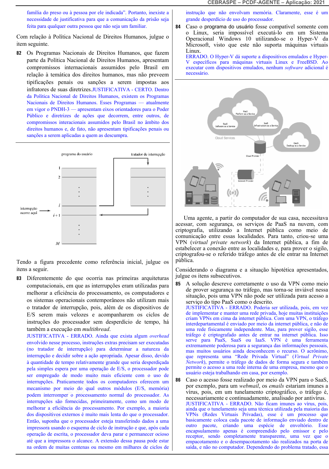 pcimarkpci MDAwMDowMDAwOjAwMDA6MDAwMDowMDAwOmZmZmY6YmZiOTphZTFk:VGh1LCAxMyBGZWIgMjAyNSAyMToxMTozMiAtMDMwMA== www.pciconcursos.com.br CEBRASPE – PCDF-AGENTE – Aplicação: 2021 família do preso ou à pessoa por ele indicada”. Portanto, inexiste a necessidade de justificativa para que a comunicação da prisão seja feita para qualquer outra pessoa que não seja um familiar. Com relação à Política Nacional de Direitos Humanos, julgue o item seguinte. 82 Os Programas Nacionais de Direitos Humanos, que fazem parte da Política Nacional de Direitos Humanos, apresentam compromissos internacionais assumidos pelo Brasil em relação à temática dos direitos humanos, mas não preveem tipificações penais ou sanções a serem impostas aos infratores de suas diretrizes.JUSTIFICATIVA - CERTO. Dentro da Política Nacional de Direitos Humanos, existem os Programas Nacionais de Direitos Humanos. Esses Programas — atualmente em vigor o PNDH-3 — apresentam eixos orientadores para o Poder Público e diretrizes de ações que decorrem, entre outros, de compromissos interacionais assumidos pelo Brasil no âmbito dos direitos humanos e, de fato, não apresentam tipificações penais ou sanções a serem aplicadas a quem as descumpra. Tendo a figura precedente como referência inicial, julgue os itens a seguir. 83 Diferentemente do que ocorria nas primeiras arquiteturas computacionais, em que as interrupções eram utilizadas para melhorar a eficiência do processamento, os computadores e os sistemas operacionais contemporâneos não utilizam mais o tratador de interrupção, pois, além de os dispositivos de E/S serem mais velozes e acompanharem os ciclos de instruções do processador sem desperdício de tempo, há também a execução em multithread. JUSTIFICATIVA - ERRADO. Ainda que exista algum overhead envolvido nesse processo, instruções extras precisam ser executadas (no tratador de interrupção) para determinar a natureza da interrupção e decidir sobre a ação apropriada. Apesar disso, devido à quantidade de tempo relativamente grande que seria desperdiçada pela simples espera por uma operação de E/S, o processador pode ser empregado de modo muito mais eficiente com o uso de interrupções. Praticamente todos os computadores oferecem um mecanismo por meio do qual outros módulos (E/S, memória) podem interromper o processamento normal do processador. As interrupções são fornecidas, primeiramente, como um modo de melhorar a eficiência do processamento. Por exemplo, a maioria dos dispositivos externos é muito mais lenta do que o processador. Então, suponha que o processador esteja transferindo dados a uma impressora usando o esquema de ciclo de instrução e que, após cada operação de escrita, o processador deva parar e permanecer ocioso até que a impressora o alcance. A extensão dessa pausa pode estar na ordem de muitas centenas ou mesmo em milhares de ciclos de instrução que não envolvam memória. Claramente, esse é um grande desperdício de uso do processador. 84 Caso o programa do usuário fosse compatível somente com o Linux, seria impossível executá-lo em um Sistema Operacional Windows 10 utilizando-se o Hyper-V da Microsoft, visto que este não suporta máquinas virtuais Linux. ERRADO. O Hyper-V dá suporte a dispositivos emulados e Hyper- V específicos para máquinas virtuais Linux e FreeBSD. Ao executar com dispositivos emulados, nenhum software adicional é necessário. Uma agente, a partir do computador de sua casa, necessitava acessar, com segurança, os serviços de PaaS na nuvem, com criptografia, utilizando a Internet pública como meio de comunicação entre essas localidades. Para tanto, criou-se uma VPN (virtual private network) da Internet pública, a fim de estabelecer a conexão entre as localidades e, para prover o sigilo, criptografou-se o referido tráfego antes de ele entrar na Internet pública. Considerando o diagrama e a situação hipotética apresentados, julgue os itens subsecutivos. 85 A solução descreve corretamente o uso da VPN como meio de prover segurança no tráfego, mas torna-se inviável nessa situação, pois uma VPN não pode ser utilizada para acesso a serviço do tipo PaaS como o descrito. JUSTIFICATIVA - ERRADO. Poderia ser utilizada, pois, em vez de implementar e manter uma rede privada, hoje muitas instituições criam VPNs em cima da internet pública. Com uma VPN, o tráfego interdepartamental é enviado por meio da internet pública, e não de uma rede fisicamente independente. Mas, para prover sigilo, esse tráfego é criptografado antes de entrar na internet pública. Isso serve para PaaS, SaaS ou IaaS. VPN é uma ferramenta extremamente poderosa para a segurança das informações pessoais, mas muitos usuários ainda desconhecem o recurso. O acrônimo, que representa uma “Rede Privada Virtual” (Virtual Private Network), permite o tráfego de dados de forma segura e também permite o acesso a uma rede interna de uma empresa, mesmo que o usuário esteja trabalhando em casa, por exemplo. 86 Caso o acesso fosse realizado por meio da VPN para o SaaS, por exemplo, para um webmail, os emails estariam imunes a vírus, pois, em um tunelamento criptográfico, o tráfego é, necessariamente e continuadamente, analisado por antivírus. JUSTIFICATIVA - ERRADO. Não ficam imunes ao vírus, pois, ainda que o tunelamento seja uma técnica utilizada pela maioria das VPNs (Redes Virtuais Privadas), esse é um processo que basicamente coloca cada pacote de informação enviado dentro de outro pacote, criando uma espécie de envoltório. Esse encapsulamento apenas é compreendido pelo emissor e pelo receptor, sendo completamente transparente, uma vez que o empacotamento e o desempacotamento são realizados na porta de saída, e não no computador. Dependendo do problema tratado, essa pcimarkpci MDAwMDowMDAwOjAwMDA6MDAwMDowMDAwOmZmZmY6YmZiOTphZTFk:VGh1LCAxMyBGZWIgMjAyNSAyMToxMTozMiAtMDMwMA== www.pciconcursos.com.br CEBR