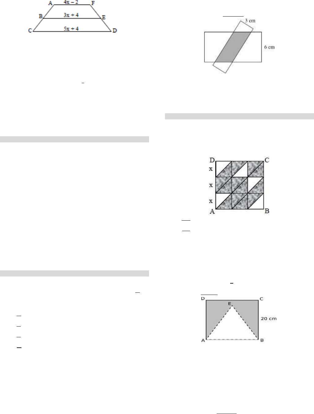 177. (EEAr – 2017.2) No trapézio 𝐴𝐶𝐷𝐹 abaixo, considere 𝐴𝐵 = 𝐵𝐶 e 𝐷𝐸 = 𝐸𝐹. Assim, o valor de 𝑥2 é A) 1 B) 4 C) 9 D) 16 178. (EEAr – 2006) Se a base média de um trapézio mede 30 cm, e a base maior é 3 da base menor, então o 2 módulo da diferença entre as medidas das bases, em cm, é: A) 8 B) 10 C) 12 D) 14 ÁREA DO QUADRADO 179. (EEAr – 2019.2) O piso de uma sala foi revestido completamente com 300 placas quadradas justapostas, de 20 cm de lado. Considerando que todas as placas utilizadas não foram cortadas e que não há espaço entre elas, a área da sala, em metros quadrados, é 183. (EEAr – 2020.2) A figura mostra um paralelogramo sombreado formado pela superposição de dois retângulos, e apresenta uma dimensão de cada retângulo. Se um dos lados do paralelogramo mede 3,5 cm, então a sua área é cm2. A) 12 B) 18 C) 21 D) 23 ÁREA DO TRIANGULO 184. (EEAr – 2015) Na figura, 𝐴𝐵𝐶𝐷 é um quadrado formado por pequenos quadrados de lado 𝑥 divididos por uma de suas diagonais. Assim, a área sombreada, em função de 𝑥 é A) 120 B) 80 C) 12 D) 8 180. (EEAr – 2008) Se 𝑆 = 6𝓁 cm2 é a área de um quadrado de lado 𝓁 cm, o valor de 𝓁 é: A) 3 B) 6 C) 9 D) 12 ÁREA DO RETÂNGULO 181. (EEAr – 2010) Seja um retângulo de comprimento c e largura 𝓁. Aumentando-se o comprimento em 1 do 10 A) 15𝑥2 . 2 B) 13𝑥2 2 C) 5,5𝑥2. D) 3,5𝑥2 185. (EEAr – 2019.2) Uma “bandeirinha de festa junina” foi feita recortando o triângulo equilátero ABE do quadrado ABCD, de 20 cm de lado, conforme a figura. Considerando √3 = 1,7, essa bandeirinha tem uma área de cm2. seu valor, para que a área não se altere, a sua largura deverá ser igual a: A) 1 𝓁 10 B) 10 𝓁 11 C) 9 𝓁 11 D) 9 𝓁 10 182. (EEAr – 2007) A casa de João tem um quintal retangular de 30 m por 20 m. Se ele usar 30% da área do quintal para fazer uma horta também retangular, de 10 m de comprimento, então a largura desta horta, em m, será: A) 18 B) 15 C) 12 D) 11 A) 180 B) 190 C) 210 D) 230 186. (EEAr – 2020.2) Na figura, que representa parte da estrutura de um telhado, 𝐶 𝐷 é altura do triângulo ABC, CEDF é um quadrado de lado 3 m, o ponto E pertence a 𝐴 𝐶 e o ponto F pertence a 𝐵 𝐶 . Assim, a área do triângulo ABC é 𝑚2 . . RELAÇÕES MÉTRICAS NO TRIÂNGULO RETÂNGULO A) 12√3 B) 15√3 C) 18 D) 20 ÁREA DO TRAPÉZIO 187. (EEAr – 2019.1) Um trapézio tem 12 cm de base média e 7 cm de altura. A área desse quadrilátero é cm2. A) 13 B) 19 C) 44 D) 84 ÁREA DO LOSANGO 188. (EEAr – 2015) Considere um quadrado de diagonal 5√2 m e um losango de diagonais 6 m e 4 m. Assim, a razão entre as áreas do quadrado e do losango é aproximadamente igual a: A) 3,5 B) 3,0 C) 2,5 D) 2,1 189. (EEAr – 2017.2) A malha da figura abaixo é formada por losangos cujas diagonais medem 0,50 cm e 2,00 cm. A área hachurada é de cm2. A) 20 B) 22 C) 23 D) 25 190. (EEAr – 2013) Considere o retângulo 𝐴𝐵𝐶𝐷, e os pontos médios dos seus lados 𝑀, 𝑁, 𝑃 e 𝑄. Unindo esses pontos médios, conforme a figura, pode-se concluir que a área hachurada, em cm2, é: A) 8 B) 4 C) 4√2 D) 2√2 191. (ESA – 2008) As diagonais de um losango medem 48 cm e 33 cm. Se a medida da diagonal maior diminuir 4 cm, então, para que a área permaneça a mesma, deve-se aumentar a medida da diagonal menor de: A) 3 cm B) 5 cm C) 6 cm D) 8 cm E) 9 cm FÓRMULA DE HERON. 192. (EEAr – 2007) Os lados de um triângulo medem 7 cm, 8 cm e 9 cm. A área desse triângulo, em cm2, é: A) 12√3 B) 12√5 C) 8√2 D) 8√3 193. (EEAr – 2019.1) Se 𝐴𝐵𝐶 é um triângulo retângulo em 𝐴, o valor de 𝑛 é A) 22/3 B) 16/3 C) 22 D) 16 194. (ESA – 2014) Em um triângulo retângulo de lados 9m, 12m e 15m, a altura relativa ao maior lado será: A) 7,2m B) 7,8m C) 8,6m D) 9,2m E) 9,6m TEOREMA DE PITÁGORAS 195. (ESA – 2015) Num triângulo retângulo cujos catetos medem √8 e √9, a hipotenusa mede: A) √10 B) √11 C) √13 D) √17 E) √19 196. (EEAr – 2016-2) Sabe-se que a hipotenusa de um triângulo retângulo tem 5√5 cm de comprimento e a soma dos catetos é igual a 15 cm. As medidas, em cm, dos catetos são A) 6 e 9 B) 2 e 13 C) 3 e 12 D) 5 e 10 197. (EEAr – 2010) Quando dadas em cm, as medidas dos lados do trapézio 𝐴𝐵𝐶𝐷 são expressas por números consecutivos. Assim, o valor de 𝑥 é: A) 1 B) 2 C) 3 D) 4 198. (EEAr – 2015) Um trapézio isósceles tem base maior e base menor medindo, respectivamente, 12 cm e 6 cm. Se esse trapézio tem altura medindo 4 cm, então seu perímetro é cm. A) 22 B) 26 C) 28 D) 30 199. (EEAr – 2010) Os lados de um triângulo obtusângulo medem 3 m, 5 m e 7 m. A medida da projeção do menor dos lados sobre a reta que contém o lado de 5 m é, em m, A) 2,5 B) 1,5 C) 2 D) 1 CONSEQUÊNCIAS DO TEOREMA DE PITÁGORAS 200. (EEAr – 2006) Dois quadrados são tais que um deles tem como lado a diagonal do outro, que por sua vez tem o lado medindo 10 cm. O módulo da diferença entre as medidas de suas diagonais, em cm, é: A) 10(2 − √2) B) 10(√2 − 1) C) 5(2 − √2) D) 5(√2 − 1) 201. (EEAr – 2012) O perímetro de um triângulo equilátero de altura ℎ = √3 m é m. A) 3 B) 4 C) 5 D) 6 202. (ESA – 2015) A área do triângulo equilátero cuja altura mede 6 cm é: A) 12√3 cm2 B) 4√3 cm2 C) 24√3 cm2 D) 144 cm2 E) 6√3 cm2 203. (EEAr – 2011) Na figura, 𝐵 𝐶 e 𝐶 𝐸 são segmentos colineares de 4 cm cada um. Se os triângulos 𝐴𝐵𝐶 e 𝐷𝐶𝐸 são equiláteros, a área do triângulo 𝐵𝐷𝐸 é: A) 4√3 B) 6√3 C) 8√3 D) 10√3 204. (EEAr – 2019.1) A área de um hexágono regular inscrito em um círculo de √6 cm de raio é √3 cm2. A) 6 B) 9 C) 12 D) 15 ÁREA E TEOREMA DE PITÁGORAS 205. (EEAr – 2019.2) Um triângulo isósceles, de perímetro 24 cm, possui altura relativa à base medindo 6 cm. Assim, a metade da