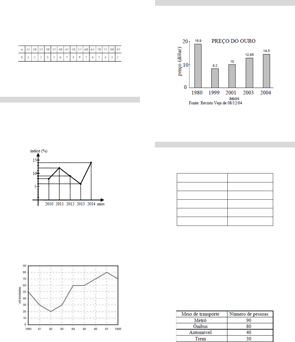 560. (EEAr – 2007) A tabela a seguir traz o resultado de uma prova de Ciências. Nela, xi são as notas e fi são as frequências absolutas. Agrupando os dados em 5 classes do tipo [a, b[, de amplitude 1,5, sendo o limite inferior da 1ª classe a nota 1,5, a frequência absoluta da 3ª classe da nova tabela será igual a: A) 14 B) 19 C) 24 D) 29 ESTATÍSICA (GRÁFICO DE LINHA) 561. (EEAr – 2018.1) O gráfico abaixo refere-se aos índices de desistência em um curso de Informática, verificados nos anos de 2010 a 2014. Com base no gráfico, pode-se afirmar que os índices mediano e médio (aproximado) de desistência do curso nesses anos são, respectivamente: A) 10% e 10% B) 9% e 10% C) 10% e 9% D) 9% e 9% 562. (EEAr – 2010) O gráfico representa a produção de arroz, em milhares de toneladas, em certo país, no período 1980-1988. Pelo gráfico, pode-se concluir que, no período 1980- 1988, nesse país, a produção média anual de arroz, em mil toneladas, é, aproximadamente, A) 64 B) 60 C) 58 D) 52 ESTATÍSICA (GRÁFICO DE COLUNAS) 563. (EEAr – 2013) Uma das possíveis análises do gráfico permite concluir, corretamente, que houve desvalorização do ouro ao comparar os dados relativos aos anos de: A) 1980 e 1999 B) 1999 e 2001 C) 2001 e 2003 D) 2003 e 2004 ESTATÍSICA (GRÁFICO DE SETORES) 564. (EEAr – 2017.2) No primeiro semestre de 2016, os 720 alunos de uma determinada escola técnica possuíam as seguintes idades Idade em anos N° de alunos 18 100 19 180 20 200 21 160 22 80 Se apresentarmos os dados em um gráfico de setores, o setor que representa o número de alunos com idade de 19 anos deverá ter A) 90° B) 60° C) 45° D) 30° 565. (EEAr – 2009) Numa pesquisa feita em uma cidade, para verificar o meio de transporte utilizado por 240 pessoas, chegou-se ao seguinte resultado: Apresentando esses dados num gráfico em setores, o ângulo do setor correspondente a “Automóvel” será de: A) 60° B) 65° C) 70° D) 75° ESTATÍSICA (POLÍGONO DE FREQUÊNCIAS E OGIVA) ESTATÍSICA (PICTOGRAMA) 566. (EEAr – 2009) Os resultados de uma pesquisa sobre os números de casos de AIDS entre consumidores de drogas injetáveis, no país X, nos últimos oito anos, foram apresentados em um gráfico, onde as colunas foram substituídas por seringas de tamanhos diferentes. Este gráfico é um A) cartograma. B) pictograma. C) histograma. D) estereograma. A) 30 B) 35 C) 40 D) 45 570. (EEAr – 2011) O histograma apresenta as alturas de 30 meninas que frequentam o 3º ano do Ensino Médio de uma escola. Considerando que as classes apresentadas no gráfico incluem seus limites inferiores e não os limites superiores, é correto afirmar que o número de meninas com altura não inferior a 170 cm é: ESTATÍSICA (HISTOGRAMA) 567. (EEAr – 2019.1) A média da distribuição representada pelo seguinte Histograma é A) 8 B) 7 C) 56/9 D) 61/9 568. (EEAr – 2015) Considere a Distribuição representada no gráfico. Ao somar os limites inferior e superior da classe de maior frequência dessa Distribuição obtém-se: A) 4 B) 6 C) 8 D) 10 569. (EEAr – 2006) O histograma representa a distribuição dos diâmetros de 65 peças de uma loja. Se ficção as frequências absolutas, então o número de peças com diâmetro não inferior a 20 mm é: A) 13 B) 18 C) 22 D) 25 571. (EEAr – 2020.2) Considere o histograma. O ponto médio e a frequência absoluta da classe modal são e respectivamente. A) 6; 6 B) 6,5; 7 C) 7; 6,5 D) 6,5; 7,5 572. (EEAr – 2014) Sejam f1 e f2 as frequências da 1a e da 2a classes da Distribuição representada no polígono de frequências. Assim, f1 + f2 é igual a A) 15 B) 20 C) 25 D) 30 573. (EEAr – 2011) Considere o Polígono de Frequência e a Ogiva, ambos representativos de uma distribuição de frequência com classes. As abscissas dos pontos que orientam as construções do Polígono e da Ogiva são, respectivamente, os e os (as) das classes. A) limites superiores – frequências absolutas. B) pontos médios – frequências absolutas. C) pontos médios – limites superiores. D) limites superiores – pontos médios. ESTATÍSICA (MÉDIA) 574. (EEAr – 2006) A tabela mostra as idades dos alunos matriculados no Centro de Educação Infantil “X”, em 2005. A média das idades dos alunos dessa escola, em anos, é, aproximadamente, A) 4,1 B) 4,5 C) 5,1 D) 5,6 575. (EEAr – 2007) A produção média mensal de 8 fábricas de doces caseiros de uma cidade é de 1,5 tonelada. Se forem construídas mais duas fábricas e a produção mensal total continuar a mesma, a produção média mensal das 10 fábricas será de: A) 0,8 t B) 1 t C) 1,2 t D) 1,4 t 576. (EEAr – 2016-1) A tabela apresenta o número de acidentes de trabalho ocorrido a cada mês em uma empresa no ano de 2014. MÊS N° DE ACIDENTES JAN 4 FEV 3 MAR 1 ABR 1 MAI 3 JUN 3 JUL 4 AGO 1 SET 0 OUT 2 NOV 3 DEZ 5 TOTAL 30 A quantidade de meses que apresentou números de acidentes acima da média aritmética mensal foi A) 4 B) 5 C) 6 D) 7 577. (EEAr – 2018.2) A média aritmética de cinco números é 7. Se for retirado do conjunto o número 9, a média aritmética dos restantes será A) 6,8 B) 6,5 C) 5,9 D) 5,6 578. (ESA – 2011) A média aritmética de 𝑛 números é 29. Retirando-se o número 12 a média aumenta para 30. Podemos afirmar que o valor de 𝑛 será: A) 17 B) 11 C) 42 D) 41 E) 18 579. (ESA – 2010) Numa sala de aula, a média das idades dos 50 alunos era de 22,5 anos. No cálculo da média, foram consideradas idades com anos completos. Transcorridas algumas semanas, houve a desistência de um aluno e a média das idades caiu para 22 anos. Considerando-se que nesse período nenhum dos alunos da turma fez aniversário, então a idade do aluno que desistiu é igual a: A) 47 anos B) 45 anos C) 37 anos D) 35 anos E) 27 anos 580. (ESA – 2008) A média aritmética das notas de Matemática em uma turma de 25 alunos em um dos doze Colégios Militares existentes no Brasil diminui em 0,1, se alter