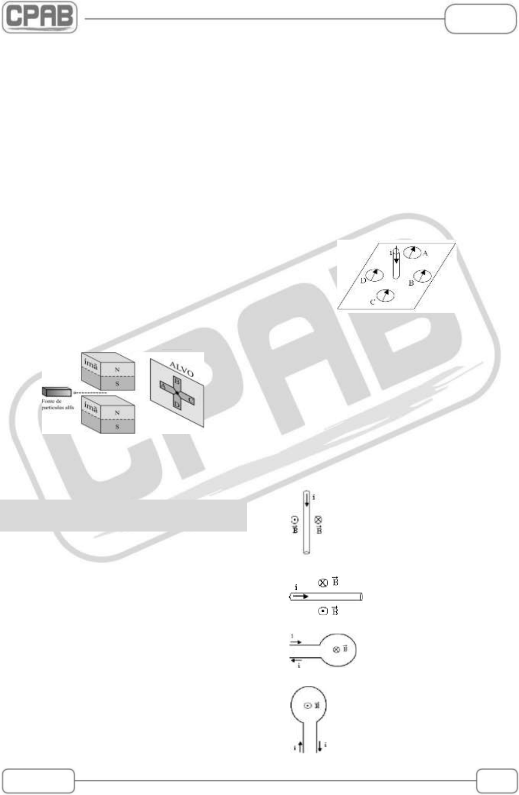 Licensed to Victoria Louise - victoriahollanda675@gmail.com - HP17916013667534 Física EEAr 293 A) Fcp= 1; rt = 78 B) Fcp = 2; rt =156 C) Fcp = 3; rt =312 D) Fcp= 4; rt =625 679. (EEAr – 2020.1) A figura a seguir representa um equipamento experimental para verificar a influência de um campo magnético uniforme em cargas elétricas em movimento. O equipamento é formado por uma fonte emissora de partículas alfa, dois ímãs e um anteparo (alvo). Sabendo-se que: • as partículas alfa possuem carga positiva; • as partículas são emitidas pela fonte com alta velocidade e em trajetória retilínea; • a região entre os ímãs forma uma região de campo magnético uniforme; e • se o feixe de partículas for emitido sem a influência dos ímãsas partículas atingirão o anteparo no centro do alvo (ponto entre as regiões A, B, C e D). Considerando que as partículas alfa estão sujeitas apenas à força magnética sobre as cargas elétricas em movimento, pode-se concluir corretamente que após passarem pela região de campo magnético uniforme, as partículas atingirão o alvo na região . A) A B) B C) C D) D 680. (BCT ME – 2008) A intensidade do vetor indução magnética no interior de um solenoide (dispositivo constituído de um fio condutor enrolado em forma de espiras não justapostas) é determinada em função do número de espiras, do comprimento do solenoide e da intensidade da corrente elétrica que circula no fio condutor.Das alternativas abaixo, assinale aquela na qual apresenta-se uma maneira correta de aumentar a intensidade do vetor indução magnética no interior do solenoide. A) reduzindo o número de espiras B) aumentando o número de espiras C) aumentando o comprimento do solenoide D) reduzindo a intensidade da corrente elétrica 681. (BCT ME – 2014) Em 1820, o físico dinamarquês Hans Christian Oerstedverificouque um fio condutor, quando percorrido por uma corrente elétrica, apresenta um campo magnético em torno desse fio. Das alternativas abaixo, assinale qual indica o dispositivo elétrico cuja aplicação só foi possível a partir da constatação dessa relação. A) Lâmpada incandescente. B) Resistência elétrica. C) Eletroímã. D) Capacitor. 682. (BCT ME – 2009) Um fio condutor atravessa perpendicularmente o plano de uma mesa, e é percorrido por uma corrente elétrica contínua (i), cujo sentido (convencional) está indicado na figura. Na figura estão apresentadas, também, quatro bússolas (A, B, C, D), dentre as quais, apenas em uma delas a agulha magnética está alinhada corretamente com as linhas de campo magnético geradas pela passagem da corrente elétrica pelo fio condutor. Assinale a alternativa que indica a agulha alinhada corretamente. A) A B) B C) C D) D 683. (BCT ME – 2010) Nas figuras a seguir são apresentadas quatro situações que os condutores são percorridos por corrente elétrica. Adotando o sentido convencional para a corrente elétrica representada, assinale a alternativa em que está corretamente representado o campo magnético gerado. A) B) C) D) CAMPO MAGNÉTICO: CONDUTOR RETILÍNEO, CENTRO DE UMA ESPIRA CIRCULAR, SOLENOIDE, TOROIDE; ELETROÍMÃ. mailto:victoriahollanda675@gmail.com Licensed to Victoria Louise - victoriahollanda675@gmail.com - HP17916013667534 Física 294 COLETÂNEA DE PROVAS 684. (BCT ME – 2013) Um condutor reto e extenso, situado no vácuo, é percorrido por uma corrente elétrica de intensidade 1,0 A. Nesse caso, a intensidade do campo magnético em um ponto situado perpendicularmente a 1,0 m de distância do condutor, éde ⋅10−7T . Observação: 0 =4π 10-7 m/A A) 1 B) 2 C) π D) 2π 685. (BCT ME – 2011) Um condutor retilíneo e extenso é percorrido por uma corrente elétrica. Das alternativas a seguir assinale aquela em que está corretamente descrito, em termos de sentindo e direção, o campo magnético (𝐵 ) de acordo com a corrente elétrica (i). Dado: adote o sentido convencional para a corrente elétrica A) B) C) D) 686. (EEAR – 2006-2) Na construção de uma bobina para utilização em um eletroímã, deve-se levar em conta que o fio desta bobina A) deva ser de material ferromagnético. B) possa ser de qualquer material condutor de eletricidade. C) deva ser de material ferromagnético e condutor de eletricidade. D) deva ser de material condutor de eletricidade e não ferromagnético. 687. (EEAr – 2020.2) Cada uma das figuras (1, 2, 3 e 4) a seguir indica uma espira condutora ideal e o sentido da corrente elétrica (i) induzida na espira. Cada figura indica também um ímã, seus polos (N = polo norte e S = polo sul) e o vetor deslocamento de aproximação ou afastamento do ímã em relação à espira. Assinale a alternativa que indica as figuras que estão corretas conforme as Leis de Faraday e Lenz. 1 2 3 4 A) Figuras 1 e 2. B) Figuras 2 e 3. C) Figuras 3 e 4. D) Figuras 1 e 4. 688. (EEAR – 2016-1) Dois fios condutores longos são percorridos pela mesma corrente elétrica nos sentidos indicados na figura A opção que melhor representa os campos magnéticos nos pontos A, B e C, respectivamente, é: A) B) C) D) PONTO A PONTO B PONTO C NULO NULO NULO NULO mailto:victoriahollanda675@gmail.com Licensed to Victoria Louise - victoriahollanda675@gmail.com - HP17916013667534 Física EEAr 295 689. (EEAR – 2015) Considere dois condutores retilíneos (1 e 2) longos, paralelos e coplanares, percorridos por correntes elétricas (I1 e I2) e um ponto (B) entre os condutores, equidistantes dos mesmos. Assinale a alternativa que indica uma afirmação fisicamente correta em relação a essa situação. A) Se os valores de intensidade das correntes elétricas, I1 e I2, forem diferentes de zero, o vetor campo magnético no ponto B nunca será nulo. B) Independente das intensidades e dos sentidos das correntes elétricas I1 e I2, o vetor campo magnético no ponto B sempre será nulo. C) Somente se as correntes elétricas, I1 e I2, estiverem no mesmo sentido, e de intensidade iguais,