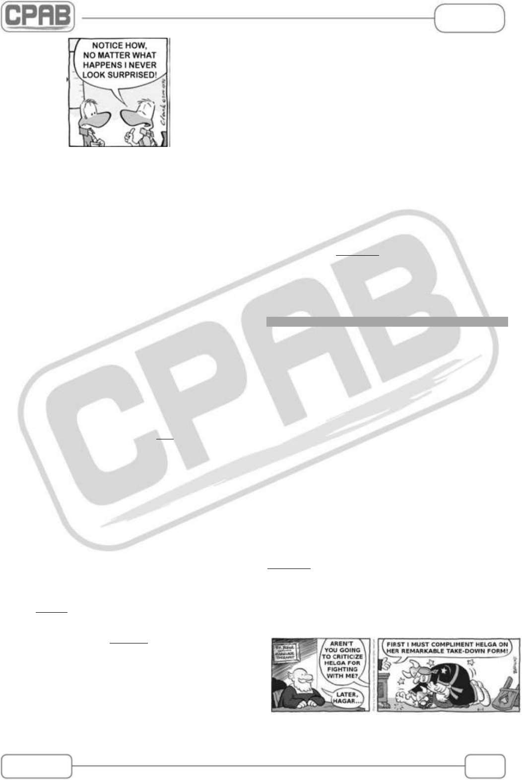 Licensed to Victoria Louise - victoriahollanda675@gmail.com - HP17916013667534 Inglês EEAr 333 301. (BCT– 2019.1) Which words complete the lines in the cartoon? A) As – as B) At – as C) Like – as D) How – like 302. (EEAr – 2016-1)Select the alternative in which the use of “so” does not express the result of an action: A) I don’t have a nice dress, so I’m not going to the party tonight. B) Water is running out, so people must save it as much as they can. C) Lightning is dangerous to everybody, so a lot of people don’t worry about it. D) There are weather balloons and satellites to help predict the weather, so meteorologists must know how to use them in order to deliver precise forecasts. 303. (EEAr – 2016-2) Select the alternative that best completes the sentence below giving idea of comparison. He is a good artist and he sings a professional when he is on stage. A) as B) like C) such D) as if Roller skating R.Jordania Roller skating used to be strictly for children. Nowadays, with the new neoprene wheels and frictionless ballbearings, rollerskating has become popular with people with of all ages and all social classes. Not only do people skate, they also dance on roller skates – the term roller-disco. To cater to the new fad, many indoor roller – disco rinks are opening all over the country. There people can dance on roller skates in winter when there is snow and ice on the ground. Airline employee steals, crashes plane near Seattle US authorities are investigating the Friday night crash of a Horizon Air Q400 aircraft near Seattle- Tacoma airport in Washington state after an airline employee took off without clearance and flew the plane for about an hour before it crashed. Two F-15 military fighter jets went up into the air in order to intercept the stolen airliner, and the airport closed for a short time. There were no passengers on board except the person who was operating the plane. It is believed that he is Richard Russel, a 29 year old local man who worked for the airline. Some media images showed the aircraft doing complicated and dangerous flying before crash. In an audio recording a conversation with na air traffic controller, the person piloting the aircraft said he was a “broken guy”. Adapted from news.airwise.com/story/airline... 305. (EEAr - BCT – 2020.1) “In order to”, in bold type in the text, is a clause. A) time B) result C) manner D) purpose PHRASAL VERB “I find the easiest way to expand my vocabulary is to make up words.” 306. (EEAr - 2018.1) The phrasal verb “make up” in this cartoon can be replaced by: A) build up B) go away C) look up D) go on 307. (BCT – 2012) In “Andy Kane explains why he is so hooked on DIY”, the words in bold type are closest in meaning to A) scared of. B) averse to. C) addicted to. D) apprehensive about. 308. (BCT – 2012) In “… Air Canada flight AC 018 bound for Vancouver...”, the underlined words mean A) arriving at. B) flying from. C) departing from. D) travelling towards. Life in the USA. 304. (EEAr - BCT – 2020.1) Complete the text with the correct alternative subsequently. A) even – that B) that – even C) why – hence D) hence – even mailto:victoriahollanda675@gmail.com Licensed to Victoria Louise - victoriahollanda675@gmail.com - HP17916013667534 Inglês 334 COLETÂNEA DE PROVAS 309. (EEAr – 2019.2) The word “take-down” in the text means A) a movement in which a wrestler gets the opponent down to the floor. B) an arrest or unexpected visit by the police. C) to write down some information. D) to take note during a meeting. 310. (BCT ME – 2012) In “A British woman was kicked off a plane…”, the phrasal verb in bold type, could be replaced by A) took out. B) stepped off. C) contained in. D) removed from. 311. (EEAr – 2017.2) In ‘(...) the Igbo is in danger of dying out (...)’, (line 2), it means that the language is in danger of . A) being minority B) being less spoken C) becomingunclear D) going into extinction 312. (BCT – 2013) In “...were passionately caught up in developing...”, the underlined phrasal verb is closest in meaning to A) absorbed. B) separated. C) distracted. D) indifferent. “but unfortunately the passenger has passed away.” 313. (EEAr - BCT – 2020.1) Choose the correct verb to replace the phrasal verb “passed away”, in bold type in the text: A) died B) choked C) fainted D) collapsed VOCABULARY 314. (EEAr – 2017.2) All underlined words in the article have a negative prefix, except: A) disregarding B) indefatigable C) unintelligible D) mispronouncing 315. (EEAr – 2011) In “researchers”, the suffix – “er ” has the same function as the one in A) nicer. B) harder. C) worker. D) transfer. 316. (EEAr – 2009) “Brenda is a housewife” means that she works A) for another family. B) as a housekeeper. C) in a hotel. D) at home. 317. (EEAr – 2017.2) In ‘(…) a Jeep Cherokee was driven into the glass doors and set ablaze’, it means that the vehicle hit into the glass doors and , except: A) burnt B) blew up C) caught fire D) burst into flames 318. (BCT – 2019.2) In, “... another passenger was said to have felt severe pressure after positioning his back against the opening in the cabin in an attempt to seal it”. The word “seal” is closest in meaning to . A) fix B) hide C) close D) protect Read the text and answer the questions 319 Mrs. Pratchett Her name was Mrs Pratchett. She was a small, skinny oldhag with moustache on her upper lip and a mouth as sour as a green goosebery. She never smiled. Her apron was gray and greasy. Her blouse had bits of breakfast all over it, toast crumbs and tea stains and splotches of dried egg yollk. It was her hands, however, that disturbed us most.They were disgusting. They were black with dirt and grime. And do not forget that it was these hands and fingers thatshe would plunge into the sweet-jars when we asked for a pennyworth of TreackleToffe or Wine Gums or Nut Clust