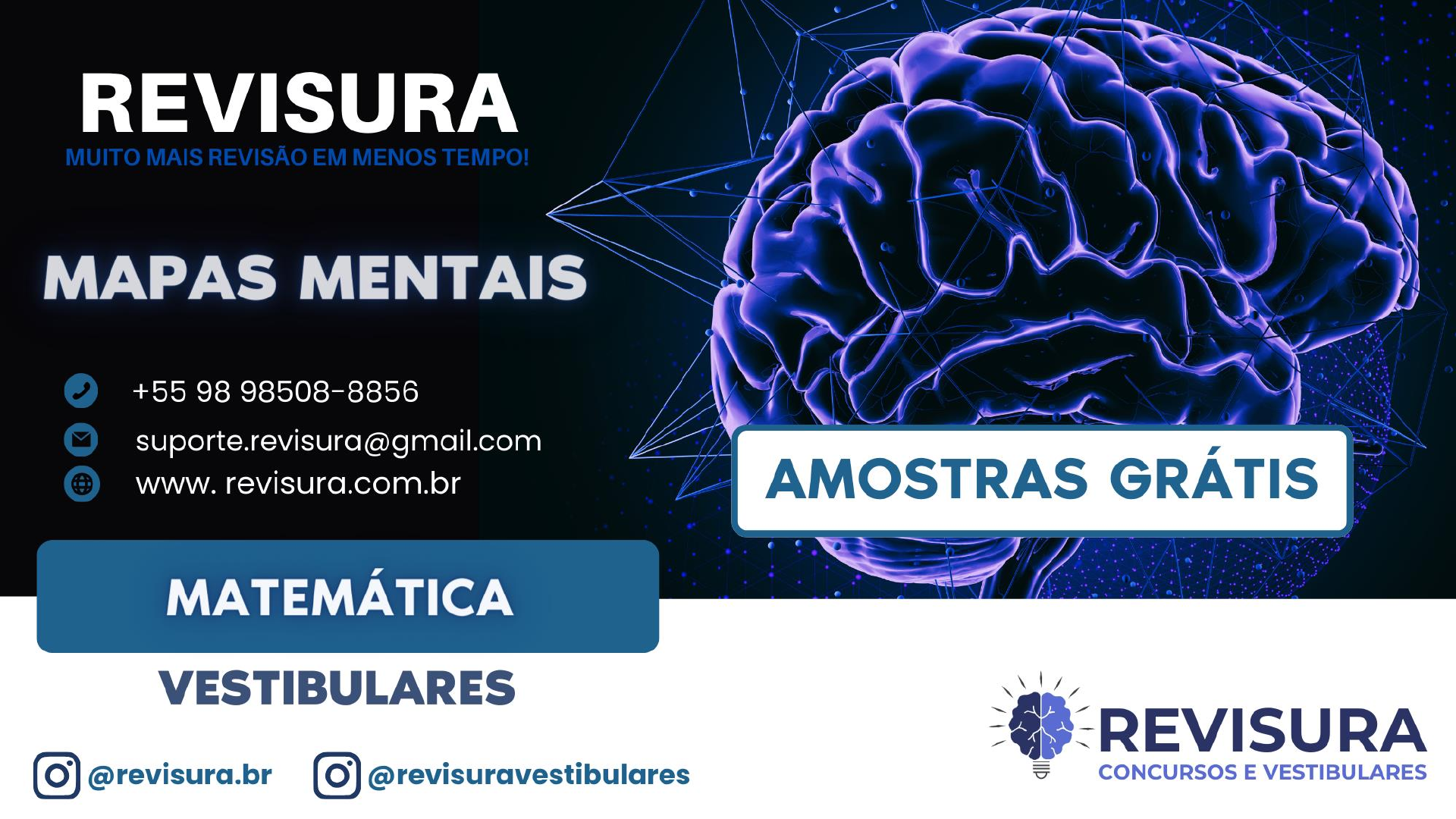 Olá, bem-vindo(a)! Faça hoje a mudança necessária que vai impactar os seus resultados. Olá, meu amigo(a) vestibulando(a), seja bem-vindo(a) aos Mapas Mentais do Revisura. Sempre com o objetivo de ajudar você a conquistar a tão sonhada aprovação, trouxemos uma amostra dos nossos Mapas Mentais da disciplina de Matemática Vestibulares, para que você possa conhecer um pouco mais desse material que está conquistando os nossos alunos. Está cansado de ir na teoria várias vezes por falta de informações nos mapas de revisão? Adquira já a versão completa com atualização grátis por 1 anos e tenha em suas mãos os mapas mais completos do mercado. Disponível também em outras disciplinas. Surgiu alguma dúvida? A equipe de suporte está pronta para ajudar você. Revisura Maps @revisura.br suporte.revisura@gmail.com (98) 98508-8856 @revisuravestibulares 1. Tabelas e Gráficos 2. Geometria Plana 3. Geometria Espacial 4. Razão e Proporção 5. Regra de três (Simples e Composta) 6. Funções, Função 1º e 2º Grau, Função Modular 7. Função Exponencial, Logaritmos e Função Logarítmica 8. Estatística Descritiva 9. Cálculos com Porcentagem 10. Sistemas de Medidas, Orientação Temporal e Espacial 11. Probabilidade 12. Expressões (Aritméticas e Algébricas), Equações e Inequações 13. Operações com Números Inteiros e Decimais 14. Análise Combinatória 15. Operações com Frações 16. Raciocínio Sequencial 17. Progressões Aritméticas e Geométricas 18. Geometria Analítica 19. Juros Simples e Compostos 20. Trigonometria 21. Potenciação e Radiciação 22. Matrizes e Determinantes 23. MMC e MDC 24. Sistemas Lineares 25. Ângulos 26. Operações com Conjuntos 27. Critérios de Divisibilidade 28. Polinômios 29. Números Complexos Quando multiplicamos o índice da raiz e o expoente do radicando pelo mesmo valor, o resultado não se altera. n am = n⋅p am⋅p 24 = 2⋅3 24⋅3 = 6 212 = 6 4096 = 4 Propriedades da Radiciação Ex.: Quando multiplicamos raízes com o mesmo índice devemos mantê-lo, multiplicando os radicais. n a ⋅ n b = n a⋅b 3 2 ⋅ 3 4 = 3 2⋅4 = 3 8 = 2Ex.: Quando o radicando é uma fração, podemos extrair as raízes do numerador e denominador de forma separada. n a b = n a n b Ex.: 4 25 = 4 25 = 2 5Sendo b ≠ 0 Uma potência de uma raiz é igual a mesma raiz com o radicando elevado ao expoente da potência. n a m = n am 2 4 = 24 = 16 = 4Ex: Propriedade 3: Propriedade 4: Propriedade 5: Propriedade 6: Propriedade 7: Quando temos a raiz de uma raiz, mantemos o radicando e multiplicamos os índices. n m a = n⋅m a 3 5 7 = 3⋅5 7 = 15 7Ex.: Racionalização de Denominadores Conceito Procedimento matemático utilizado para transformar uma fração com um denominador radical (raiz) em uma fração equivalente com um denominador inteiro. 1º Caso: 2º Caso: 3º Caso: a no denominador. Multiplica-se o numerador e o denominador por a. Ex.: 7 5 = 7 5 ∙ 5 5 = 7∙ 5 25 = 7 5 5 n am no denominador. Multiplica-se o numerador e o denominador por um termo que seja possível cancelar a raiz. Geralmente multiplica-se por: n an−m Ex.: 5 3 4 = 5 3 4 ∙ 3 42 3 42 = 5∙ 3 42 3 43 = 5 3 42 4 ( a + b) ou ( a - b) no denominador. Geralmente usa-se o “produto da soma pela diferença”. Multiplica-se o numerador e o denominador por um termo que seja possível cancelar a raiz. Ex.: = 3 7 + 5 ∙ 7 − 5 7 − 5 3 7 + 5 = 3∙( 7− 5) 7 2 − 5 2 = 3( 7 − 5) 7 − 5 3 7+ 5 = 3( 7 − 5) 2 Orientação Temporal Calendário Semana 1 semana tem 7 dias. Os dias da semana se repetem continuamente (sequência cíclica). Exemplo: Supondo que hoje é segunda-feira, qual dia da semana será daqui a 58 dias? Devemos dividir 58 dias por 7 (dias de uma semana) e observamos o resto. 58 7 8(-)56 (2) Logo, daqui a 58 dias teremos exatamente o mesmo dia da semana que ocorrerá em 2 dias. Logo: Quarta-feira Mês Não são períodos regulares. Podem ter 30 ou 31 dias e fevereiro tem 28 dias ou 29 (Bissexto) . Bizu: Para descobrir se o mês é de 30 dias ou 31, usamos a dica do punho fechado. Os meses posicionados nos ossos têm 31 dias. Os meses posicionados nas cartilagens têm 30 dias. Janeiro Março Maio Julho Agosto Outubro Dezembro Fevereiro Abril Junho Setembro Novembro Ossos Cartilagens Propriedades bm ∙ bn = bm+n Repetimos a base e somamos os expoentes. 23∙ 22 = 23+2 = 25 = 32 Ex.: Produto de potências de mesma base Divisão de potências de mesma base bm ÷ bn = bm bn = bm−n Repetimos a base e subtraímos os expoentes. 35 ÷ 33 = 35 33 = 35−3 = 32 = 9 Ex.: bm n = bm∙n Mantemos a base e multiplicamos os expoentes. 23 2 = 23∙2 = 26 = 64 am ∙ bm ∙ cm = a ∙ b ∙ c m am ÷ bm = am bm = a b m Potência de potência Ex.: Distributiva em relação à multiplicação Distributiva em relação à divisão Multiplicamos as bases e mantemos o expoente. Ex.: 22∙ 32 ∙ 52= 2 ∙ 3 ∙ 5 2 = 302 = 900 Dividimos as bases e mantemos o expoente. 63÷33= 63 33 = 6 3 3 =23=8Ex.: da potenciação Análise Combinatória Princípio Fundamental da Contagem É o total de possibilidades de o evento ocorrer. Princípio multiplicativo:1) 2) Princípio aditivo: (“e”)P1 ∙ P2 ∙ P3 ∙ ... Pn (“ou”)P1 + P2 + P3 ∙ ... Pn Exemplo: De quantas formas diferentes Pedro pode se vestir, considerando que ele tem 4 camisas, 2 bermudas, 1 calça e 2 sapatos? Para Pedro se vestir, temos as seguintes condições: Uma camisa e uma bermuda ou uma calça e um sapato (repare nas conjunções “e” e “ou”) Logo, temos: Camisas Calça Sapatos Bermudas 4 ∙ (2+1) ∙ 2 = 24 maneiras e eou Estuda a quantidade de agrupamentos formados por elementos de um determinado conjunto, levando em consideração certas condições. Conceito Bizu: Somamos calça com bermuda, pois Pedro não pode usar as duas ao mesmo tempo. Dado 1 dado tem 6 faces. 1 dado tem 3 números pares. 1 dado tem 3 números ímpares. Exemplo: Qual a probabilidade de sair um número ímpar? Axioma de Kolmog