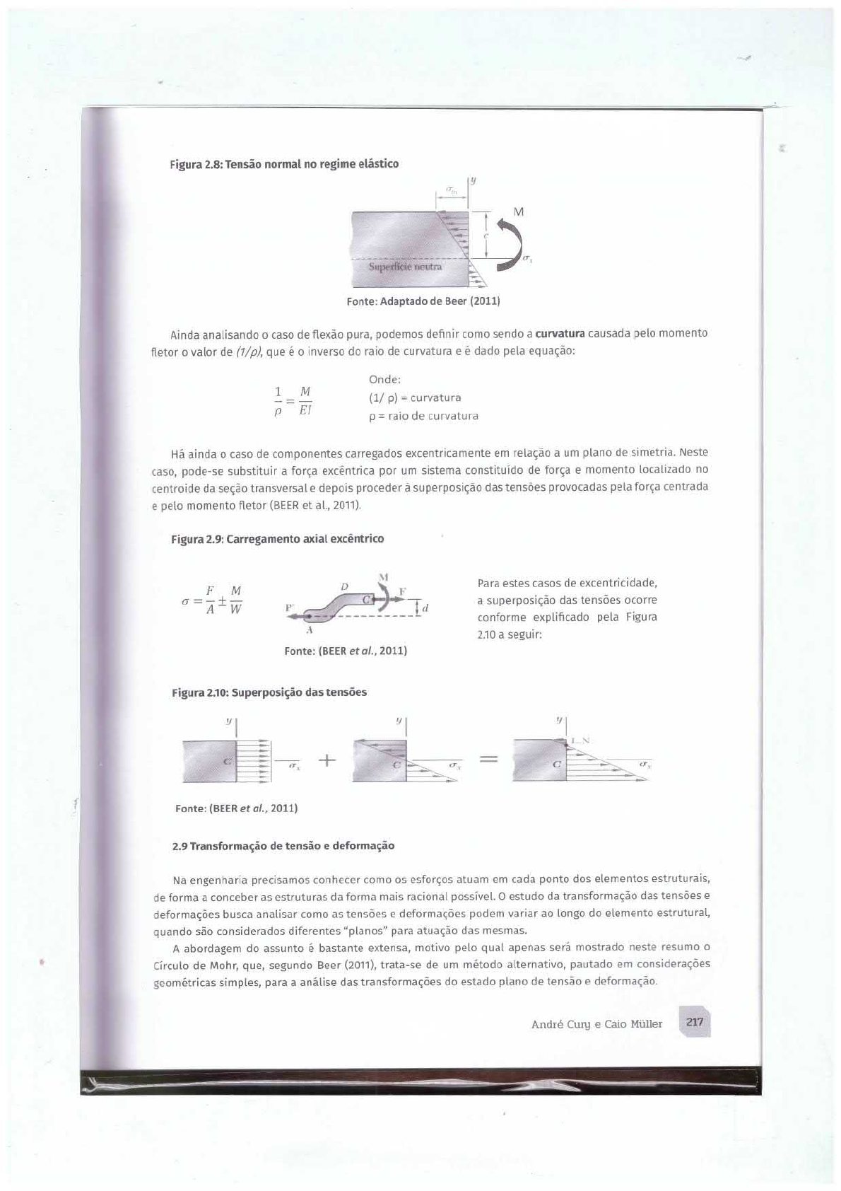 Figura 2.8: Tensão normal no regime elástico M Superficie neutra Fonte: Adaptado de Beer (2011) Ainda analisando o caso de flexão pura, podemos definir como sendo a curvatura causada pelo momento fletor o valor de (1/p), que é o inverso do raio de curvatura e é dado pela equação: Onde: 1 M - (1/ p) = curvatura p p = raio de curvatura Há ainda o caso de componentes carregados excentricamente em relação a um plano de simetria. Neste caso, pode-se substituir a força excêntrica por um sistema constituído de força e momento localizado no centroide da seção transversal e depois proceder à superposição das tensões provocadas pela força centrada e pelo momento fletor (BEER et al., 2011). Figura 2.9: Carregamento axial excêntrico M M D Para estes casos de excentricidade, A F F = + C a superposição das tensões ocorre W d conforme explificado pela Figura A a seguir: Fonte: (BEER et al., 2011) Figura 2.10: Superposição das tensões y C + C C Fonte: (BEER et al., 2011) 2.9 Transformação de tensão e deformação Na engenharia precisamos conhecer como os esforços atuam em cada ponto dos elementos estruturais, de forma a conceber as estruturas da forma mais racional o estudo da transformação das tensões e deformações busca analisar como as tensões e deformações podem variar ao longo do elemento estrutural, quando são considerados diferentes "planos" para atuação das mesmas. A abordagem do assunto é bastante extensa, motivo pelo qual apenas será mostrado neste resumo o Circulo de Mohr, que, segundo Beer (2011), trata-se de um método alternativo, pautado em considerações geométricas simples, para a análise das transformações do estado plano de tensão e deformação. Cury e Caio 217Dado estado de tensão mostrado na Figura 2.11(a), representamos o ponto X de coordenadas e ponto Y de coordenadas (Figura 2.11b). Traçando o de diâmetro XY, obtemos o circulo de Mohr (BEER et al., 2011). Ainda segundo Beer (2011), as abscissas dos pontos de intersecção A e B do circulo com eixo horizontal representam as tensões principais, e o ângulo de rotação que faz coincidir o diâmetro XY com AB é duas vezes o ângulo que define os planos principais na Figura 2.11(a), tendo ambos os ângulos o mesmo sentido. Observa-se também que diâmetro DE define a tensão de cisalhamento máxima e a orientação do plano correspondente o de Mohr pode ser utilizado de forma para deformações. Para este caso deve ser esta- belecido um sistema de coordenadas tal que a abscissa represente a deformação normal (E), e a ordenada represente metade do valor da deformação por cisalhamento (y/2) (HIBBELER, 2004). Para maior aprofundamento, recomenda-se consultar as referências expostas ao final des- te resumo. Figura 2.11: Circulo de Mohr para tensão min (a) Fonte: Adaptado de Beer (2011) B C a min a (c) (b) 3. AÇÕES E SEGURANÇA NAS ESTRUTURAS 3.1 Introdução e principais normas Para que sejam atendidas as verificações de segurança das estruturas usuais da construção civil, deve-se seguir as normativas estabelecidas pela ABNT. Quando se fala em segurança das estruturas, a 218 Análise Estruturalprincipal norma a ser considerada é a NBR 8681:2003, que trata sobre Ações e segurança nas estruturas. Esta norma, além de ter definições importantes para a estrutural, é aplicável para todos os materiais estruturais usualmente empregados na construção civil (NBR 8681 Ações e segurança nas estruturas - Pro- cedimento, 2003), motivo pelo qual a mesma será abordada nesta seção. da norma anteriormente citada, outras normas também são de bastante importância dentro da estrutural por balizarem de maneira transversal os projetos estruturais utilizando os diversos ma- teriais construtivos, tais como a NBR 6120 - Cargas para o cálculo de estruturas de edificações, a NBR 6123 Forças devidas ao vento em edificações, a NBR 15575 Edificações habitacionais Desempenho, entre outras. 3.2 Conceitos e definições iniciais Estão dispostos a seguir alguns dos principais conceitos e definições relacionados a análise estrutural e extraídos da NBR 8681. Estados Limites de uma estrutura: Estados a partir dos quais a estrutura apresenta desempenho ina- dequado às finalidades da construção. Estados Limites Estados que, pela sua simples ocorrência, determinam a paralisação, no todo ou em parte, do uso da construção. Estados Limites de Serviço(ELS): Estados que, por sua ocorrência, repetição ou duração, causam efeitos estruturais que não respeitam as condições especificadas para uso normal da construção, ou que são indicios de comprometimento da durabilidade da estrutura. Ações: Causas que provocam esforços ou deformações nas estruturas. Do ponto de vista as forças e as deformações impostas pelas ações são consideradas como se fossem as próprias ações. As deformações impostas são por vezes designadas por ações indiretas e as forças, por ações diretas. Ações Permanentes: Ações que ocorrem com valores constantes ou de pequena variação em torno de sua média, durante praticamente toda a vida da construção. A variabilidade das ações permanentes é medida num conjunto de construções Ações Ações que ocorrem com valores que apresentam variações significativas em torno de sua durante a vida da construção. Ações Excepcionais: Ações excepcionais são as que têm duração extremamente curta e muito baixa probabilidade de ocorrência durante a vida da construção, mas que devem ser consideradas nos pro- jetos de determinadas estruturas Cargas Acidentais: Cargas acidentais são as ações variáveis que atuam nas construções em função de seu uso (pessoas, mobiliário, veículos, materiais diversos etc.). 3.3 Tipos de ações e carregamentos Na figura a seguir estão evidenciadas as classificações das ações, bem como estão exemplificados seus principais tipos. Figura 3.1: Classificação e tipos das ações Pe