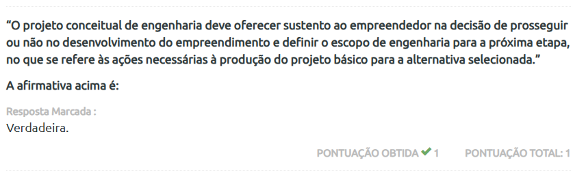 "O projeto conceitual de engenharia deve oferecer sustento ao empreendedor na decisão de prosseguir ou não no desenvolvimento do empreendimento e definir escopo de engenharia para a próxima etapa, no que se refere às ações necessárias à produção do projeto básico para a alternativa selecionada." A afirmativa acima é: Resposta Marcada : Verdadeira. PONTUAÇÃO OBTIDA 1 PONTUAÇÃO 1