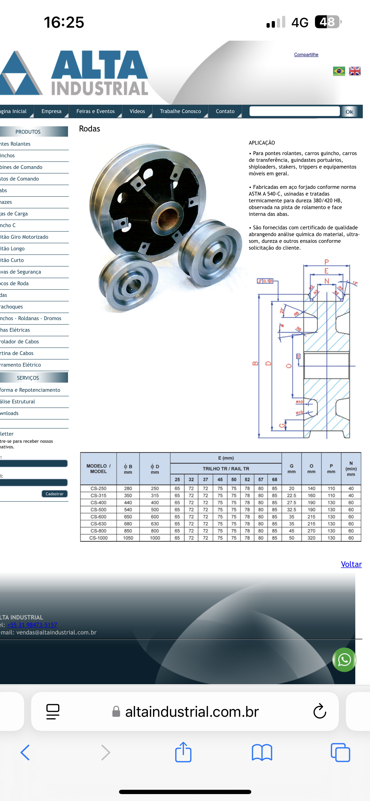16:25 4G 48 Compartilhe ALTA INDUSTRIAL Inicial Empresa Feiras Eventos Vídeos Trabalhe Conosco Contato Ok Rodas PRODUTOS Rolantes APLICAÇÃO Para pontes rolantes, carros guincho, carros inchos de transferência, guindastes portuários, bines de Comando shiploaders, stakers, trippers e equipamentos móveis em geral. stos de Comando Fabricadas em aço forjado conforme norma abs ASTM A 540-C. usinadas e tratadas hazes . termicamente para dureza 380/420 HB, observada na pista de rolamento e face las de Carga interna das abas. ncho São fornecidas com certificado de qualidade abrangendo análise química do material, ultra- itão Giro Motorizado som, dureza e outros ensaios conforme itão Longo solicitação do cliente. itão Curto P vas de Segurança E N de Roda das rachoques Roldanas Dromos has Elétricas rolador de Cabos rtina de Cabos rramento Elétrico SERVICOS forma e Repotenciamento álise Estrutural R10 wnloads letter tre-se para receber nossos (mm) N MODELO D G o P TRILHO TR RAIL TR (min) MODEL mm mm mm mm mm mm 25 32 37 45 50 52 57 68 CS-250 280 250 65 72 72 75 75 78 80 85 20 140 110 40 CS-315 350 315 65 72 72 75 75 78 80 85 160 110 40 CS-400 440 400 65 72 72 75 75 78 80 85 190 130 60 CS-500 540 500 65 72 72 75 75 78 80 85 32.5 190 130 60 CS-600 650 600 65 72 72 75 75 78 80 85 35 215 130 60 CS-630 680 630 65 72 72 75 75 78 80 85 35 215 130 60 CS-800 850 800 65 72 72 75 75 78 80 85 45 270 130 60 CS-1000 1050 1000 65 72 72 75 75 78 80 85 50 320 130 60 Voltar LTA INDUSTRIAL el: mail: vendas@altaindustrial.com.br altaindustrial.com.br