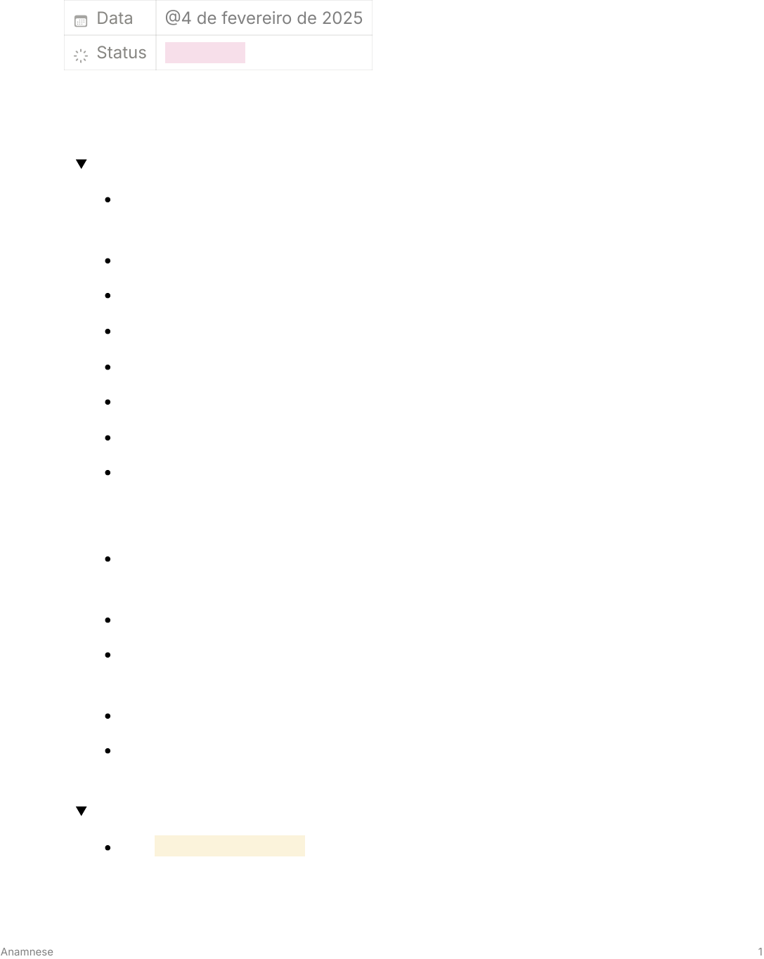 Anamnese Data Status Concluído Estrutura da anamnese Identificação Perfil sociodemográfico que possibilita a interpretação dos dados individuais e coletivos do paciente Nome idade sexo/gênero cor/etnia estado civil profissão, local de trabalho → exposição naturalidade, procedência, residência: importância por conta dos surtos. Por exemplo, procedência do RS durante as enchentes, porém agora mora em Bauru nome da mãe → para diferenciar de outros pacientes com mesmo nome, cor, idade religião → restrições. Ex: receber doação de sg nome do responsável/ cuidador/ acompanhante → quem da informações também filiação a instituições previdenciárias e planos de saúde Quem é o paciente? Claúdia da Silva, 40 anos, advogada, parda, casada, acompanhada da sua filha, plano de saúde unimed Queixa principal/ queixa e duração É o motivo da consulta 4 de fevereiro de 2025 Anamnese 1 Sintomas ou problemas que motivaram o paciente a procurar atendimento médico Deve ser anotado com as palavras do paciente, que podem ser redigidas entre aspas Tentar sempre encontrar um queixa única que mais incomoda o paciente, mesmo quando ele traz muitas queixas. Não utilizar diagnósticos na queixa principal! ex: paciente relata que está com enchaqueca, então é necessário perguntar por que ele acha que está com isso e escrever esse motivo História da doença atual/história pregressa da moléstia atual Registro cronológico e detalhado do problema atual de saúde do paciente, desde o início até a data atual Uso de termos técnicos Caracterizar o sintoma guia!!! Tirar todas as informações relacionadas ao motivo que levou o paciente ao atendimento médico Contar uma história com começo, meio e fim Paciente com tosse a 2 dias: palavras chaves que devem estar na história da doença atual INÍCIO CARACTERÍSTICA/QUALIDADE FATORES ASSOCIADOS (o que está sentindo junto da tosse) FATOR DE MELHORA/FATOR DE PIORA/ FATOR DESENCADEANTE →FREQUÊNCIA EVOLUÇÃO paciente 1 tosse há 2 dias → tosse com expectoração hialina → odinofagia e cefaleia → fator de melhora: dipirona, nega fator de piora, fator desencadeante é contato com covid → contínua → mantém os sintomas semelhantes desde o início paciente 2 tosse há 8 meses → hemoptise → perde peso (8kg), febre noturna 38°C e sudorese noturna → nega fator de melhora, piora e desencadeante → contínua → quadro piorando progressivamente+ Interrogatório sintomatológico/ interrogatório sobre os diversos aparehos e sistemas Avaliação detalhada dos sintomas de cada sistema corporal → revisão dos sistemas Anamnese 2 Complemetar a HDA e avaliar práticas de promoção à saúde Importante sistematizar para não esquecer → de cima para baixo Uso de termos técnicos: enterorragia (sg vivo nas fezes), melena (sg escuro nas fezes) , epistaxe (sangramento nasal), fotobia, otalgia (dor no ouvido), hematêmese (vômito com sg), disúria (ardencia ao urinar), polaciúria (aumento da frequência), poliúria (aumento do volume), purido (coceira), dispneia (falta de ar), halitose (mal hálito), disfagia (dificuldade ao engolir), linfadenomegalia (aumento dos linfonodos), pirose (sensação de queimação gástrica), esteatorréia (gordura nas fezes), hemoptise (tosse com sg) Sintomas gerais Pele e fâneros Cabeça e pescoço Tórax Abdome Sistemas urinário e genital Sistema hemolinfopoético Sistema endócrino Coluna vertebral, ossos, articulações e extremidades Músculos Artérias, veias, linfáticos e microcirculação Sistema nervoso Exame psíquico e avaliação das condições emocionais. Antecedentes pessoais Avaliação do estado de saúde passado e presente do paciente, conhecendo os fatores pessoais e familiares que influenciam seu processo saúde-doença Estado de saúde passado e presente que influenciam seu processo de saúde-doença. Abrange antecedentes fisiológicos e patológicos Antecedentes pessoais fisiológicos: (condições de gestação e nascimento, desenvolvimento psicomotor e neural, desenvolvimento Anamnese 3 sexual) Antecedentes pessoais patológicos: (doenças da infância e da vida adulta; alergias; cirurgias ou intervenções; traumatismos; transfusões sanguíneas; história obstétrica; vacinas; medicamentos em uso) Comorbidades: diabetes, hipertensão Antecedentes familiares Estado de saúde dos pais e irmãos. Quando casado, do cônjuge. Filhos, se tiver. Pode também interrogar sobre avós, tios e primos Quando familiar faleceu, descrever a causa e a idade do óbito caso interesse Hábitos e estilo de vida Documentar hábitos e estilo de vida do paciente, incluindo ingesta alimentar diária e usual, prática de exercícios, história ocupacional, uso de tabaco, uso de fogão a lenha, uso de bebidas alcoólicas, utilização de outras substâncias de drogas ilícitas e uso de anabolizantes e anfetamina Condições sócio-econômicas e culturais Avaliar as condições de habitação do paciente, além de vínculos afetivos familiares, condições financeiras, atividades de lazer, filiação religiosa e crenças espirituais, bem como escolaridade Anamnese 4