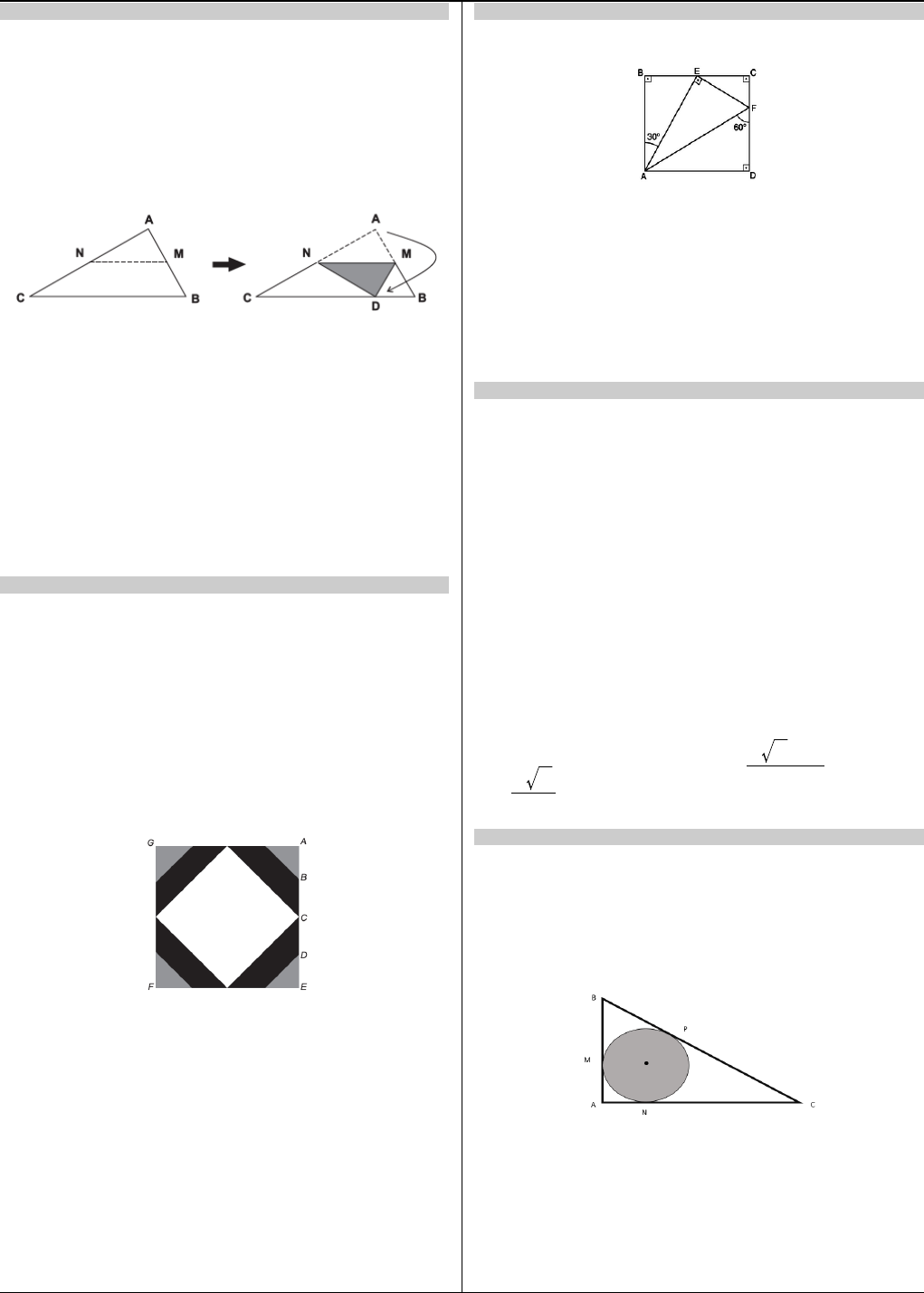 Página328 enem2024 QUESTÃO 10 Um professor, ao fazer uma atividade de origami (dobraduras) com seus alunos, pede para que estes dobrem um pedaço de papel em forma triangular, como na figura a seguir, de modo que M e N sejam pontos médios respectivamente de AB e AC, e D, ponto do lado BC, indica a nova posição do vértice A do triângulo ABC. Se ABC é um triângulo qualquer, após a construção, são exemplos de triângulos isósceles os triângulos A CMA e CMB. B CAD e ADB. C NAM e NDM. D CND e DMB. E CND e NDM. QUESTÃO 11 A logomarca de uma empresa de computação é um quadrado, AEFG, com partes pintadas como mostra a figura. Sabe-se que todos os ângulos agudos presentes na figura medem 45º e que AB = BC = CD = DE. A fim de divulgar a marca entre os empregados, a gerência decidiu que fossem pintadas logomarcas de diversos tamanhos nas portas, paredes e fachada da empresa. Pintadas as partes cinza de todas as logomarcas, sem desperdício e sem sobras, já foram gastos R$ 320,00. O preço das tintas cinza, preta e branca é o mesmo. Considerando que não haja desperdício e sobras, o custo para pintar as partes pretas e o custo para pintar as partes brancas serão, respectivamente, A R$ 320,00 e R$ 640,00. B R$ 640,00 e R$ 960,00. C R$ 960,00 e R$ 1.280,00. D R$ 1.280,00 e R$ 2.240,00. E R$ 2.240,00 e R$ 2.560,00. QUESTÃO 12 Se na figura abaixo AB = 9 cm, o segmento DF mede, em cm: *obs: ABCD não é um quadrado. A 5 B 4 C 8 D 7 E 6 QUESTÃO 13 A empresa SWED celulose faz o transporte de seus rolos em containers num formato de um cilindro. Em cada um deles são transportados três rolos de celulose de raio igual a 1m, tangentes entre si dois a dois e os três tangentes ao cilindro que os contém. Contudo, a empresa está interessada em descobrir o espaço que fica vago entre os rolos de celulose e o container que os contém, para preenchê-lo com resíduos de papel. Para conhecer o espaço vago, é necessário determinar o raio do cilindro que contém os três cilindros pequenos. Esse raio é igual a A √3 m B √3 + 1 m C 3 2 3 m D √3 + 2 m E 3 2 3 3 m+ QUESTÃO 14 A figura a seguir representa um tablado ABC, em forma de triângulo retângulo, com  = 90°, sobre o qual foi colocado um tapete circular de 3 m de raio. As bordas do tapete tangenciam os lados AB, AC e BC do tablado nos pontos M, N e P respectivamente. Se MB = 5 m, o perímetro do tablado, em metros, é igual a A 40 B 38 C 36 D 34 E 32 Página329 enem2024 QUESTÃO 15 A figura que segue é formada por 5 quadrados congruentes, cuja medida do lado é L, e um quadrado ABCD com vértices em um único vértice de quatro dos cinco quadrados. A área do quadrado ABCD é equivalente à área de um retângulo de lados A 2 L e 3 L. B 3 L e 1L. C 3 L e 3 L. D 4 L e 1L. E 5 L e 1 L QUESTÃO 16 Uma escola tem um terreno vazio no formato retangular cujo perímetro é 40 m, onde se pretende realizar uma única construção que aproveite o máximo de área possível. Após a análise realizada por um engenheiro, este concluiu que para atingir o máximo de área do terreno com uma única construção, a obra ideal seria A um banheiro com 8 m². B uma sala de aula com 16 m². C um auditório com 36 m². D um pátio com 100 m². QUESTÃO 18 Na zona rural, a utilização de unidades de medida como o hectare é bastante comum. O hectare equivale à área de um quadrado de lado igual a 100 metros. Na figura, há a representação de um terreno por meio da área em destaque. Nesta figura, cada quadrado que compõe esta malha representa uma área de 1 hectare. O terreno em destaque foi comercializado pelo valor R$ 3.600.000,00. O valor do metro quadrado desse terreno foi de A R$ 30,00. B R$ 300,00. C R$ 360,00. D R$ 3.600,00. E R$ 300.000,00. QUESTÃO 17 Numa sementeira, cinco canteiros quadrados serão preparados para plantar, em cada um, dois tipos de sementes: A e B. Os canteiros estão representados segundo as figuras: Suponha que cada canteiro tem 1 m² de área e que nas regiões sombreadas de cada canteiro serão plantadas as sementes do tipo A. Qual o total da área, em m², reservada para as sementes do tipo B? A 1,25 B 2 C 2,5 D 3 E 5 QUESTÃO 19 Em um terreno, deseja-se instalar uma piscina com formato de um bloco retangular de altura 1 m e base de dimensões 20 m x 10 m. Nas faces laterais e no fundo desta piscina será aplicado um líquido para a impermeabilização. Esse líquido deve ser aplicado na razão de 1 L para cada 1m² de área a ser impermeabilizada. O fornecedor A vende cada lata de impermeabilizante de 10 L por R$ 100,00, e o B vende cada lata de 15 L por R$ 145,00. Determine a quantidade de latas de impermeabilizante que deve ser comprada e o fornecedor a ser escolhido, de modo a se obter o menor custo. A Fabricante A, 26 latas. B Fabricante A, 46 latas. C Fabricante B, 17 latas. D Fabricante B, 18 latas. E Fabricante B, 31 latas. Página330 enem2024 QUESTÃO 20 Vítor deseja revestir uma sala retangular de dimensões 3 m x 4 m, usando um tipo de peça de cerâmica. Em uma pesquisa inicial, ele selecionou cinco tipos de peças disponíveis, nos seguintes formatos e dimensões: • Tipo I: quadrados, com 0,5 m de lado. • Tipo II: triângulos equiláteros, com 0,5 m de lado. • Tipo III: retângulos, com dimensões 0,5 m x 0,6 m. • Tipo IV: triângulos retângulos isósceles, cujos catetos medem 0,5 m. • Tipo V: quadrados, com 0,6 m de lado. Analisando a pesquisa, o mestre de obras recomendou que Vítor escolhesse um tipo de piso que possibilitasse a utilização do menor número de peças e não acarretasse sobreposições ou cortes nas cerâmicas. Qual o tipo de piso o mestre de obras recomendou que fosse comprado? A Tipo I. B Tipo II. C Tipo III. D Tipo IV. E Tipo V. QUESTÃO 21 O trio matemático Astolfo, Rodolfo e Adolfo, intercambiavam sobre duas regiões, uma com a forma de um quadrado e a outra com a forma de um hexágono regular. Ambas regiões têm uma grande importância, seja para o estud