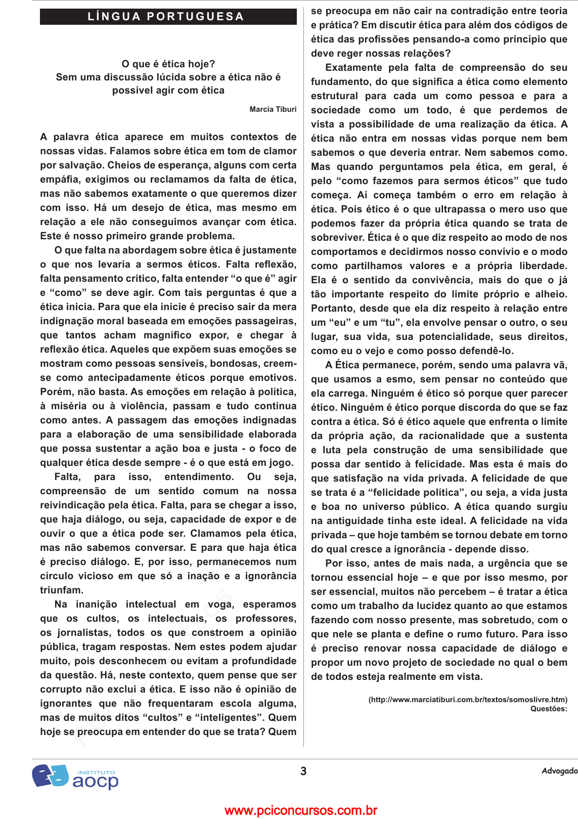 pcimarkpci MDAwMDowMDAwOjAwMDA6MDAwMDowMDAwOmZmZmY6ZDhlZTo2NTFl:U2F0LCAxNSBGZWIgMjAyNSAyMTowNzowOCAtMDMwMA== www.pciconcursos.com.br 3 Advogado L Í N G U A P O R T U G U E S A O que é ética hoje? Sem uma discussão lúcida sobre a ética não é possível agir com ética Marcia Tiburi A palavra ética aparece em muitos contextos de nossas vidas. Falamos sobre ética em tom de clamor por salvação. Cheios de esperança, alguns com certa empáfia, exigimos ou reclamamos da falta de ética, mas não sabemos exatamente o que queremos dizer com isso. Há um desejo de ética, mas mesmo em relação a ele não conseguimos avançar com ética. Este é nosso primeiro grande problema. O que falta na abordagem sobre ética é justamente o que nos levaria a sermos éticos. Falta reflexão, falta pensamento crítico, falta entender “o que é” agir e “como” se deve agir. Com tais perguntas é que a ética inicia. Para que ela inicie é preciso sair da mera indignação moral baseada em emoções passageiras, que tantos acham magnífico expor, e chegar à reflexão ética. Aqueles que expõem suas emoções se mostram como pessoas sensíveis, bondosas, creem- se como antecipadamente éticos porque emotivos. Porém, não basta. As emoções em relação à política, à miséria ou à violência, passam e tudo continua como antes. A passagem das emoções indignadas para a elaboração de uma sensibilidade elaborada que possa sustentar a ação boa e justa - o foco de qualquer ética desde sempre - é o que está em jogo. Falta, para isso, entendimento. Ou seja, compreensão de um sentido comum na nossa reivindicação pela ética. Falta, para se chegar a isso, que haja diálogo, ou seja, capacidade de expor e de ouvir o que a ética pode ser. Clamamos pela ética, mas não sabemos conversar. E para que haja ética é preciso diálogo. E, por isso, permanecemos num círculo vicioso em que só a inação e a ignorância triunfam. Na inanição intelectual em voga, esperamos que os cultos, os intelectuais, os professores, os jornalistas, todos os que constroem a opinião pública, tragam respostas. Nem estes podem ajudar muito, pois desconhecem ou evitam a profundidade da questão. Há, neste contexto, quem pense que ser corrupto não exclui a ética. E isso não é opinião de ignorantes que não frequentaram escola alguma, mas de muitos ditos “cultos” e “inteligentes”. Quem hoje se preocupa em entender do que se trata? Quem se preocupa em não cair na contradição entre teoria e prática? Em discutir ética para além dos códigos de ética das profissões pensando-a como princípio que deve reger nossas relações? Exatamente pela falta de compreensão do seu fundamento, do que significa a ética como elemento estrutural para cada um como pessoa e para a sociedade como um todo, é que perdemos de vista a possibilidade de uma realização da ética. A ética não entra em nossas vidas porque nem bem sabemos o que deveria entrar. Nem sabemos como. Mas quando perguntamos pela ética, em geral, é pelo “como fazemos para sermos éticos” que tudo começa. Aí começa também o erro em relação à ética. Pois ético é o que ultrapassa o mero uso que podemos fazer da própria ética quando se trata de sobreviver. Ética é o que diz respeito ao modo de nos comportamos e decidirmos nosso convívio e o modo como partilhamos valores e a própria liberdade. Ela é o sentido da convivência, mais do que o já tão importante respeito do limite próprio e alheio. Portanto, desde que ela diz respeito à relação entre um “eu” e um “tu”, ela envolve pensar o outro, o seu lugar, sua vida, sua potencialidade, seus direitos, como eu o vejo e como posso defendê-lo. A Ética permanece, porém, sendo uma palavra vã, que usamos a esmo, sem pensar no conteúdo que ela carrega. Ninguém é ético só porque quer parecer ético. Ninguém é ético porque discorda do que se faz contra a ética. Só é ético aquele que enfrenta o limite da própria ação, da racionalidade que a sustenta e luta pela construção de uma sensibilidade que possa dar sentido à felicidade. Mas esta é mais do que satisfação na vida privada. A felicidade de que se trata é a “felicidade política”, ou seja, a vida justa e boa no universo público. A ética quando surgiu na antiguidade tinha este ideal. A felicidade na vida privada – que hoje também se tornou debate em torno do qual cresce a ignorância - depende disso. Por isso, antes de mais nada, a urgência que se tornou essencial hoje – e que por isso mesmo, por ser essencial, muitos não percebem – é tratar a ética como um trabalho da lucidez quanto ao que estamos fazendo com nosso presente, mas sobretudo, com o que nele se planta e define o rumo futuro. Para isso é preciso renovar nossa capacidade de diálogo e propor um novo projeto de sociedade no qual o bem de todos esteja realmente em vista. (http://www.marciatiburi.com.br/textos/somoslivre.htm) Questões: www.pciconcursos.com.br pcimarkpci MDAwMDowMDAwOjAwMDA6MDAwMDowMDAwOmZmZmY6ZDhlZTo2NTFl:U2F0LCAxNSBGZWIgMjAyNSAyMTowNzowOCAtMDMwMA== www.pciconcursos.com.br 4 Advogado QUESTÃO 01 Assinale a alternativa correta de acordo com o texto. (A) A ética deve ser pensada individualmente, a partir de uma reflexão pessoal que não envolva a relação com o outro. (B) As respostas sobre uma vida ética se encontram na educação, na opinião pública, nas escolas, com os professores, os cultos e os intelectuais. (C) Os indivíduos não sabem exatamente o que é ética porque lhes faltam a crítica e o entendimento sobre esse assunto. (D) Indignar-se moralmente com o que acontece de errado na prática cotidiana seria um exemplo de como exercitar ética. (E) A prática ética se limita ao que é necessário para sobreviver. QUESTÃO 02 De acordo com o texto, ainda há ignorância sobre a prática ética porque (A) apenas os intelectuais têm respostas sobre o assunto. (B) os indivíduos buscam a
