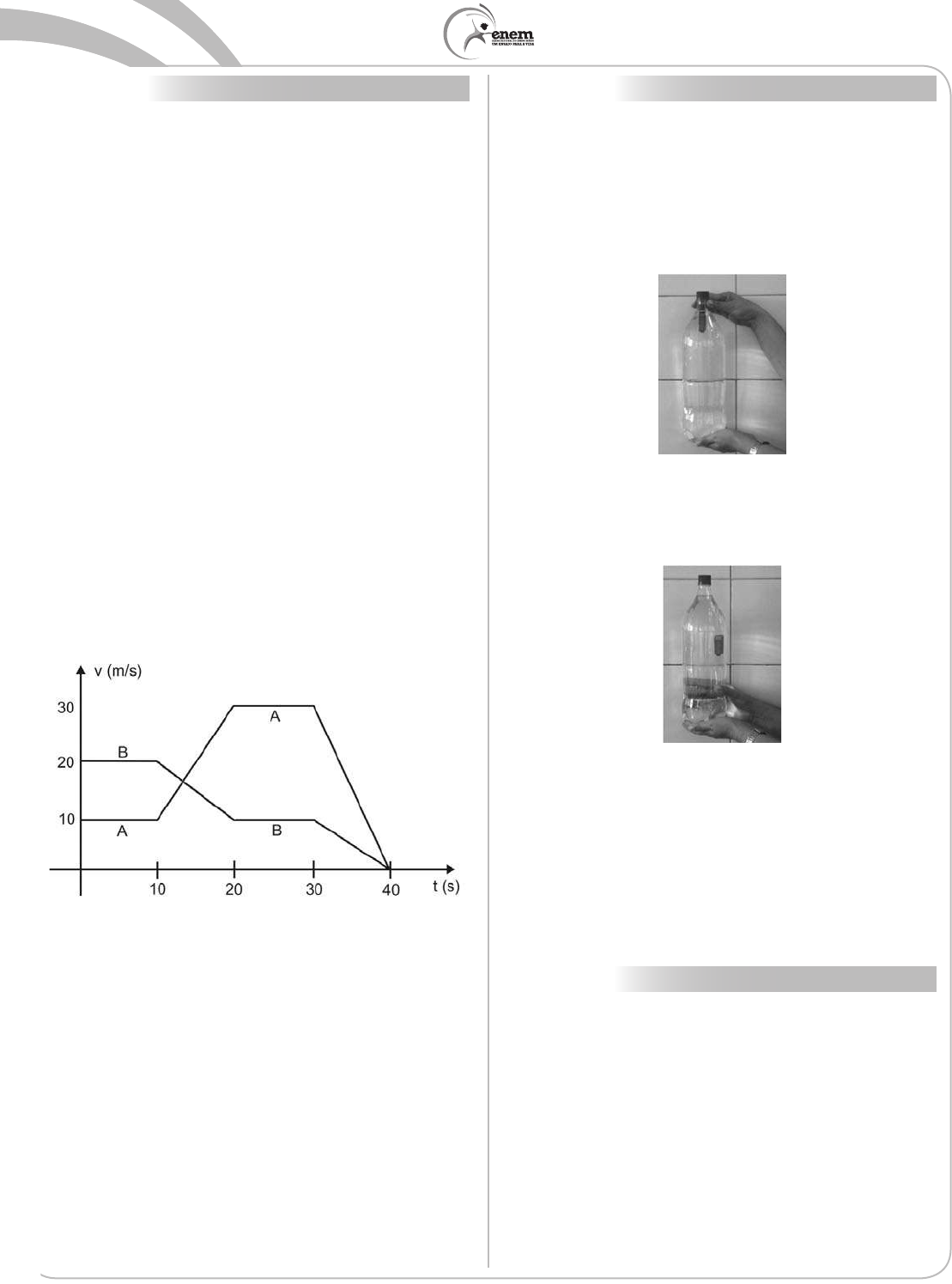 2010 *azul75sab20* CN - 1º dia | Caderno 1 - AZUL - Página 20 Questão 64 Rua da Passagem Os automóveis atrapalham o trânsito. Gentileza é fundamental. Não adianta esquentar a cabeça. Menos peso do pé no pedal. O trecho da música, de Lenine e Arnaldo Antunes (1999), ilustra a preocupação com o trânsito nas cidades, motivo de uma campanha publicitária de uma seguradora brasileira. Considere dois automóveis, A e B, respectivamente conduzidos por um motorista imprudente e por um motorista consciente e adepto da campanha citada. Ambos se encontram lado a lado no instante inicial t = 0 s, quando avistam um semáforo amarelo (que indica atenção, parada obrigatória ao se tornar vermelho). O movimento de A e B pode ser analisado por meio do gráfico, que representa a velocidade de cada automóvel em função do tempo. As velocidades dos veículos variam com o tempo em dois intervalos: (I) entre os instantes 10 s e 20 s; (II) entre os instantes 30 s e 40 s. De acordo com o gráfico, quais são os módulos das taxas de variação da velocidade do veículo conduzido pelo motorista imprudente, em m/s2, nos intervalos (I) e (II), respectivamente? A 1,0 e 3,0 B 2,0 e 1,0 C 2,0 e 1,5 D 2,0 e 3,0 E 10,0 e 30,0 Questão 65 Um brinquedo chamado ludião consiste em um pequeno frasco de vidro, parcialmente preenchido com água, que é emborcado (virado com a boca para baixo) dentro de uma garrafa PET cheia de água e tampada. Nessa situação, o frasco fica na parte superior da garrafa, conforme mostra a FIGURA 1. FIGURA 1 Quando a garrafa é pressionada, o frasco se desloca para baixo, como mostrado na FIGURA 2. FIGURA 2 Ao apertar a garrafa, o movimento de descida do frasco ocorre porque A diminui a força para baixo que a água aplica no frasco. B aumenta a pressão na parte pressionada da garrafa. C aumenta a quantidade de água que fica dentro do frasco. D diminui a força de resistência da água sobre o frasco. E diminui a pressão que a água aplica na base do frasco. Rascunho 2010 *azul75sab21* CN - 1º dia | Caderno 1 - AZUL - Página 21 Questão 66 Segundo Jeffrey M. Smith, pesquisador de um laboratório que faz análises de organismos geneticamente modificados, após a introdução da soja transgênica no Reino Unido, aumentaram em 50% os casos de alergias. “O gene que é colocado na soja cria uma proteína nova que até então não existia na alimentação humana, a qual poderia ser potencialmente alergênica”, explica o pesquisador. Correio do Estado/MS. 19 abr. 2004 (adaptado). Considerando-se as informações do texto, os grãos transgênicos que podem causar alergias aos indivíduos que irão consumi-los são aqueles que apresentam, em sua composição, proteínas A que podem ser reconhecidas como antigênicas pelo sistema imunológico desses consumidores. B que não são reconhecidas pelos anticorpos produzidos pelo sistema imunológico desses consumidores. C com estrutura primária idêntica às já encontradas no sistema sanguíneo desses consumidores. D com sequência de aminoácidos idêntica às produzidas pelas células brancas do sistema sanguíneo desses consumidores. E com estrutura quaternária idêntica à dos anticorpos produzidos pelo sistema imunológico desses consumidores. Questão 67 O efeito Tyndall é um efeito óptico de turbidez provocado pelas partículas de uma dispersão coloidal. Foi observado pela primeira vez por Michael Faraday em 1857 e, posteriormente, investigado pelo físico inglês John Tyndall. Este efeito é o que torna possível, por exemplo, observar as partículas de poeira suspensas no ar por meio de uma réstia de luz, observar gotículas de água que formam a neblina por meio do farol do carro ou, ainda, observar o feixe luminoso de uma lanterna por meio de um recipiente contendo gelatina. REIS, M. Completamente Química: Físico-Química. São Paulo: FTD, 2001 (adaptado). Ao passar por um meio contendo partículas dispersas, um feixe de luz sofre o efeito Tyndall devido A à absorção do feixe de luz por este meio. B à interferência do feixe de luz neste meio. C à transmissão do feixe de luz neste meio. D à polarização do feixe de luz por este meio. E ao espalhamento do feixe de luz neste meio. Questão 68 Experimentos realizados no século XX demonstraram que hormônios femininos e mediadores químicos atuam no comportamento materno de determinados animais, como cachorros, gatos e ratos, reduzindo o medo e a ansiedade, o que proporciona maior habilidade de orientação espacial. Por essa razão, as fêmeas desses animais abandonam a prole momentaneamente, a fim de encontrar alimentos, o que ocorre com facilidade e rapidez. Ainda, são capazes de encontrar rapidamente o caminho de volta para proteger os filhotes. VARELLA, D. Borboletas da alma: escritos sobre ciência e saúde. Companhia das Letras, 2006 (adaptado). Considerando a situação descrita sob o ponto de vista da hereditariedade e da evolução biológica, o comportamento materno decorrente da ação das substâncias citadas é A transmitido de geração a geração, sendo que indivíduos portadores dessas características terão mais chance de sobreviver e deixar descendentes com as mesmas características. B transmitido em intervalos de gerações, alternando descendentes machos e fêmeas, ou seja, em uma geração recebem a característica apenas os machos e, na outra geração, apenas as fêmeas. C determinado pela ação direta do ambiente sobre a fêmea quando ela está no período gestacional, portanto todos os descendentes receberão as características. D determinado pelas fêmeas, na medida em que elas transmitem o material genético necessário à produção de hormônios e dos mediadores químicos para sua prole de fêmeas, durante o período gestacional. E determinado após a fecundação, pois os espermatozoides dos machos transmitem as características para a prole e, ao nascerem, os indivíduos são selecionados pela ação do ambiente. Quest