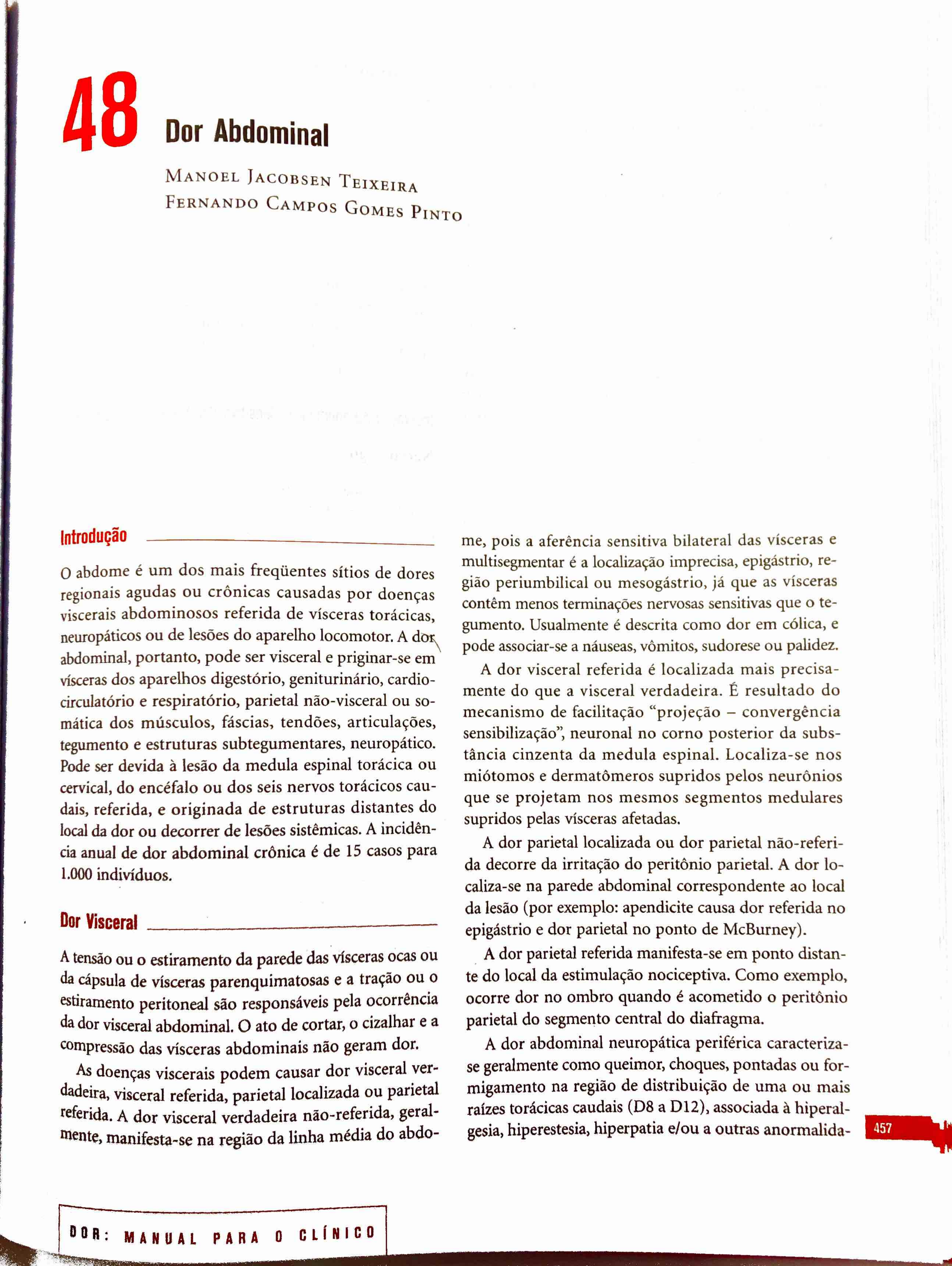 48 Dor Abdominal MANOEL JACOBSEN TEIXEIRA FERNANDO CAMPOS GOMES PINTO Introdução me, pois a aferência sensitiva bilateral das vísceras e multisegmentar é a localização imprecisa, epigástrio, re- o abdome é um dos mais sítios de dores gião periumbilical ou mesogástrio, já que as vísceras regionais agudas ou crônicas causadas por doenças contêm menos terminações nervosas sensitivas que o te- viscerais abdominosos referida de vísceras torácicas, gumento. Usualmente é descrita como dor em cólica, e neuropáticos ou de lesões do aparelho locomotor. A dor pode associar-se a náuseas, vômitos, sudorese ou palidez. abdominal, portanto, pode ser visceral e priginar-se em A dor visceral referida é localizada mais precisa- vísceras dos aparelhos digestório, geniturinário, cardio- mente do que a visceral verdadeira. É resultado do circulatório e respiratório, parietal não-visceral ou so- mecanismo de facilitação "projeção convergência mática dos músculos, fáscias, tendões, articulações, neuronal no corno posterior da subs- tegumento e estruturas subtegumentares, neuropático. tância cinzenta da medula espinal. Localiza-se nos Pode ser devida à lesão da medula espinal torácica ou miótomos e dermatômeros supridos pelos neurônios cervical, do encéfalo ou dos seis nervos torácicos cau- que se projetam nos mesmos segmentos medulares dais, referida, e originada de estruturas distantes do supridos pelas vísceras local da dor ou decorrer de lesões sistêmicas. A incidên- cia anual de dor abdominal crônica é de 15 casos para A dor parietal localizada ou dor parietal não-referi- da decorre da irritação do peritônio parietal. A dor lo- 1.000 caliza-se na parede abdominal correspondente ao local da lesão (por exemplo: apendicite causa dor referida no Dor Visceral epigástrio e dor parietal no ponto de McBurney). A tensão ou o estiramento da parede das vísceras ocas ou A dor parietal referida manifesta-se em ponto distan- da cápsula de vísceras parenquimatosas e a tração ou o te do local da estimulação nociceptiva. Como exemplo, estiramento peritoneal são responsáveis pela ocorrência ocorre dor no ombro quando é acometido o peritônio da dor visceral abdominal. ato de cortar, o cizalhar e a parietal do segmento central do diafragma. compressão das vísceras abdominais não geram dor. A dor abdominal neuropática periférica caracteriza- As doenças viscerais podem causar dor visceral ver- se geralmente como queimor, choques, pontadas ou for- dadeira, visceral referida, parietal localizada ou parietal migamento na região de distribuição de uma ou mais referida. A dor visceral verdadeira não-referida, geral- raízes torácicas caudais (D8 a D12), associada à hiperal- mente, manifesta-se na região da linha média do abdo- gesia, hiperestesia, hiperpatia e/ou a outras anormalida- 457 DOR: MANUAL PARA 0 CLÍNICOdes sensitivas, e motoras, incluindo a flacidez da pare- sensível ao estímulo, estende-se da porção mediana do de, e/ou neurovegetativas. É comum na erupção causada até a junção endo/extra do canal pelo vírus do herpes zoster, tabes dorsalis, tumores, do sis- Outros estímulos efetivos são espasmos, contração tema nervoso periférico e hérnias discais, ou mielopatia. de músculo visceral, particularmente em condições iso- métricas, isquemia e inflamação. Aspectos Anatômicos e Neurológicos peritônio parietal que recobre a face inferior é inervado, centralmente, por ambos os nervos abdome é região do tronco compreendida superior- frênicos e, perifericamente, pelos seis nervos intercostais mente pelo músculo diafragma e inferiormente pela distais e pelos subcostais. Assim, a lesão, a inflamação abertura superior da pelve menor. Os músculos da pa- ou a irritação da região diafragmática periférica causam rede abdominal são numerosos e podem ser classifica- dor e rigidez muscular na distribuição dos seis nervos dos de acordo com sua localização como diafragma, intercostais inferiores. Quando o mesmo ocorre na re- grupo ântero-lateral e grupo posterior. É delimitado gião porção central do diafragma, a dor manifesta-se anteriormente pelos músculos retos abdominais, pira- em distribuição dos ramos cutâneos dos nervos cervi- midais e a região aponeurótica dos músculos oblíquo cais (C) C3 e C5. externo e interno e transverso abdominal, e, lateralmen- te, pela porção muscular destes três últimos músculos e Inervação Autonômica e Sensitiva das Abdominais também pelos músculos e ossos ilíacos. Posteriormen- te, pela coluna vertebral lombar, a parte posterior do Nervo Vago diafragma, os músculos quadrado lombar e psoas, e re- O nervo vago conduz as fibras parassimpáticas pré- gião posterior dos ossos ilíacos. ganglionares e sensitivas para as vísceras abdominais, peritônio é a maior e mais complexa membrana exceto para o segmento esquerdo do cólon transverso serosa do corpo humano. Constitui um verdadeiro saco e o cólon descendente, que são supridos por nervos pa- fechado no homem; na mulher, os segmentos terminais rassimpáticos sacrais. Os corpos celulares das fibras laterais dos tubos uterinos abrem-se na cavidade perito- pré-ganglionares parassimpáticas estão localizados no nial. É constituído pelo folheto visceral e pelo folheto núcleo motor do vago, no tronco cerebral, ao passo que parietal entre os quais se encontra a cavidade peritoni- os corpos celulares dos nervos sensitivos localizam-se al. O espaço entre estas camadas é virtual. no gânglio das raízes espinais O mesentério contém vasos nervos, va- No tórax, os vagos emitem ramos que se unem a fi- linfáticos que, ao serem estirados, evocam dor. Os lamentos dos troncos simpáticos para formar os plexos mesentérios constituem pregas mesentéricas, como o pulmonares direito e esquerdo e os plexos que envolvem mesocólon sigmóide, o mesocólon transverso, o meso- anterior e posteriormente o esôfa