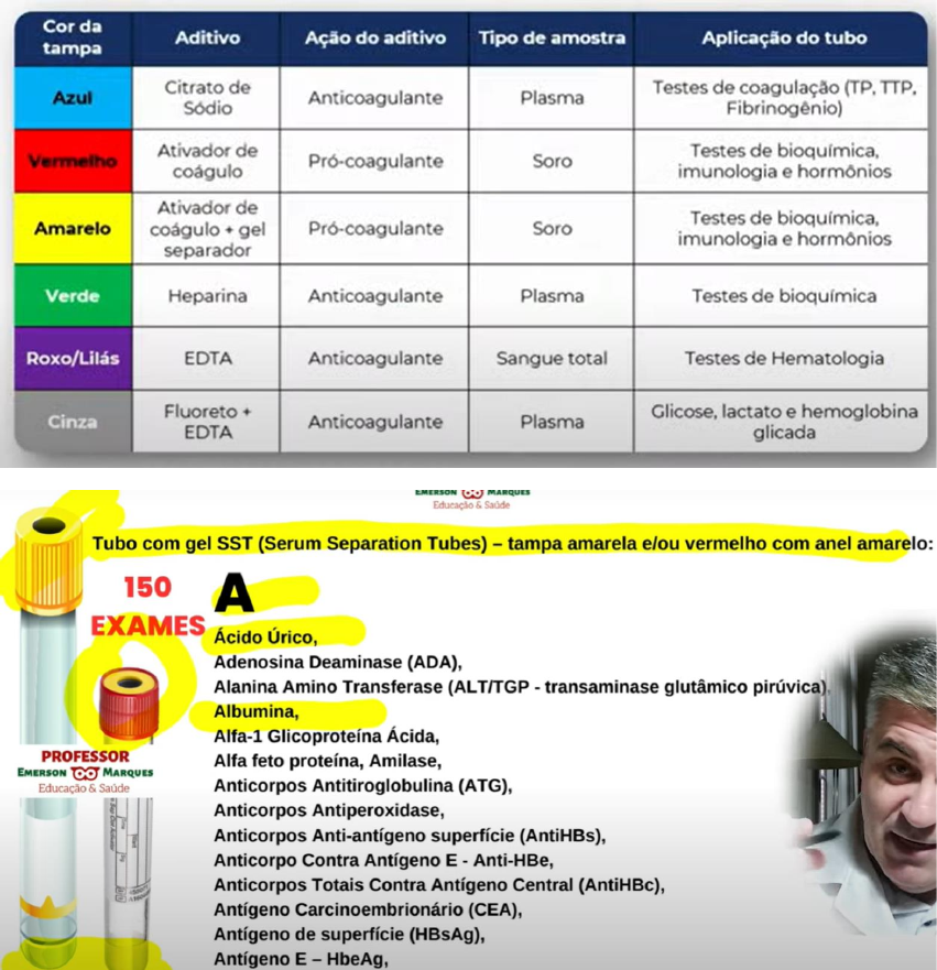 Cor da Aditivo Ação do aditivo Tipo de amostra tampa Aplicação do tubo Citrato de Azul Sódio Anticoagulante Plasma Testes de coagulação Fibrinogênio) Ativador de Vermelho Pró-coagulante Soro Testes de coágulo imunologia e Ativador de Amarelo coágulo + gel Pró-coagulante Soro Testes de bioquímica, imunologia e hormônios separador Verde Heparina Anticoagulante Plasma Testes de bioquímica EDTA Anticoagulante Sangue total Testes de Hematologia Fluoreto + Cinza Anticoagulante Plasma Glicose, lactato e hemoglobina EDTA glicada EMERSON MARQUES Educação & Saúde Tubo com gel SST (Serum Separation Tubes) - tampa amarela e/ou vermelho com anel amarelo: 150 EXAMES Ácido Úrico, Adenosina Deaminase (ADA), Alanina Amino Transferase (ALT/TGP - transaminase glutâmico pirúvica) Albumina, Alfa-1 Glicoproteína Ácida, PROFESSOR Alfa feto proteína, Amilase, EMERSON MARQUES Educação & Saúde Anticorpos Antitiroglobulina (ATG), Anticorpos Antiperoxidase, Anticorpos Anti-antígeno superfície (AntiHBs), Anticorpo Contra Antígeno E - Anti-HBe, Anticorpos Totais Contra Antígeno Central (AntiHBc), Antígeno Carcinoembrionário (CEA), Antígeno de superfície (HBsAg), Antígeno E - HbeAg,EMERSON MARQUES Educação & Saúde Tubo com gel SST (Serum Separation Tubes) - tampa amarela e/ou vermelho com anel amarelo: A Antígeno Prostático Específico Total (PSA Total), Aspartato Amino Transferase (AST/TGO - transaminase glutâmico oxalacética), Ácido Fólico, Ácido Valproico, PROFESSOR Aldolase, EMERSON MARQUES Aldosterona, Educação & Saúde Alfa1 Antitripsina (AAT), 17-Alfa Hidroxi Progesterona (17-OH-Progesterona), Amicacina, Androstenediona, Anticorpos Antimitocôndria (AMA), Anticorpos Anti-Músculo Liso (ASMA), Anti ENA, Educação & Saúde Tubo com gel SST (Serum Separation Tubes) - tampa amarela e/ou vermelho com anel amarelo: B-C Bilirrubina Totais e Frações, Beta-2 Microglobulina, Brucelose, CA (Carcinoma) 125, PROFESSOR EMERSON MARQUES CA 15.3, CA 19.9, CA 72.4, Educação & Saúde Cálcio Total, Cálcio Ceruloplasmina, Citomegalovírus (CMV), Citomegalovírus - Avidez de IgG, Cobre, Cloro (CI), Colesterol Total e Frações, Cortisol, Cortisol Após Estímulo com DDAVP (teste da desmopressina),EMERSON MARQUES Educação & Saúde Tubo com gel SST (Serum Separation Tubes) - tampa amarela e/ou vermelho com anel amarelo: C-D - Creatinina, Creatinoquinase (CK), Creatinoquinase Isoenzima MB (CKMB), Curva de Insulina, C3, C4, Carbamazepina, Estradiol (E2), PROFESSOR MERSON MARQUES Dehidropiandrosterona Educação & Saúde Detecção do DNA do Toxoplasma gondii, Detecção do DNA do Parvovírus Humano, Detecção do DNA do Vírus Epstein-Barr (líquor), Detecção de DNA do vírus Hepatite B, Detecção do DNA e Tipagem Herpes vírus I e II, Detecção do RNA (ácido ribonucleico) do Vírus Hepatite C, Detecção do DNA do Vírus Varicela-Zoster (líquor), Desidrogenase lática (LDH) Digitoxina, Digoxina. EMERSON Educação & Saúde Tubo com gel SST (Serum Separation Tubes) - tampa amarela e/ou vermelho com anel amarelo: E-F Eletroforese de proteínas e imunofixação, Eritropoietina, Esquistossomose, Fator Anti Núcleo (FAN), PROFESSOR Fator Reumatoide (FR), EMERSON MARQUES Educação & Saúde Fenitoína, Fenobarbital, Fosfatase Ácida Prostática, Fosfatase Ácida Total, Ferritina, Ferro (Fe), Fosfatase Alcalina, Fósforo.Educação & Saúde Tubo com gel SST (Serum Separation Tubes) - tampa amarela e/ou vermelho com anel amarelo: G - H Gama Glutamil Transferase (GGT), Gonadotrofina Coriônica Humana - Fração beta (Beta- HCG - hormona gonadotrofina humana), Hepatite A (Anti-HAV - Hepatitis A Virus), PROFESSOR Hepatite B (Anti-HBV), EMERSON MARQUES Educação & Saúde Hepatite C (Anti-HBC), Herpes IgG (Imunoglobulina G) e IgM (Imunoglobulina M), HIV (Vírus da Imunodeficiência Humana) - Teste Rápido, Hormônio do Crescimento (GH), Hormônio Folículo Estimulante (FSH), Hormônio Luteinizante (LH), Hormônio Tireoestimulante (TSH), Imunoglonulinas A, EGeM IgE, IgG e EMERSON MARQUES Educação & Saúde Tubo com gel SST (Serum Separation Tubes) - tampa amarela e/ou vermelho com anel amarelo: - Imunoglonulinas IgE, IgG e IGF-1 - Somatomedina C, Influenza A/H1, Influenza Sazonal, PROFESSOR Isolamento de Vírus (líquor), EMERSON MARQUES Educação & Saúde Insulina, Lipase, Lítio, Magnésio (Mg), Metotrexato, Mononucleose, NT-PróBNP, 7MARQUES Tubo com gel SST (Serum Separation Tubes) - tampa amarela e/ou vermelho com anel amarelo: P-Q-R Paratormônio, PCR (proteína C-reativa) para Parvovírus Humano, C, Potássio (K), Progesterona, PROFESSOR Prolactina (PRL), EMERSON MARQUES Educação & Saúde Proteína C Reativa - Ultra Sensível (PCR), Proteína Total (PT), Proteína Total e Frações (PTF), Quantificação do DNA do Citomegalovírus (soro), Quantificação do DNA do Vírus Hepatite B, Quantificação do DNA do Vírus Hepatite C, Quantificação do DNA do vírus Epstein-Barr, Rubéola, Rubéola Avidez de IgG (soro). Educação & Saúde Tubo com gel SST (Serum Separation Tubes) - tampa amarela e/ou vermelho com anel amarelo: S Sódio (Na), Sorologia para HTLV (vírus T-linfotrópico human) I e II, Sarampo, Sorologia para Bartonela, PROFESSOR Sorologia para Dengue, EMERSON MARQUES Sorologia para Chagas, Educação & Saúde Sorologia para Caxumba, Sorologia para HIV, Sorologia para Sífilis, Sorologia para Clamídia, Sorologia para Micoplasma pneumoniae, Sorologia para Paracoccidioidomicose 7 Tubo com gel SST (Serum Separation Tubes) - tampa amarela e/ou vermelho com T - U - V T3 Livre, T4 Livre, Testosterona Total, Testosterona Livre, Toxoplasmose, Toxocara canis IgG, Transferrina, Triglicérides (TG), PROFESSOR Troponina T - Alta sensibilidade (Tropo T), MARQUES Educação & Saúde Teofilina, Tobramicina, Toxoplasmose - Avidez de IgG (soro), Uréia, Vancomicina, VDRL (Venereal Disease Research Laboratory), Vitamina D Total, vitamina A,Tubo tampa roxa - EDTA 20 Curva de Fragilida