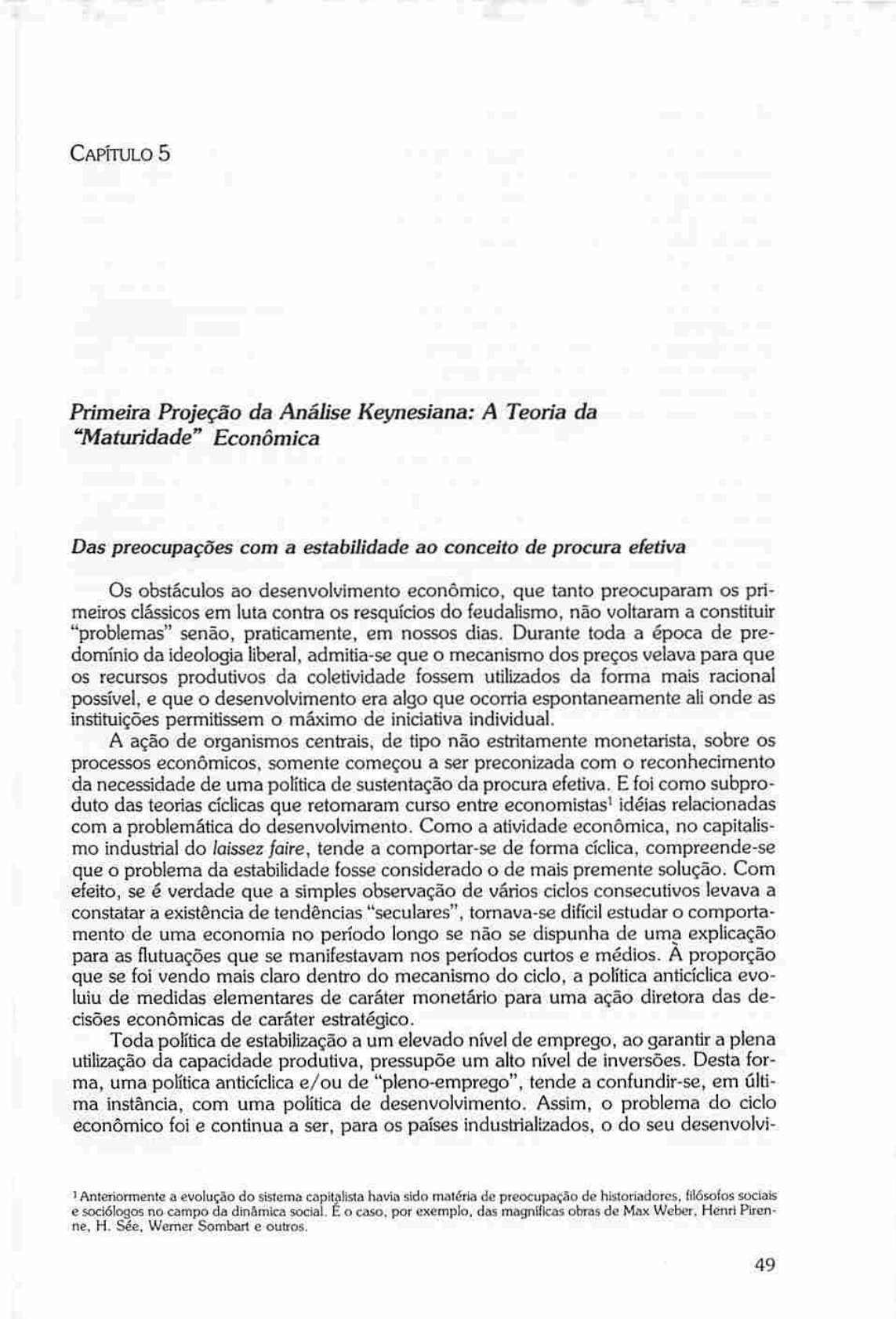 CAPÍTULO 5 Primeira Projeção da Análise Keynesiana: A Teoria da "Maturidade" Econômica Das preocupações com a estabilidade ao conceito de procura efetiva Os ao desenvolvimento econômico, que tanto preocuparam os pri- meiros clássicos em luta contra os resquícios do feudalismo, não voltaram a constituir "problemas" senão, praticamente, em nossos dias. Durante toda a época de pre- domínio da ideologia liberal, admitia-se que mecanismo dos preços velava para que os recursos produtivos da coletividade fossem utilizados da forma mais racional possível, e que desenvolvimento era algo que ocorria espontaneamente ali onde as instituições permitissem máximo de iniciativa individual. A ação de organismos centrais, de tipo não estritamente monetarista, sobre os processos econômicos, somente começou a ser preconizada com reconhecimento da necessidade de uma de sustentação da procura efetiva. E foi como subpro- duto das teorias cíclicas que retomaram curso entre idéias relacionadas com a problemática do desenvolvimento. Como a atividade econômica, no capitalis- mo industrial do laissez faire, tende a comportar-se de forma compreende-se que o problema da estabilidade fosse considerado de mais premente solução. Com efeito, se é verdade que a simples observação de vários ciclos consecutivos levava a constatar a existência de tendências tornava-se difícil estudar o comporta- mento de uma economia no período longo se não se dispunha de uma explicação para as flutuações que se manifestavam nos períodos curtos e médios. A proporção que se foi vendo mais claro dentro do mecanismo do ciclo, a política anticíclica evo- luiu de medidas elementares de caráter monetário para uma ação diretora das de- cisões econômicas de caráter estratégico. Toda política de estabilização a um elevado nível de emprego, ao garantir a plena utilização da capacidade produtiva, pressupõe um alto nível de inversões. Desta for- ma, uma política anticíclica e/ou de "pleno-emprego", tende a confundir-se, em últi- ma instância, com uma política de desenvolvimento. Assim, problema do ciclo econômico foi e continua a ser, para os países industrializados, do seu desenvolvi- Anteriormente a evolução do sistema capitalista havia sido matéria de preocupação de historiadores, filósofos sociais e sociólogos no campo da dinâmica social. É caso, por exemplo, das obras de Max Henri Piren- ne, H. Sée, Werner Sombart e 4950 A TEORIA DO DESENVOLVIMENTO NA CIÊNCIA ECONÔMICA mento. Ao evoluir de uma política de estabilização concebida estritamente como um problema monetário, para uma de coordenação e programação das inversões, a ação anticíclica foi exigindo uma formulação teórica que tende a ultrapassar a análise das causas das flutuações no nível dos preços, para alcançar uma explicação do processo geral do desenvolvimento A obra de Keynes constitui marco importante na elaboração de uma teoria expli- cativa do funcionamento dos conjuntos econômicos complexos. Como Wicksell, per- cebeu ele que elemento motor da atividade econômica estava do lado da inversão e se engenhou, como Schumpeter, em formular uma teoria da inversão. Entretanto lo- go se deu conta e nisso está a raiz da fecundidade de sua posição intelectual que aparelho de análise do equilíbrio geral, com seu postulado implícito da lei de Say, dificultava uma verdadeira compreensão do processo econômico. o melhor de seu esforço intelectual aplicou-o, então, em reformular modelo eliminando a premissa do pleno-emprego. o método de trabalho dos economistas neoclássicos de tradição marshalliana consistia em uma elaborada aplicação do princípio da oferta e da procura aos diferen- tes mercados para demonstrar como em cada um deles se formavam os preços e se tendia a uma posição de Em seguida, por analogia, se deduzia equilíbrio geral do sistema. erro dessa formulação advinha de que conforme o percebeu Keynes - quando se estudava um mercado particular admitia-se implicitamente que universo econômico era Sempre que se inicie a análise do ponto de vista do mercado global da economia isto é, em termos macroeconômicos e que se estabeleçam limites ao universo econômico, que oferta e procura são dois la- dos de uma mesma coisa e que como dois elementos independentes, bus- cando um ponto de equilíbrio, carece de base lógica. Deixando de lado a idéia de um equilíbrio espontâneo que segundo os neoclassi- cos se alcançava ao nível do pleno-emprego, Keynes se empenha em identificar os fatores básicos determinantes dos diversos níveis possíveis de emprego. Raciocinando a curto prazo ignorando, destarte, os fenômenos da acumulação de capital, do crescimento da população, do progresso técnico etc. supõe Keynes que do lado da oferta não existem problemas fundamentais. Os empresários conhecem a curva de custos de suas organizações e, de acordo com as previsões que fazem do mercado, estabelecem seu plano de Esse plano de produção não reflete necessaria- mente a capacidade produtiva do sistema; depende, basicamente, do que os em- presários supõem ser a capacidade de absorção do mercado. A certo nível de preços remuneradores, eles que o mercado não poderá absorver senão uma quanti- dade determinada de cada produto. Essa quantidade representaria nível da procura efetiva. É possível que os empresários se equivoquem e que o nível da procura efeti- va, isto é, a soma dos dispêndios em consumo e em inversão efetuados pela coletivi- dade, seja distinto daquilo que haviam antecipado. Neste caso haverá desajustamen- to entre a oferta real e a procura monetária, que afetará o nível dos preços e modifi- cará as expectativas dos empresários, que tratarão de ajustar seus planos de produção. nível de produção está, portanto, determinado pela procura efetiva. Ora, nível dessa procura é principalmente influenciado pelas oscilações no