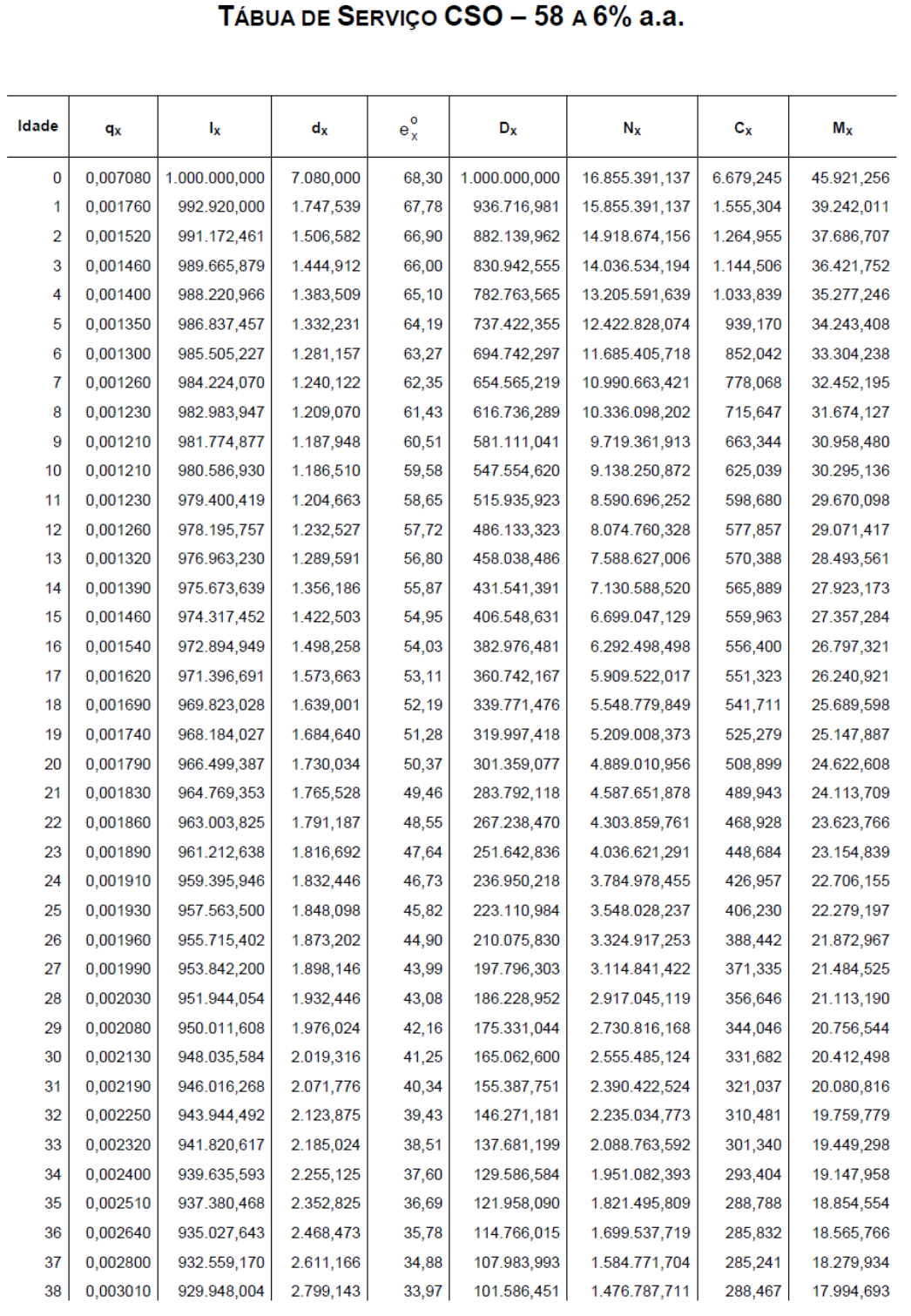 TÁBUA DE SERVIÇO CSO - 58 A 6% a.a. Idade qx dx ex Dx Nx Cx Mx 0 0,007080 1.000.000,000 7.080,000 68,30 1.000.000,000 16.855.391,137 6.679,245 45.921,256 1 0,001760 992.920,000 1.747,539 67,78 936.716,981 15.855.391,137 1.555,304 39.242,011 2 0,001520 991.172,461 1.506,582 66,90 882.139,962 14.918.674,156 1.264,955 37.686,707 3 0,001460 989.665,879 1.444,912 66,00 830.942,555 14.036.534,194 1.144,506 36.421,752 4 0,001400 988.220,966 1.383,509 65,10 782.763,565 13.205.591,639 1.033,839 35.277,246 5 0,001350 986.837,457 1.332,231 64,19 737.422,355 12.422.828,074 939,170 34.243,408 6 0,001300 985.505,227 1.281,157 63,27 694.742,297 11.685.405,718 852,042 33.304,238 7 0,001260 984.224,070 1.240,122 62,35 654.565,219 10.990.663,421 778,068 32.452,195 8 0,001230 982.983,947 1.209,070 61,43 616.736,289 10.336.098,202 715,647 31.674,127 9 0,001210 981.774,877 1.187,948 60,51 581.111,041 9.719.361,913 663,344 30.958,480 10 0,001210 980.586,930 1.186,510 59,58 547.554,620 9.138.250,872 625,039 30.295,136 11 0,001230 979.400,419 1.204,663 58,65 515.935,923 8.590.696,252 598,680 29.670,098 12 0,001260 978.195,757 1.232,527 57,72 486.133,323 8.074.760,328 577,857 29.071,417 13 0,001320 976.963,230 1.289,591 56,80 458.038,486 7.588.627,006 570,388 28.493,561 14 0,001390 975.673,639 1.356,186 55,87 431.541,391 7.130.588,520 565,889 27.923,173 15 0,001460 974.317,452 1.422,503 54,95 406.548,631 6.699.047,129 559,963 27.357,284 16 0,001540 972.894,949 1.498,258 54,03 382.976,481 6.292.498,498 556,400 26.797,321 17 0,001620 971.396,691 1.573,663 53,11 360.742,167 5.909.522,017 551,323 26.240,921 18 0,001690 969.823,028 1.639,001 52,19 339.771,476 5.548.779,849 541,711 25.689,598 19 0,001740 968.184,027 1.684,640 51,28 319.997,418 5.209.008,373 525,279 25.147,887 20 0,001790 966.499,387 1.730,034 50,37 301.359,077 4.889.010,956 508,899 24.622,608 21 0,001830 964.769,353 1.765,528 49,46 283.792,118 4.587.651,878 489,943 24.113,709 22 0,001860 963.003,825 1.791,187 48,55 267.238,470 4.303.859,761 468,928 23.623,766 23 0,001890 961.212,638 1.816,692 47,64 251.642,836 4.036.621,291 448,684 23.154,839 24 0,001910 959.395,946 1.832,446 46,73 236.950,218 3.784.978,455 426,957 22.706,155 25 0,001930 957.563,500 1.848,098 45,82 223.110,984 3.548.028,237 406,230 22.279,197 26 0,001960 955.715,402 1.873,202 44,90 210.075,830 3.324.917,253 388,442 21.872,967 27 0,001990 953.842,200 1.898,146 43,99 197.796,303 3.114.841,422 371,335 21.484,525 28 0,002030 951.944,054 1.932,446 43,08 186.228,952 2.917.045,119 356,646 21.113,190 29 0,002080 950.011,608 1.976,024 42,16 175.331,044 2.730.816,168 344,046 20.756,544 30 0,002130 948.035,584 2.019,316 41,25 165.062,600 2.555.485,124 331,682 20.412,498 31 0,002190 946.016,268 2.071,776 40,34 155.387,751 2.390.422,524 321,037 20.080,816 32 0,002250 943.944,492 2.123,875 39,43 146.271,181 2.235.034,773 310,481 19.759,779 33 0,002320 941.820,617 2.185,024 38,51 137.681,199 2.088.763,592 301,340 19.449,298 34 0,002400 939.635,593 2.255,125 37,60 129.586,584 1.951.082,393 293,404 19.147,958 35 0,002510 937.380,468 2.352,825 36,69 121.958,090 1.821.495,809 288,788 18.854,554 36 0,002640 935.027,643 2.468,473 35,78 114.766,015 1.699.537,719 285,832 18.565,766 37 0,002800 932.559,170 2.611,166 34,88 107.983,993 1.584.771,704 285,241 18.279,934 38 0,003010 929.948,004 2.799,143 33,97 101.586,451 1.476.787,711 288,467 17.994,693Idade qx Ix dx Dx Nx Cx Mx 39 0,003250 927.148,861 3.013,234 33,07 95.547,807 1.375.201,261 292,953 17.706,226 40 0,003530 924.135,627 3.262,199 32,18 89.846,487 1.279.653,454 299,206 17.413,273 41 0,003840 920.873,428 3.536,154 31,29 84.461,631 1.189.806,966 305,974 17.114,067 42 0,004170 917.337,274 3.825,296 30,41 79.374,810 1.105.345,335 312,258 16.808,093 43 0,004530 913.511,978 4.138,209 29,54 74.569,639 1.025.970,525 318,680 16.495,836 44 0,004920 909.373,768 4.474,119 28,67 70.030,036 951.400,886 325,045 16.177,156 45 0,005350 904.899,650 4.841,213 27,81 65.741,027 881.370,850 331,806 15.852,111 46 0,005830 900.058,436 5.247,341 26,95 61.688,030 815.629,823 339,284 15.520,305 47 0,006360 894.811,096 5.690,999 26,11 57.856,971 753.941,792 347,142 15.181,021 48 0,006950 889.120,097 6.179,385 25,27 54.234,906 696.084,821 355,597 14.833,879 49 0,007600 882.940,712 6.710,349 24,45 50.809,409 641.849,915 364,294 14.478,282 50 0,008320 876.230,363 7.290,237 23,63 47.569,111 591.040,506 373,373 14.113,988 51 0,009110 868.940,126 7.916,045 22,82 44.503,147 543.471,395 382,475 13.740,615 52 0,009960 861.024,082 8.575,800 22,03 41.601,626 498.968,248 390,898 13.358,140 53 0,010890 852.448,282 9.283,162 21,25 38.855,919 457.366,622 399,190 12.967,242 54 0,011900 843.165,120 10.033,665 20,47 36.257,337 418.510,703 407,040 12.568,052 55 0,013000 833.131,455 10.830,709 19,71 33.797,995 382.253,366 414,504 12.161,012 56 0,014210 822.300,746 11.684,894 18,97 31.470,398 348.455,370 421,881 11.746,509 57 0,015540 810.615,853 12.596,970 18,23 29.267,173 316.984,973 429,068 11.324,627 58 0,017000 798.018,882 13.566,321 17,51 27.181,473 287.717,800 435,929 10.895,559 59 0,018590 784.452,561 14.582,973 16,81 25.206,969 260.536,327 442,073 10.459,630 60 0,020340 769.869,588 15.659,147 16,12 23.338,087 235.329,358 447,827 10.017,557 61 0,022240 754.210,441 16.773,640 15,44 21.569,236 211.991,271 452,547 9.569,730 62 0,024310 737.436,801 17.927,089 14,78 19.895,789 190.422,035 456,289 9.117,183 63 0,026570 719.509,712 19.117,373 14,14 18.313,323 170.526,247 459,042 8.660,894 64 0,029040 700.392,339 20.339,394 13,51 16.817,677 152.212,924 460,741 8.201,851 65 0,031750 680.052,945 21.591,681 12,90 15.404,992 135.395,247 461,423 7.741,110 66 0,034740 658.461,264 22.874,944 12,31 14.071,588 119.990,255 461,176 7.279,687 67 0,038040 635.586,320 24.177,704 11,73 12.813,907 105.918,666 459,850 6.818,511 68 0,041680 611.408,617 25.483,511 11,17 11.628,742 93.104,759 457,251 6.358,661 69 0,045610 585.925,105 26.724,044 10,64 10.513,260 81.476,018 452,368 5.901,410 70 0,049790 559.201,061 