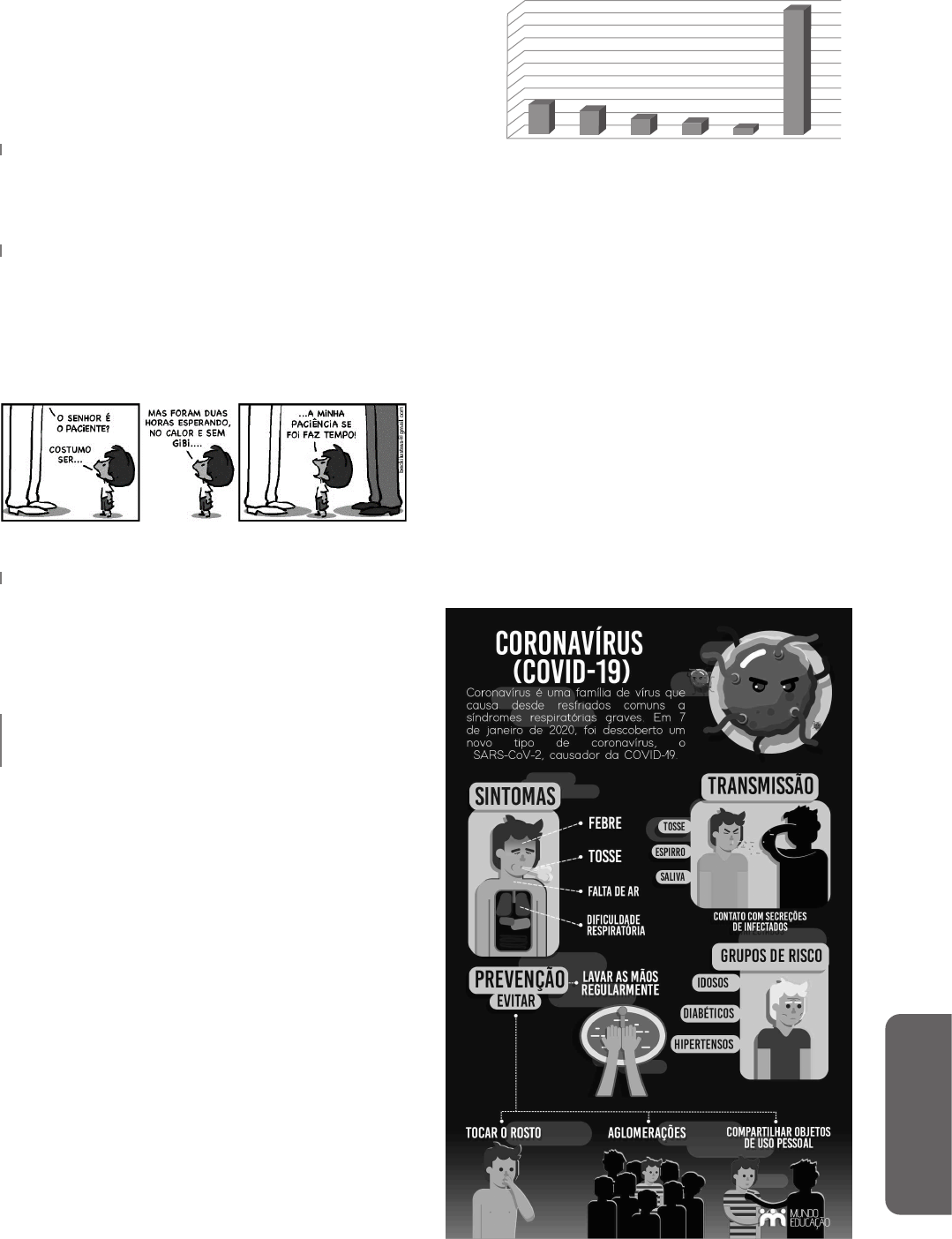 LÍ N G U A P O RT U G U ES A 65 Discriminar/descriminar z Ela se sentiu discriminada por não poder entrar naquele clube. (diferenciar, segregar) z Em muitos países se discute sobre descrimi- nar o uso de algumas drogas. (descriminalizar, inocentar) REFERÊNCIA Fonte: https://www.normaculta.com.br/palavras- -par onimas/. Acessado em 17/10/2020. POLISSEMIA (PLURISSIGNIFICAÇÃO) Multiplicidade de sentidos encontradas em algu- mas palavras, dependendo do contexto. As palavras polissêmicas guardam uma relação de sentido entre si, diferenciando-as das palavras homônimas. A polis- semia é encontrada no exemplo a seguir: Fonte: https://bit.ly/3jynvgs. Acessado em: 17/10/2020. HIPÔNIMO E HIPERÔNIMO Relação estabelecida entre termos que guardam relação de sentido entre si e mantém uma ordem gra- dativa. Exemplo: Hiperônimo – veículo; Hipônimo – carro, automóvel, moto, bicicleta, ônibus... EFEITOS DE SENTIDO DECORRENTES DO USO DE RECURSOS VERBAIS E NÃO VERBAIS EM GÊNEROS DIFERENTES: GRÁFICOS E INFOGRÁFICOS A representação de sentido por meio de tabelas e gráficos está sempre presente em nosso cotidiano, principalmente nos meios de comunicação, ainda mais com as redes sociais. Isso está ligado a facilidade com que podemos analisar e interpretar as informa- ções que estão organizadas de forma clara e objetiva e, além disso, não exigir o uso de cálculos complexos para a sua análise. A análise de gráficos auxilia na resolução de questões não apenas de português, por isso, requer atenção. Gráfico: componentes de um gráfico Título: na maioria dos casos possuem um título que indica a que informação ele se refere. Fonte: a maioria dos gráficos contém uma fonte, ou seja, de onde as informações foram, com o ano de publicação. Números: o mais importante, pois é deles que pre- cisamos para comparar as informações dadas pelos gráficos. Usados para representar quantidade ou tem- po (mês, ano, período). Legendas: ajuda na leitura das informações apre- sentadas. Na maioria dos casos, o uso de cores destaca diferentes informações. CIDADES CIDADES MAIS POPULOSAS DO BRASIL N Ú M ER O S D E H A BI TA N TE S Franceses Espanhóis Outros Total Alemães 100% 90% 80% 70% 60% 50% 40% 30% 20% 10% 0% Inglêses Fonte: googleimages.com. Acesso em: 10/01/2021. Infográficos Os infográficos são uma forma moderna de apre- sentar o sentido. Essa palavra une os termos info (informação) e gráfico (desenho, imagem, representação visual), ou seja, um desenho ou imagem que, com o apoio de um texto, informa sobre um assunto que não seria muito bem compreendido somente com um texto, auxilian- do a compreensão do leitor. Para interpretar os dados informativos em um infográfico, é preciso boa leitura e esta requer atenção aos detalhes. As representações neste formato aliam ao texto uma série de atrativos visuais, cabendo ao leitor ser extremamente observador. Ter atenção ao título, ao tema e a fonte das informações é vital para uma boa análise e interpretação. Fonte: https://mundoeducacao.uol.com.br/doencas/covid-19.htm. 66 EXERCÍCIOS COMENTADOS 1. (FUNDATEC – 2019) Assinale a alternativa na qual não haja o emprego de linguagem figurada: a) “ela estava por dentro de tudo”. b) “logo se viu nadando em oportunidades”. c) “a fez embarcar ‘numa viagem bonita e misteriosa’”. d) “ganhava uma quantia realmente impressionante de dinheiro”. e) “O mercado ficou saturado”. A linguagem figurada é também chamada lingua- gem conotativa, e a única alternativa em que encon- tramos o oposto, ou seja, linguagem denotativa, é na alternativa D. Resposta: Letra D. 2. (FUMARC – 2018) As palavras estão utilizadas em sentido conotativo em: a) “Não lhe encostei a faca no peito cobrando algo.” b) “Parecia pronto para morrer, já que sempre estivera pronto para amar.” c) “Se eu fosse rei ou prefeito teria mandado erguer-lhe uma estátua.” d) “Sim, porque sobre o amor há várias frases inquietan- tes por aí...” “Não lhe encostei a faca no peito cobrando algo.” - temos um sentido figurado, “faca no peito” dá sen- tido de cobrança. Resposta: Letra A. 3. (PREFEITURA DE FORTALEZA-CE – 2016) Conside- rando-se o conteúdo semântico dos trechos “o dia nasce da noite escura” (linha 02) e “a esperança de encontrar as saídas e soluções fáceis” (linha 05), as palavras destacadas em cada trecho estabelecem, respectivamente, entre si a relação de: a) sinonímia e antonímia. b) sinonímia e paronímia. c) antonímia e sinonímia. d) antonímia e paronímia. As palavras “dia”, “noite”, “saídas” e “soluções” apresentam, respectivamente, uma relação de opo- sição (antonímia) e uma relação de semelhança (sinonímia). Resposta: Letra C. 4. (FUNRIO – 2014) Para se compreender a mensagem, é preciso reconhe- cer que a placa retratada combina de maneira curiosa: a) denotação e conotação. b) norma culta e norma popular. c) língua padrão e língua viciosa. d) sinonímia e antonímia. e) homonímia e polissemia. A placa alerta aos fumantes sobre o risco de incên- dio, provocado por bitucas de cigarro, ou seja, utiliza-se do sentido denotativo e conotativo da expressão “segure as pontas”, causando o efeito “curioso” na placa. Resposta: Letra A. REFERÊNCIAS ANTUNES, Irandé. Lutar com palavras: coesão e coerência. São Paulo: parábola, 2005. CAVALCANTE, Mônica Magalhães. Os sentidos do texto. São Paulo: contexto, 2013. KLEIMAN, Angela. Texto e leitor: aspectos cogniti- vos da leitura. 16.ed. Campinas: Pontes, 2016. KOCH , Ingedore Grunfed Villaça; EL IAS, Vanda Maria . Ler e compreender: os sentidos do texto. 3. ed . São Paulo: Contexto, 2015. SACCONI, L.A. Nossa Gramática Completa Sac- coni – Teoria e Prática. 30ª. ed. São Paulo: Nova Geração, 2010. SCHLITTLER, J.M.M. Recursos de Estilo em Reda- ção Profissional. Campinas/SP: Servanda, 2008. REDAÇÃ