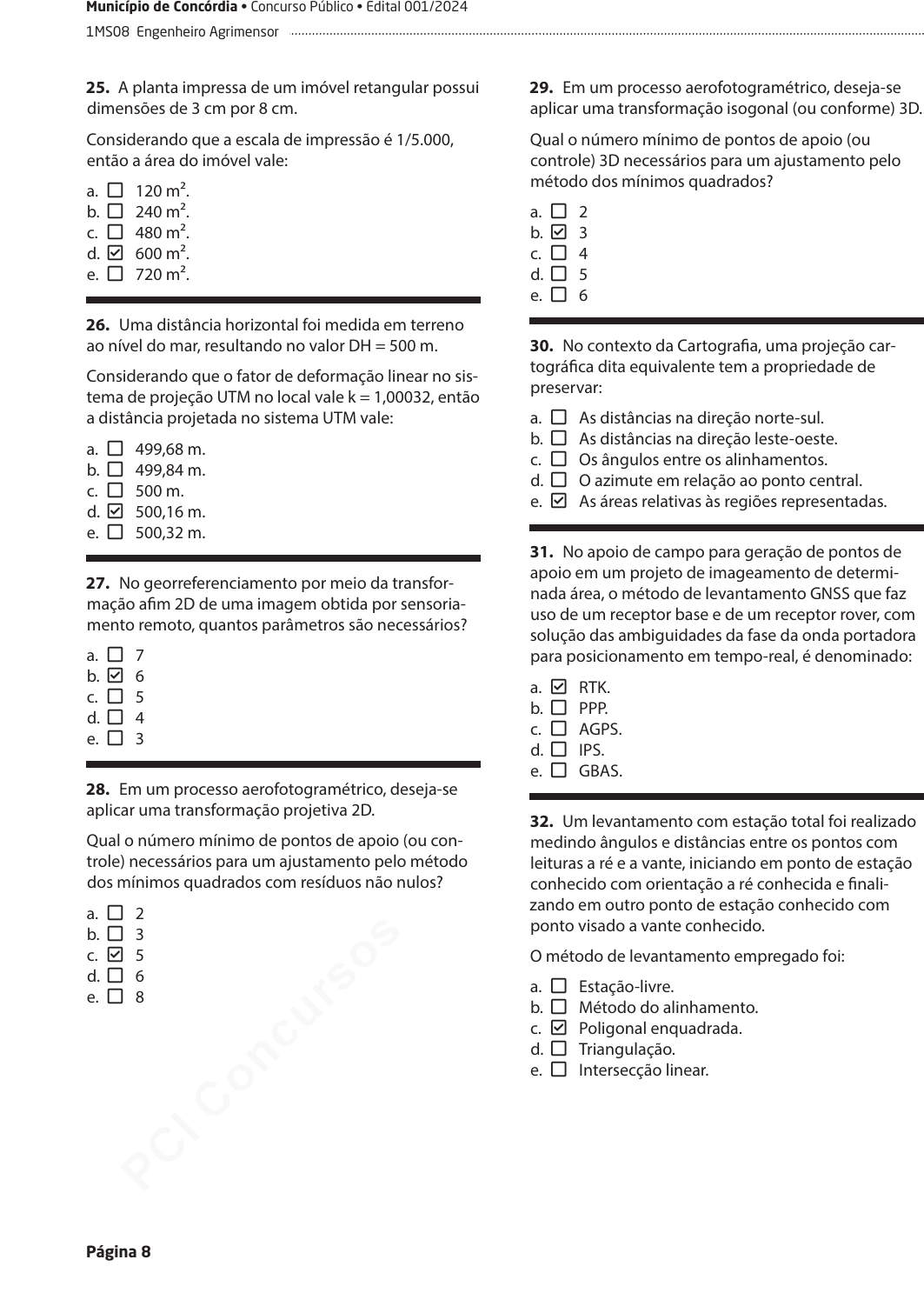 pcimarkpci MDAwMDowMDAwOjAwMDA6MDAwMDowMDAwOmZmZmY6YmZiOTphZTFk:U3VuLCAxNiBGZWIgMjAyNSAyMTo1MDoxOCAtMDMwMA== www.pciconcursos.com.br Página 8 Município de Concórdia • Concurso Público • Edital 001/2024 1MS08 Engenheiro Agrimensor 25. A planta impressa de um imóvel retangular possui dimensões de 3 cm por 8 cm. Considerando que a escala de impressão é 1/5.000, então a área do imóvel vale: a. SQUARE 120 m². b. SQUARE 240 m². c. SQUARE 480 m². d. Check-square 600 m². e. SQUARE 720 m². 26. Uma distância horizontal foi medida em terreno ao nível do mar, resultando no valor DH = 500 m. Considerando que o fator de deformação linear no sis- tema de projeção UTM no local vale k = 1,00032, então a distância projetada no sistema UTM vale: a. SQUARE 499,68 m. b. SQUARE 499,84 m. c. SQUARE 500 m. d. Check-square 500,16 m. e. SQUARE 500,32 m. 27. No georreferenciamento por meio da transfor- mação afim 2D de uma imagem obtida por sensoria- mento remoto, quantos parâmetros são necessários? a. SQUARE 7 b. Check-square 6 c. SQUARE 5 d. SQUARE 4 e. SQUARE 3 28. Em um processo aerofotogramétrico, deseja-se aplicar uma transformação projetiva 2D. Qual o número mínimo de pontos de apoio (ou con- trole) necessários para um ajustamento pelo método dos mínimos quadrados com resíduos não nulos? a. SQUARE 2 b. SQUARE 3 c. Check-square 5 d. SQUARE 6 e. SQUARE 8 29. Em um processo aerofotogramétrico, deseja-se aplicar uma transformação isogonal (ou conforme) 3D. Qual o número mínimo de pontos de apoio (ou controle) 3D necessários para um ajustamento pelo método dos mínimos quadrados? a. SQUARE 2 b. Check-square 3 c. SQUARE 4 d. SQUARE 5 e. SQUARE 6 30. No contexto da Cartografia, uma projeção car- tográfica dita equivalente tem a propriedade de preservar: a. SQUARE As distâncias na direção norte-sul. b. SQUARE As distâncias na direção leste-oeste. c. SQUARE Os ângulos entre os alinhamentos. d. SQUARE O azimute em relação ao ponto central. e. Check-square As áreas relativas às regiões representadas. 31. No apoio de campo para geração de pontos de apoio em um projeto de imageamento de determi- nada área, o método de levantamento GNSS que faz uso de um receptor base e de um receptor rover, com solução das ambiguidades da fase da onda portadora para posicionamento em tempo-real, é denominado: a. Check-square RTK. b. SQUARE PPP. c. SQUARE AGPS. d. SQUARE IPS. e. SQUARE GBAS. 32. Um levantamento com estação total foi realizado medindo ângulos e distâncias entre os pontos com leituras a ré e a vante, iniciando em ponto de estação conhecido com orientação a ré conhecida e finali- zando em outro ponto de estação conhecido com ponto visado a vante conhecido. O método de levantamento empregado foi: a. SQUARE Estação-livre. b. SQUARE Método do alinhamento. c. Check-square Poligonal enquadrada. d. SQUARE Triangulação. e. SQUARE Intersecção linear. pcimarkpci MDAwMDowMDAwOjAwMDA6MDAwMDowMDAwOmZmZmY6YmZiOTphZTFk:U3VuLCAxNiBGZWIgMjAyNSAyMTo1MDoxOCAtMDMwMA== www.pciconcursos.com.br Página 9 Município de Concórdia • Concurso Público • Edital 001/2024 1MS08 Engenheiro Agrimensor Coluna em Branco. (rascunho) 33. Um levantamento com estação total foi realizado medindo direções angulares e distâncias a partir do ponto de estação para três pontos de apoio conhe- cidos, visando assim determinar as coordenadas do ponto de estação. O método de levantamento empregado foi: a. SQUARE Poligonal fechada. b. SQUARE Trilateração. c. SQUARE Intersecção angular. d. SQUARE Irradiação. e. Check-square Estação-livre. 34. No contexto dos Sistemas de Informação Geo- gráfica (SIG), um software nacional gratuito e desen- volvido pelo INPE, cujo desenvolvimento contou com a colaboração de instituições como a EMBRAPA e a PETROBRAS, é o: a. Check-square SPRING. b. SQUARE OCAD. c. SQUARE QGIS. d. SQUARE gvSIG. e. SQUARE uDig. 35. No contexto do Geoprocessamento, o formato de arquivo compactado, utilizado para exibir dados geoespaciais diretamente no Google Earth, é denomi- nado pelo acrônimo: a. SQUARE DWG. b. SQUARE DXF. c. SQUARE WMS. d. SQUARE SQL. e. Check-square KMZ.