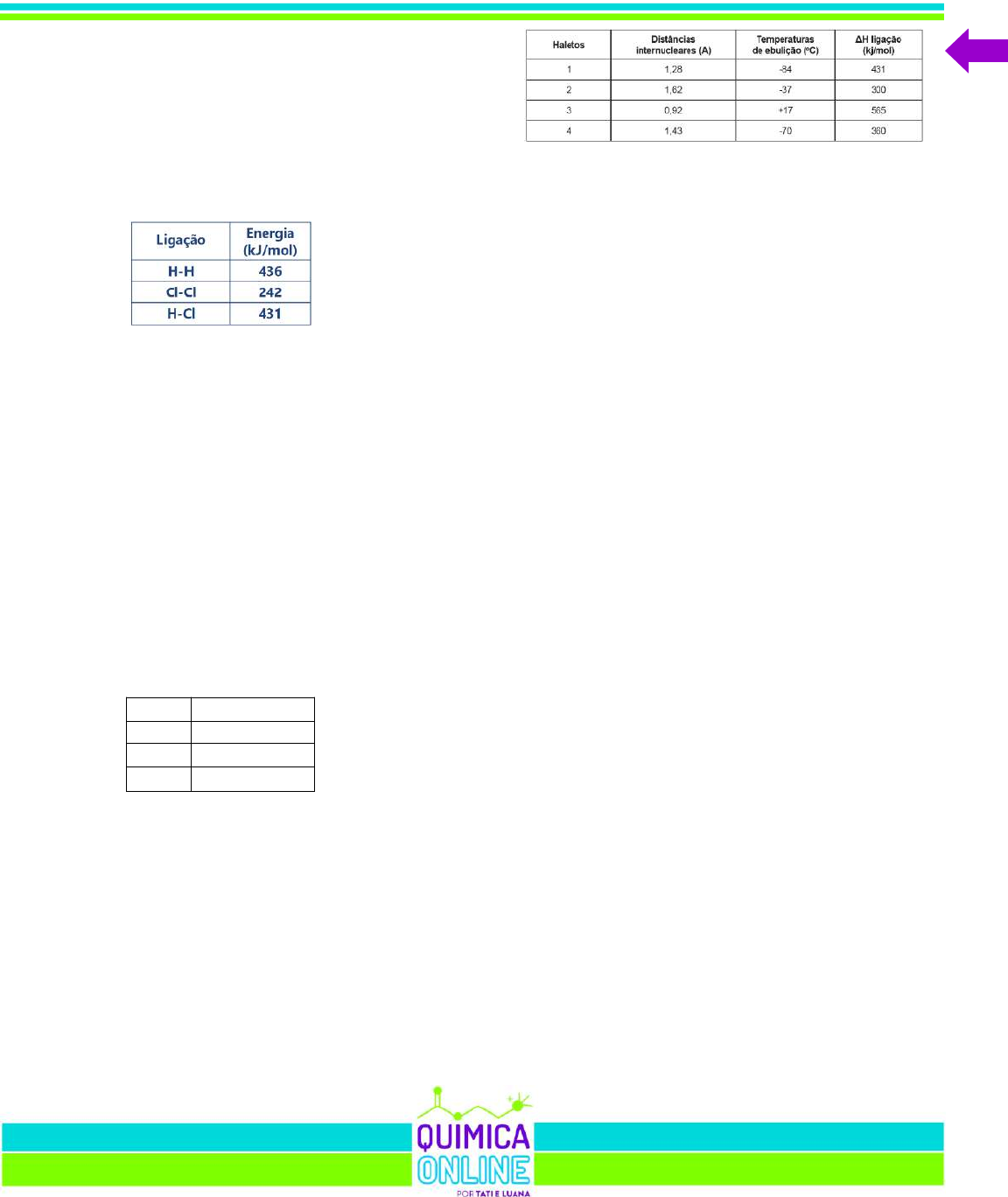 3000 QUESTÕES DE QUÍMICA 359 d) 600 kJ. e) 2 600 kJ. 74 - (PUC SP) Dados os valores de energia de ligação em kJ/mol e a reação a seguir, calcule o ΔH desse processo. H2(g) + Cl2(g) 2 HCl(g) a) – 184 kJ/mol. b) + 184 kJ/mol. c) + 247 kJ/mol. d) – 247 kJ/mol. 75 - (UFGD MS) A amônia é produzida a partir de nitrogênio e hidrogênio usando-se o processo Harber. A equação que representa a reação química é: N2(g) + 3 H2(g) 2 NH3(g) Usando as energias de ligação dadas na tabela a seguir, marque a alternativa que apresenta a variação de energia da reação de formação da amônia. a) 2249 H kJ = + b) 2346 H kJ = − c) 97 H kJ = − d) 97 H kJ = + e) 2346 H kJ = + 76 - (FCM MG) Este quadro ilustra as distâncias internucleares, as temperaturas de ebulição e as energias de ligação de quatro haletos de hidrogênio: Os haletos 1, 2, 3 e 4 são, respectivamente: a) HCl, HI, HF e HBr b) HF, HCl, HBr e HI c) HI, HBr, HCl e HF d) HBr, HF, HI e HCl 77 - (UDESC SC) Considerando as moléculas de CO e CO2 e sabendo que os comprimentos de ligação C-O em uma dessas moléculas é 121 pm (onde pm = 10–12 m) e na outra 143 pm, assinale a alternativa correta. a) A ligação na molécula de CO2 é mais forte que na molécula de CO, pois a ligação dupla é mais forte que a ligação tripla. b) A ligação na molécula de CO é iônica, enquanto a ligação na molécula de CO2 é covalente. c) A ligação na molécula de CO é mais longa que na molécula de CO2, devido à ausência de ligações múltiplas no CO. d) A ligação na molécula de CO é mais curta que na molécula de CO2, pois a molécula de CO apresenta uma ligação tripla e corresponde ao comprimento de 121 pm. O CO2 apresenta ligação dupla entre o átomo de carbono e os átomos de oxigênio, e essa ligação corresponde ao comprimento de 143 pm. e) A ligação no CO2 é mais curta que no CO, pois a ligação dupla, presente na estrutura do CO2, é mais curta e forte que a ligação tripla presente no CO. 78 - (ACAFE SC) Considere a reação entre o eteno gasoso e cloro gasoso produzindo 1,2-dicloroetano no estado gasoso. Assinale a alternativa que contém o valor da energia liberada (em módulo) na produção de 297g de 1,2-dicloroetano gasoso. Dados: energias de ligação C = C: 612 kJ/mol; Cl – Cl: 243 kJ/mol; C – C: 347 kJ/mol; C – Cl: 331 kJ/mol. C: 12g/mol; Cl: 35,5g/mol; H: 1,0 g/mol. a) 177 Kj → → )H( 391HN 436HH 941NN )mol/kJ(EnergiaLigação − − 3000 QUESTÕES DE QUÍMICA 360 b) 154 kJ c) 462 kJ d) 531 kJ 79 - (UEM PR) Dadas as seguintes energias de ligação, assinale a(s) alternativa(s) correta(s). 01. Energia de ligação é a quantidade de energia requerida para separar 1 mol de ligações covalentes entre átomos no estado gasoso. 02. A combustão completa de um mol de metano (CH4) libera 808kJ de energia. 04. A entalpia da reação CH4(g) + Cl2(g) HCl(g) + CH3Cl(g) é de –104 kJ/mol. 08. A combustão completa de 138g de etanol absorve 1.355,5kJ. 16. Todas as reações químicas espontâneas ocorrem com liberação de calor. 80 - (FUVEST SP) Sob certas condições, tanto o gás flúor quanto o gás cloro podem reagir com hidrogênio gasoso, formando, respectivamente, os haletos de hidrogênio HF e , gasosos. Pode-se estimar a variação de entalpia de cada uma dessas reações, utilizando-se dados de energia de ligação. A tabela apresenta os valores de energia de ligação dos reagentes e produtos dessas reações a 25 ºC e 1 atm. Com base nesses dados, um estudante calculou a variação de entalpia de cada uma das reações e concluiu, corretamente, que, nas condições empregadas, a) a formação de HF (g) é a reação que libera mais energia. b) ambas as reações são endotérmicas. c) apenas a formação de (g) é endotérmica. d) ambas as reações têm o mesmo valor de H. e) apenas a formação de (g) é exotérmica. 81 - (UFJF MG) O hidrogênio cada vez mais tem ganhado atenção na produção de energia. Recentemente, a empresa britânica Intelligent Energy desenvolveu uma tecnologia que pode fazer a bateria de um smartphone durar até uma semana. Nesse protótipo ocorre a reação do oxigênio atmosférico com o hidrogênio armazenado produzindo água e energia. a) Escreva a equação química da reação descrita acima e calcule a sua variação de entalpia a partir dos dados abaixo. b) Um dos grandes problemas para o uso do gás hidrogênio como combustível é o seu armazenamento. Calcule o volume ocupado por 20g de hidrogênio nas CNTP. c) Atualmente, cerca de 96 % do gás hidrogênio é obtido a partir de combustíveis fósseis, como descrito nas reações abaixo. Essa característica é considerada uma desvantagem para o uso do hidrogênio. Justifique essa afirmativa. Carvão: C(s) + H2O(l) CO(g) + H2(g) Gás natural: CH4(g) + H2O(l) CO(g) + 3 H2(g) 82 - (PUC SP) A reação de hidrogenação do etileno ocorre com aquecimento, na presença de níquel em pó como catalisador. A equação termoquímica que representa o processo é C2H4(g) + H2(g) C2H6(g) = –137 kJ.mol–1 Dado: A partir dessas informações, pode-se deduzir que a energia de ligação da dupla ligação que ocorre entre os átomos de C no etileno é igual a a) 186 kJ.mol–1. b) 599 kJ.mol–1. c) 692 kJ.mol–1. d) 736 kJ.mol–1. → HC )H( )H( HC HC → → → H 3000 QUESTÕES DE QUÍMICA 361 83 - (Faculdade São Francisco de Barreiras BA) Os valores das energias de ligação entre os átomos que formam as substâncias químicas, como os apresentados na tabela, podem ser utilizados para estimar o valor da variação de entalpia, , de uma reação química na fase gasosa. Considerando as energias envolvidas na ruptura e na formação de novas ligações químicas, pode-se calcular a variação da entalpia da reação de combustão total do metano, representada pela equação química. CH4(g) + 2O2(g) CO2(g) + 2H2O(g) Com base nessas informações, associadas aos conhecimentos da termoquímica, 
